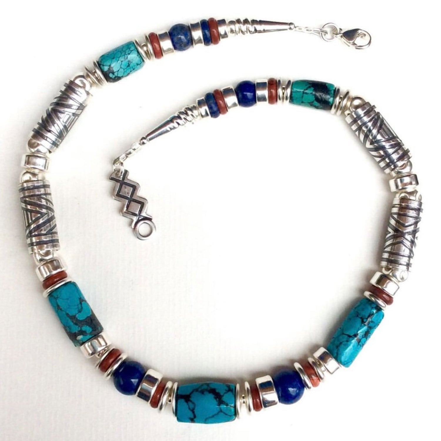 Etched Silver, Rhodolite and Blue Carnelian Necklace