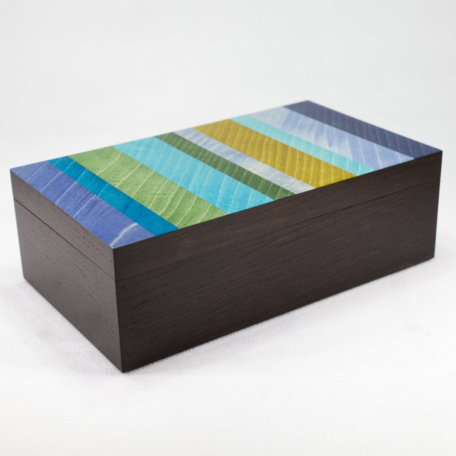 Kevin utilizes an exclusive process to hand-dye wood veneer and then uses the coloured veneer to create unique and beautiful boxes and small pieces of furniture.