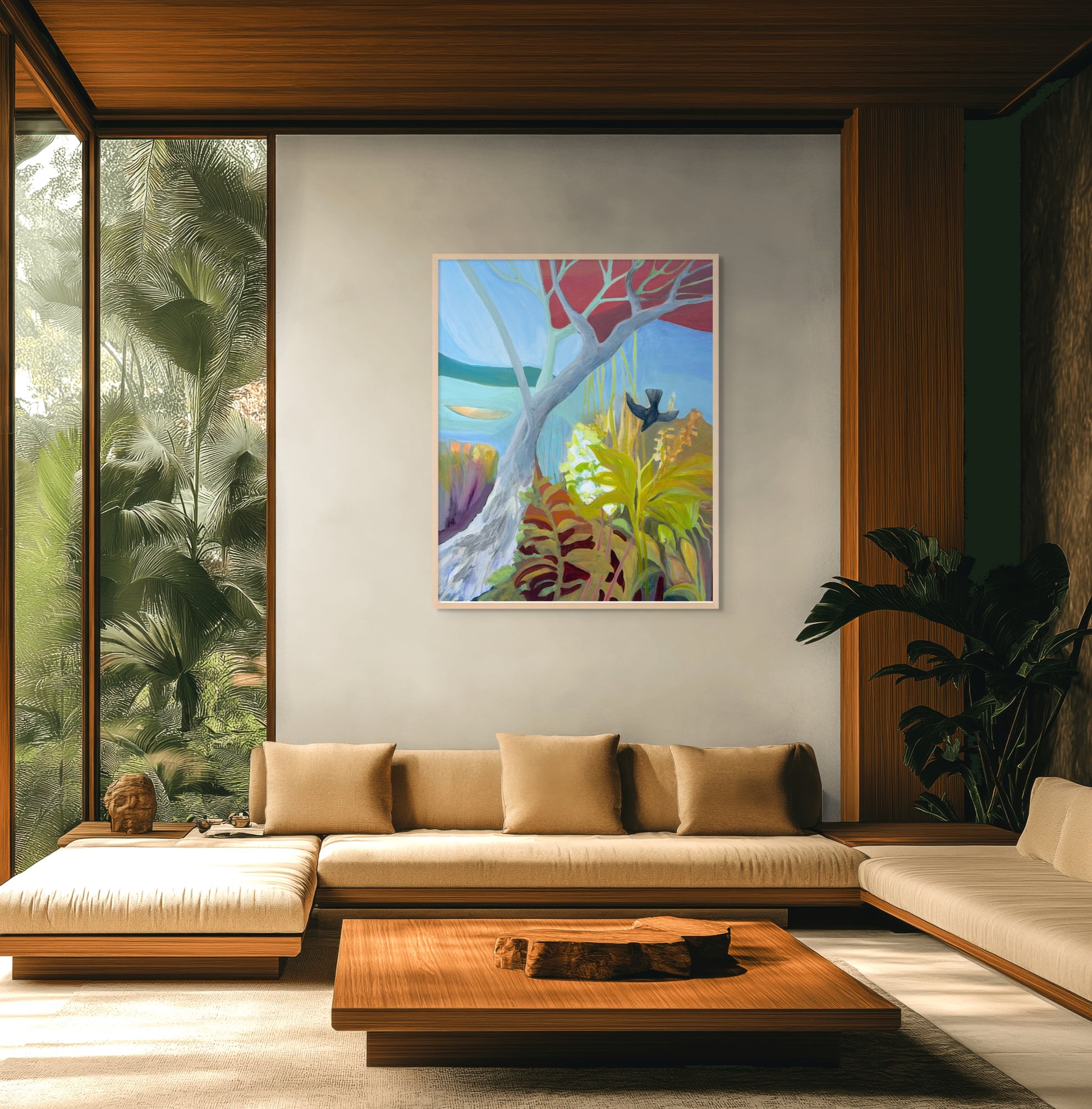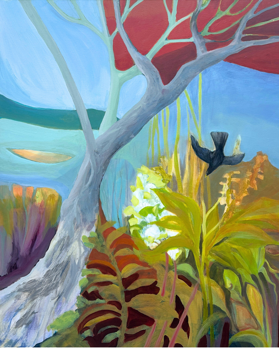 Inspired by blackbirds seen and heard along the Helford Estuary near Falmouth, Cornwall, this painting draws on the lush gardens that line valleys descending toward the water’s edge. The bird is rendered almost as a Pentecostal dove from religious iconography—falling from the sky, descending to the earth carrying its message.