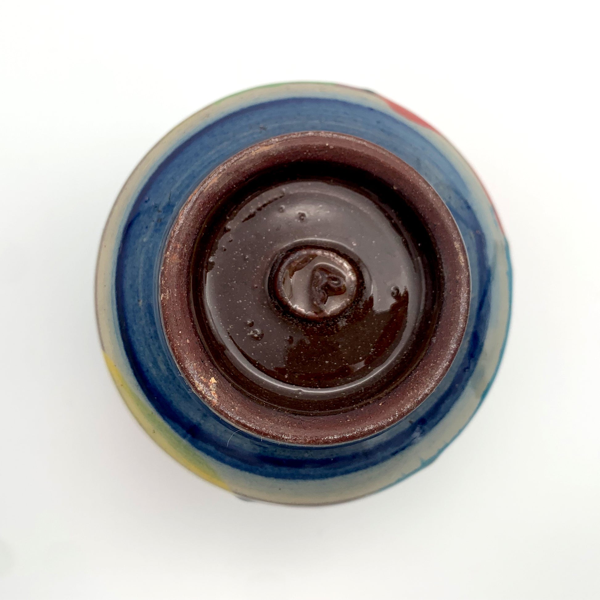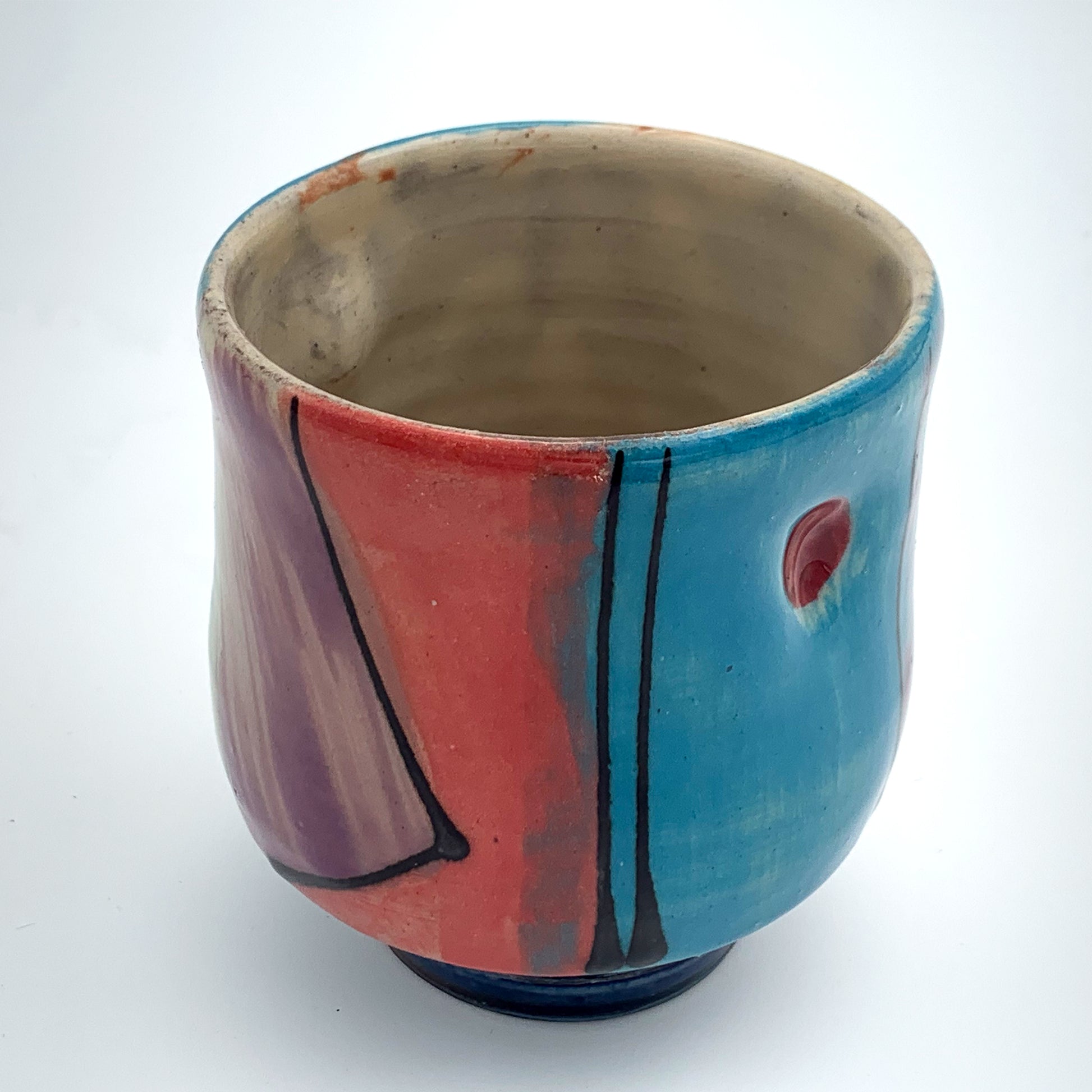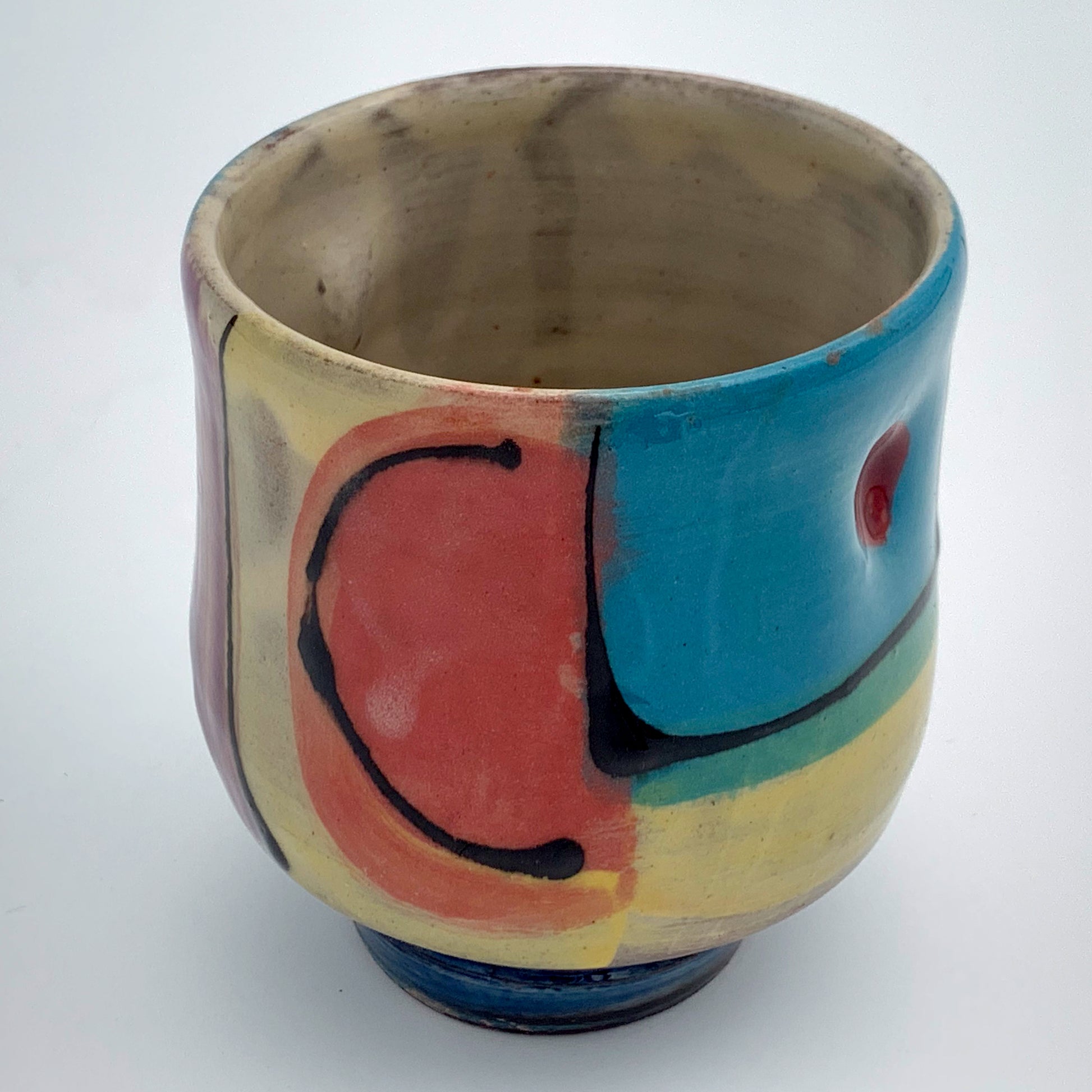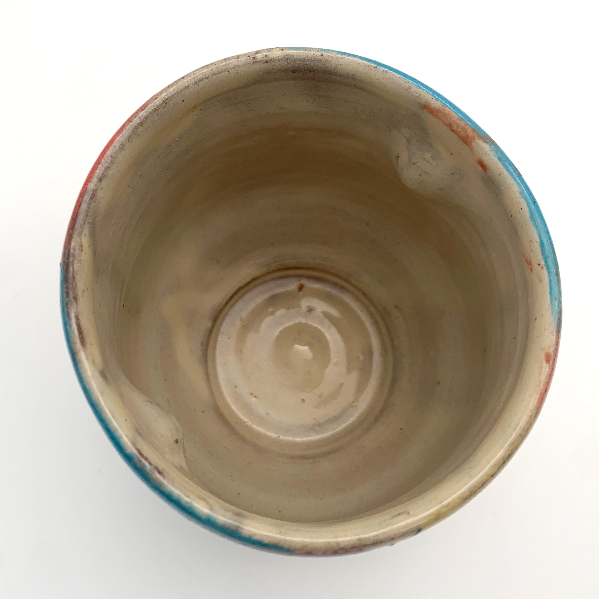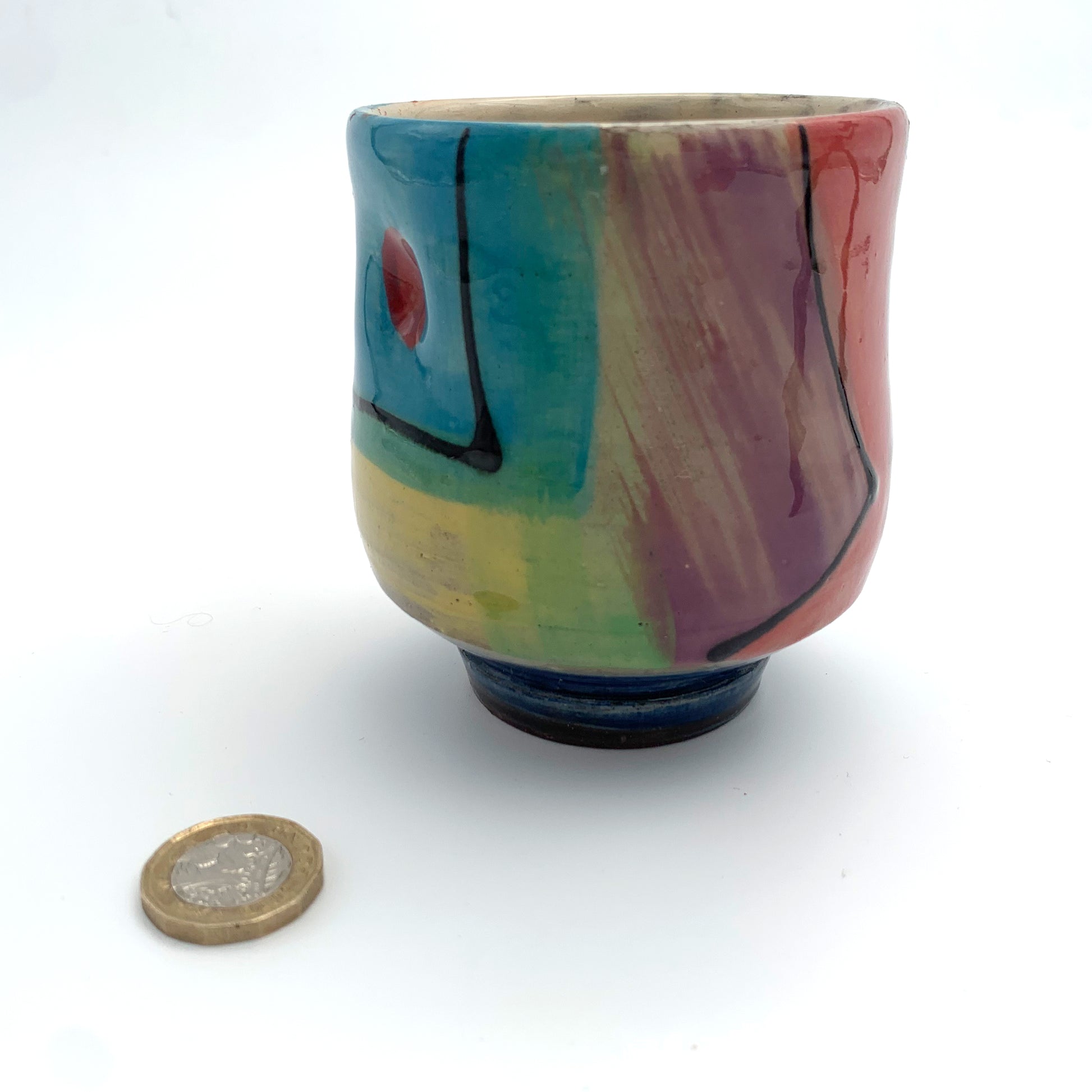 This earthenware tea bowl by Richard Wilson is wheel-thrown and decorated with wonderful brightly coloured slips. The gorgeous gestural marks using different brushes create an abstract design, inspired by the ebb and flow of the sea at West Bay.