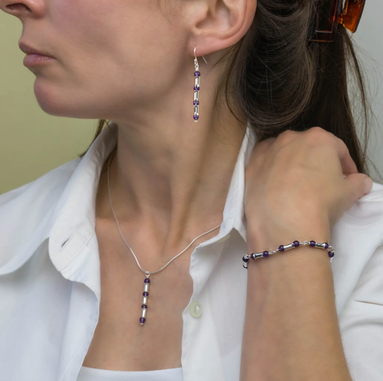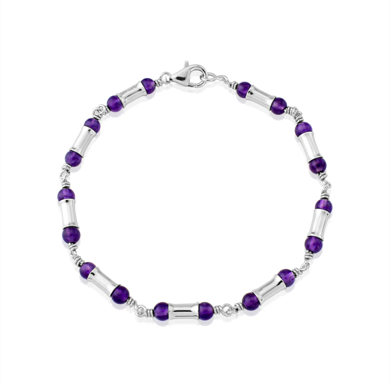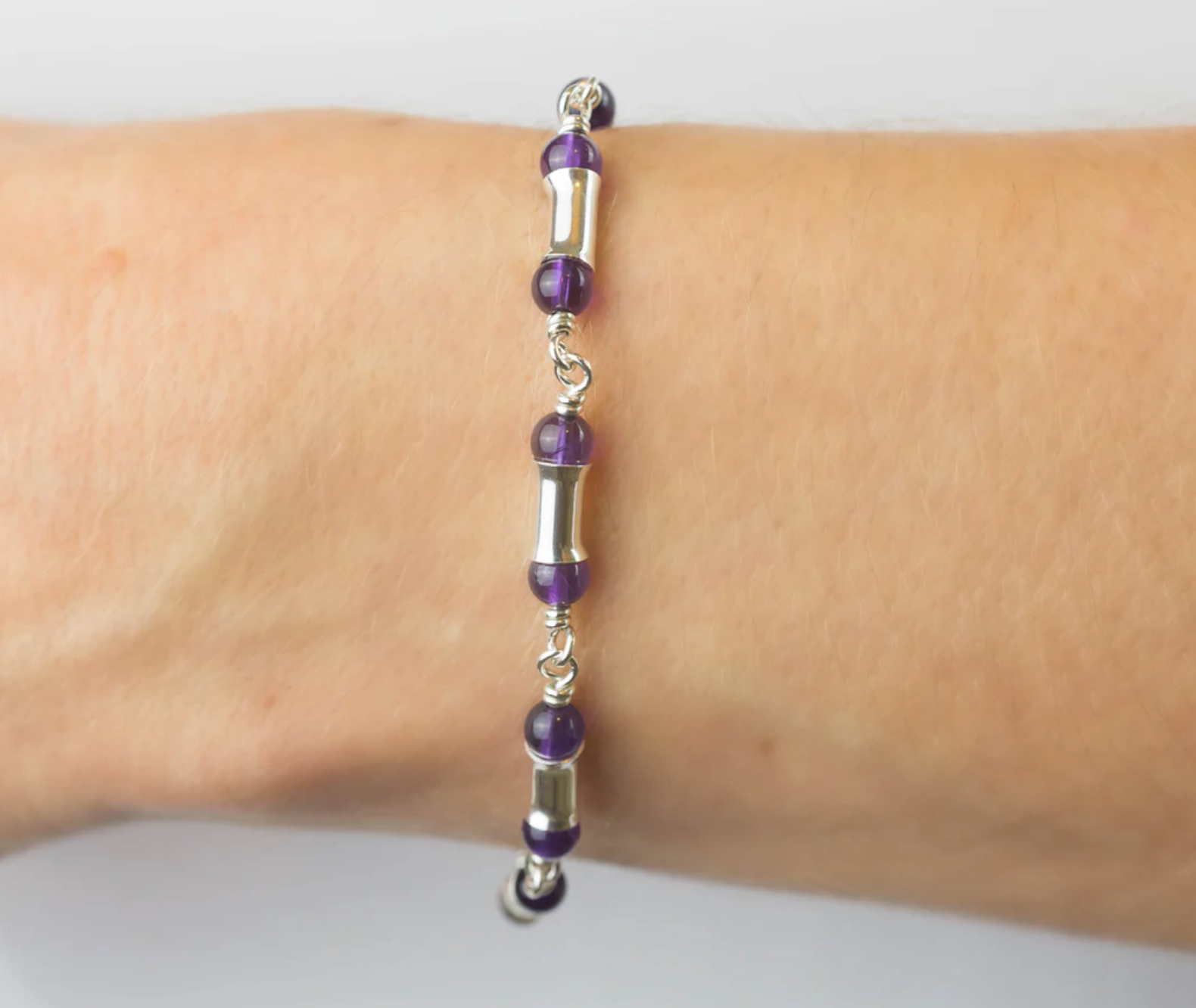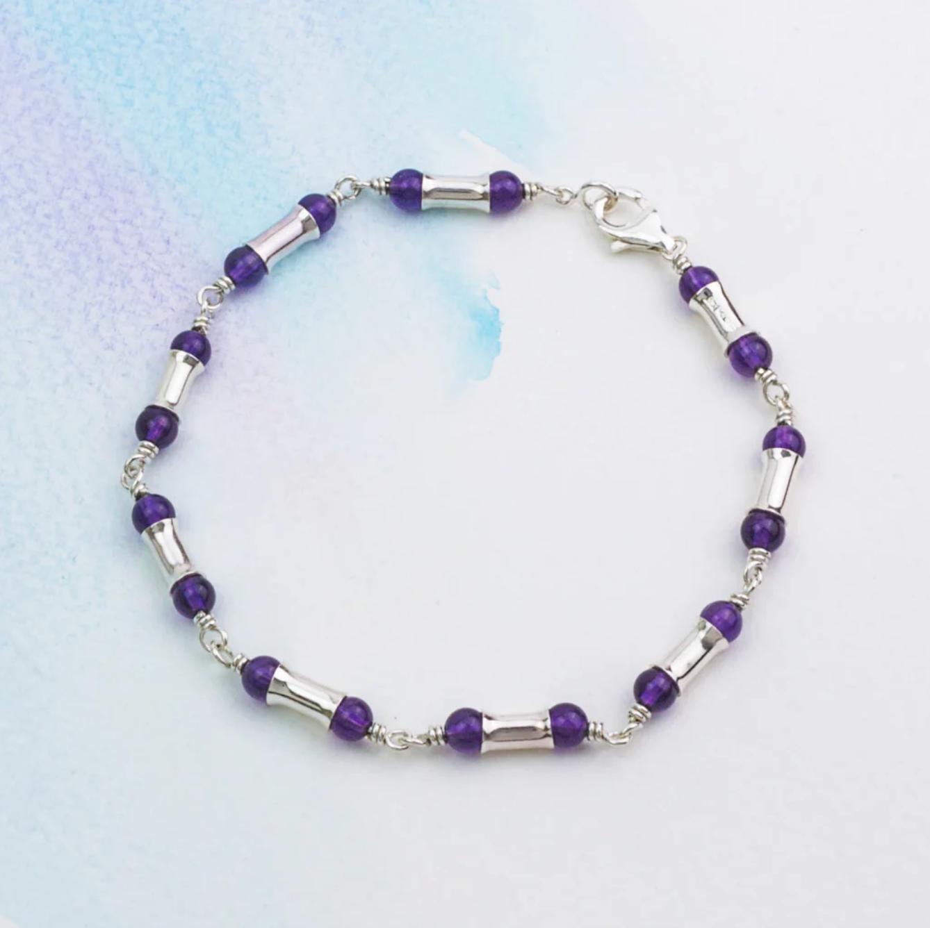 This bracelet by Louise Mary combines beautiful amethyst with flared silver tube sections. Louise flares each silver section individually with a doming punch, so each piece is ever so slightly different, much like the sections of a bamboo cane, which inspired this design.