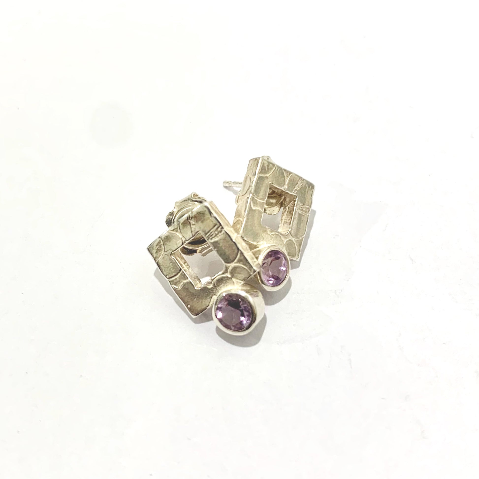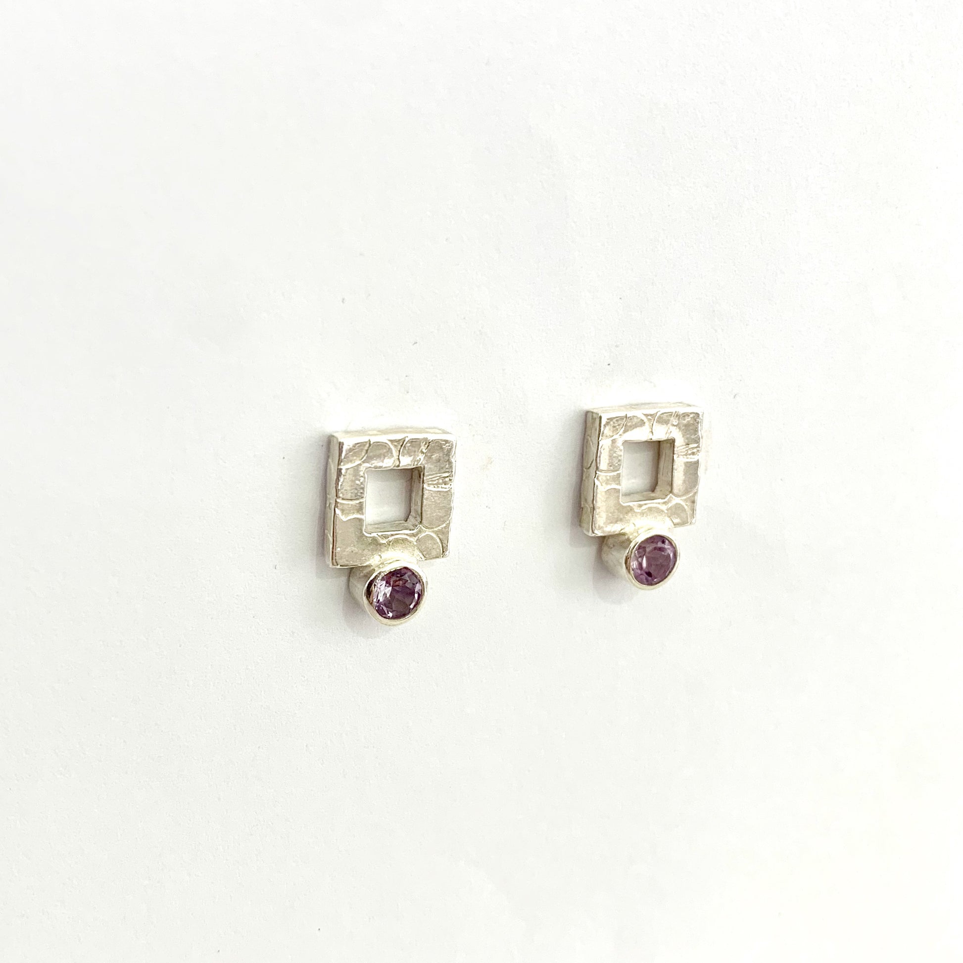 Etched silver square stud earrings set with 4mm round faceted amethyst by Karina Gill