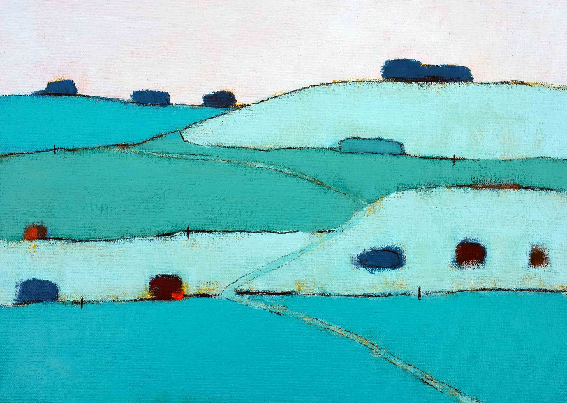 Colour and pattern are what excite David as he tries to create a balance between what he sees, what he recollects and the wish to construct something more than simple representation. There is always a tension between the flatness of the canvas and representation. He has been exploring combining aerial perspective with topographical views.