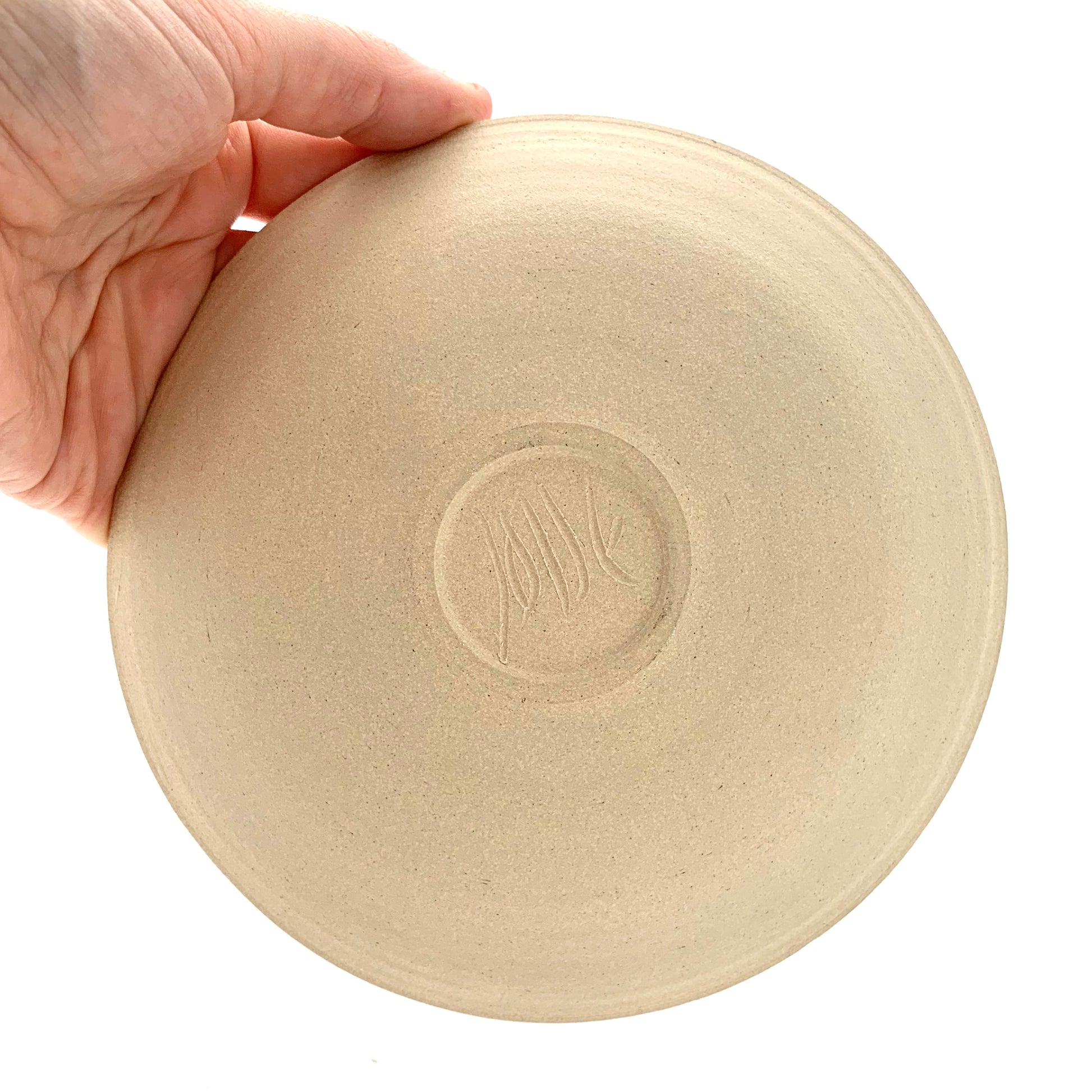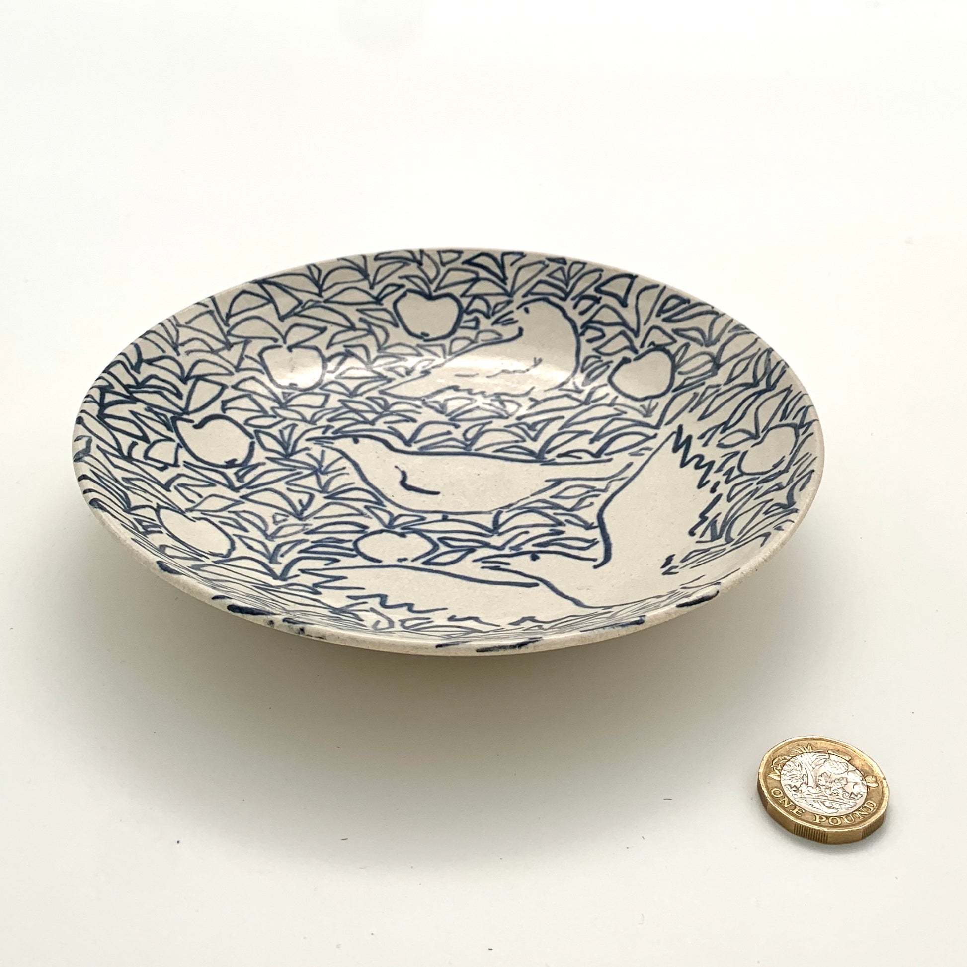 An exquisite thrown and hand painted stoneware plate by Josse Davis. This plate has a wonderful design of birds chattering away in the branches.