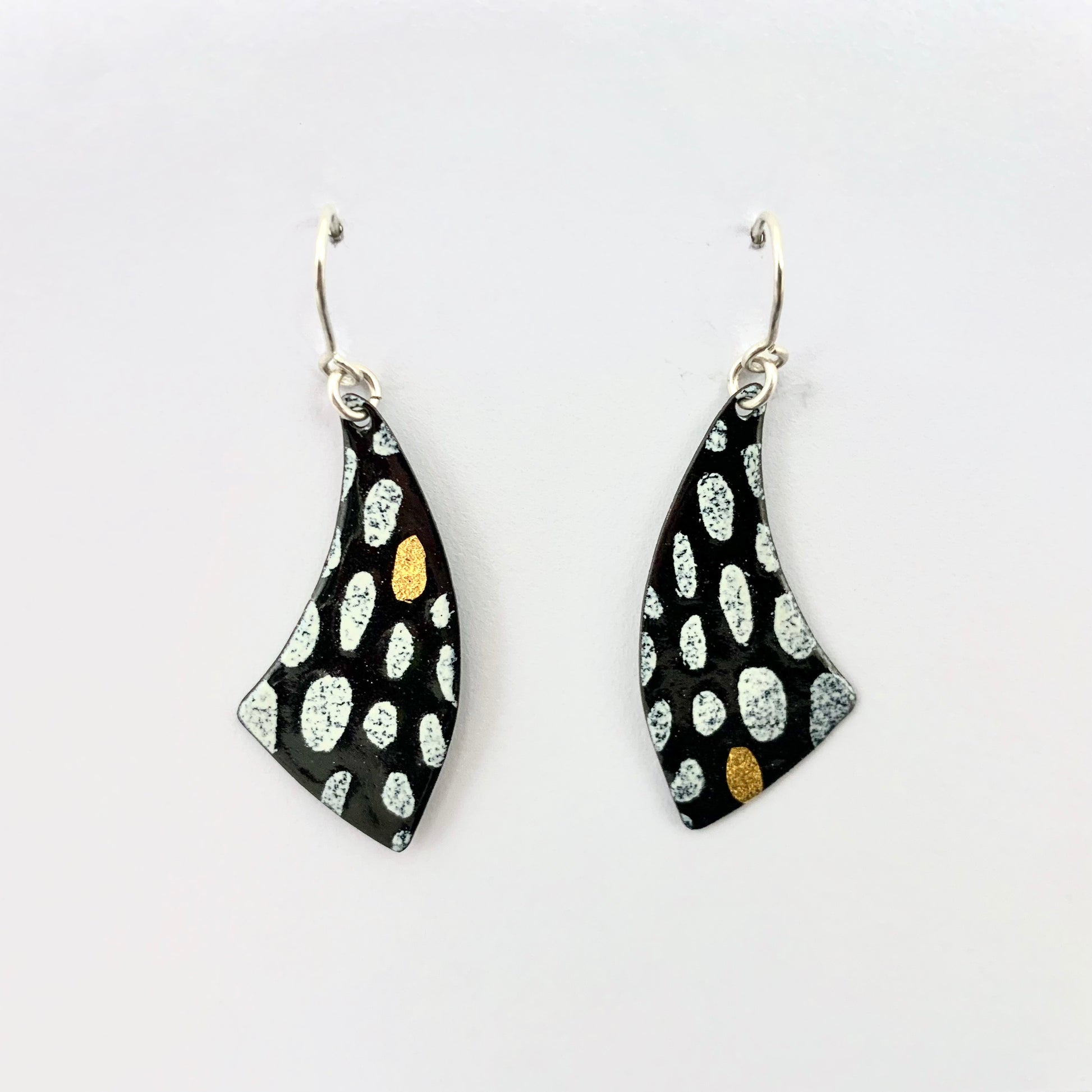 Enamelled curve dot earrings with 24 karat gold detail by Harriet St Leger. Harriet takers her inspiration from natural forms like leaves, buds and pods.