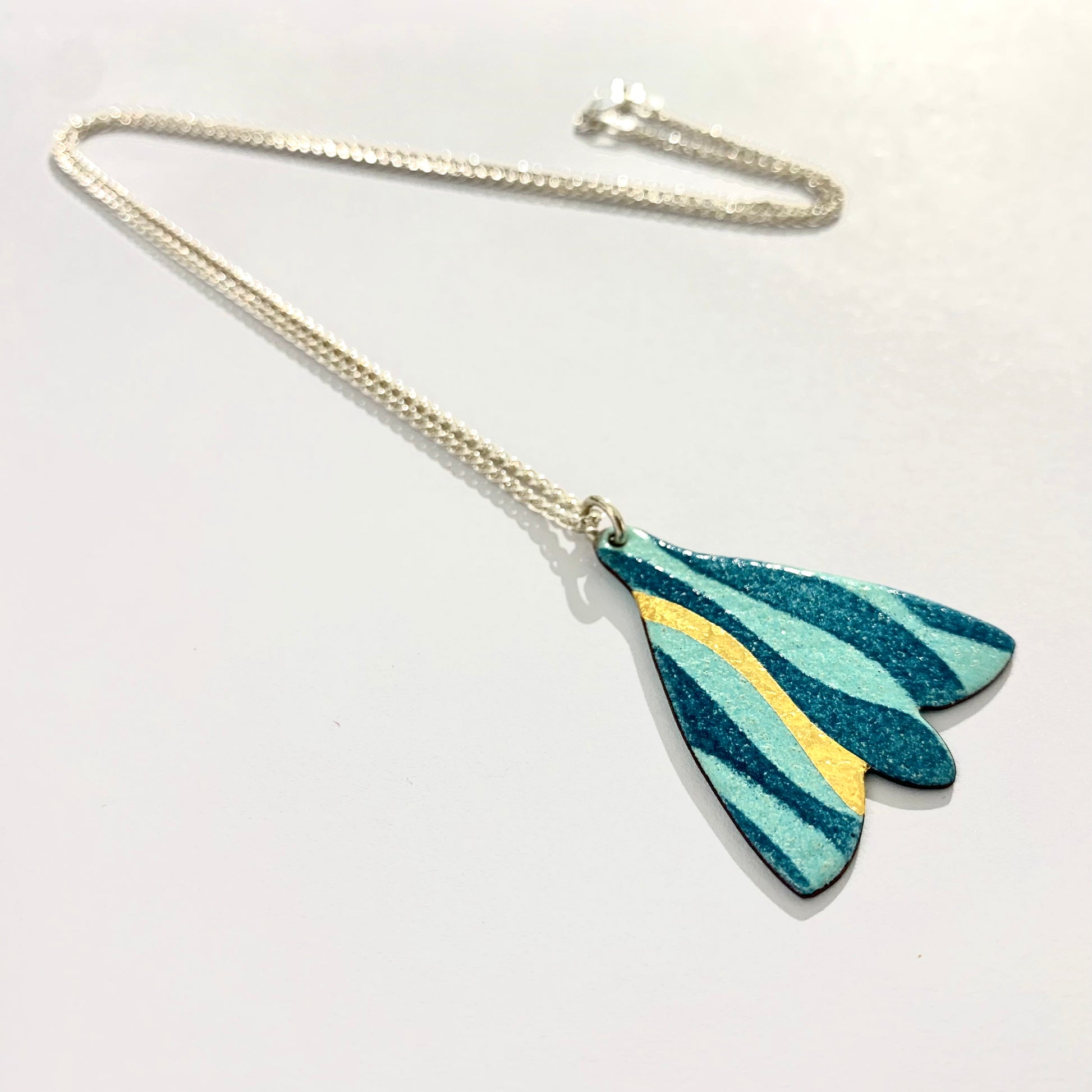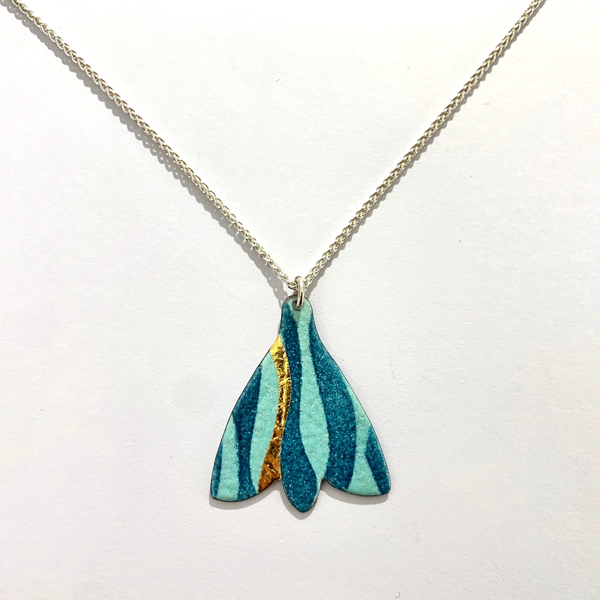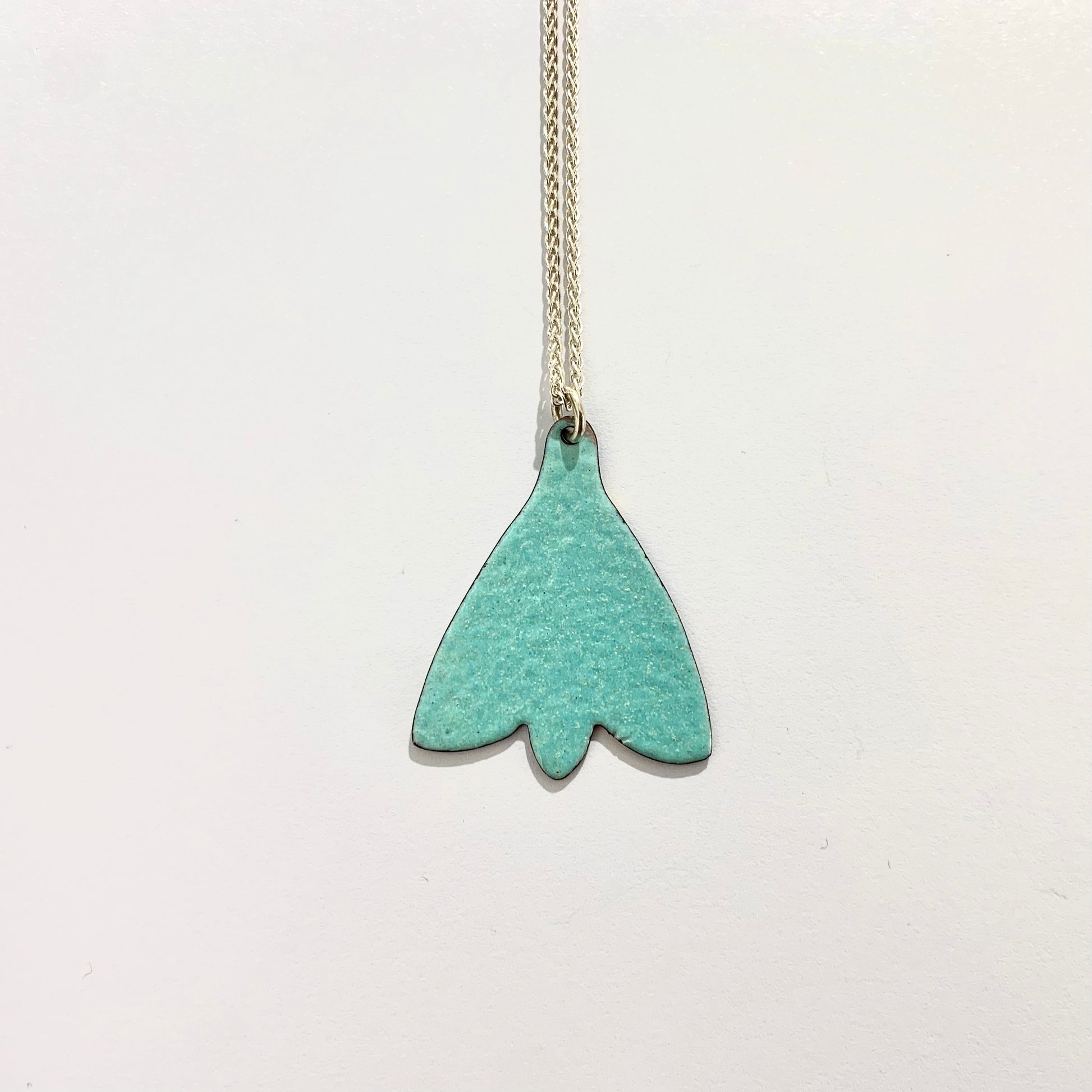 The pendant is enamelled copper. It comes on a silver chain with a lobster clasp measuring 18 inches in length.