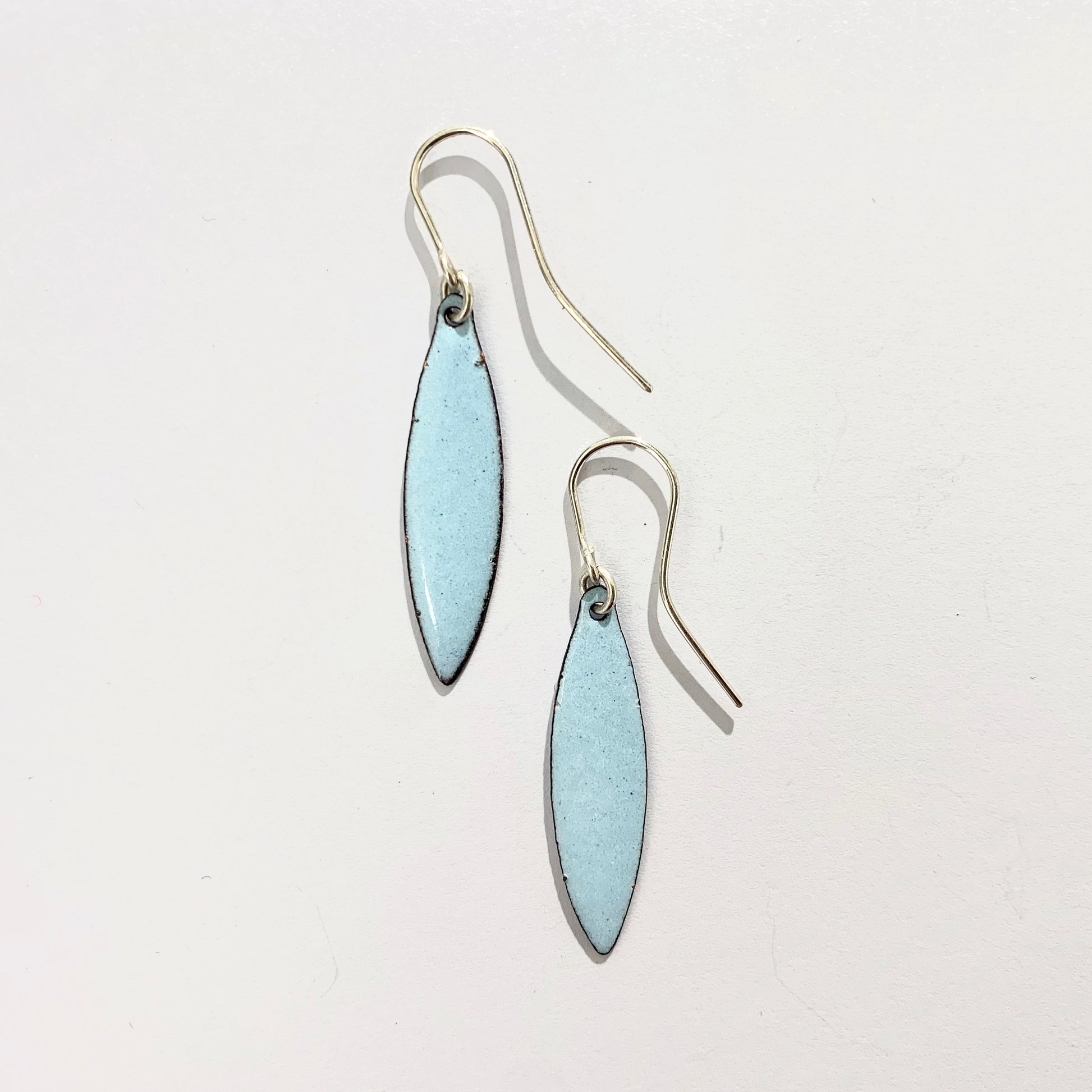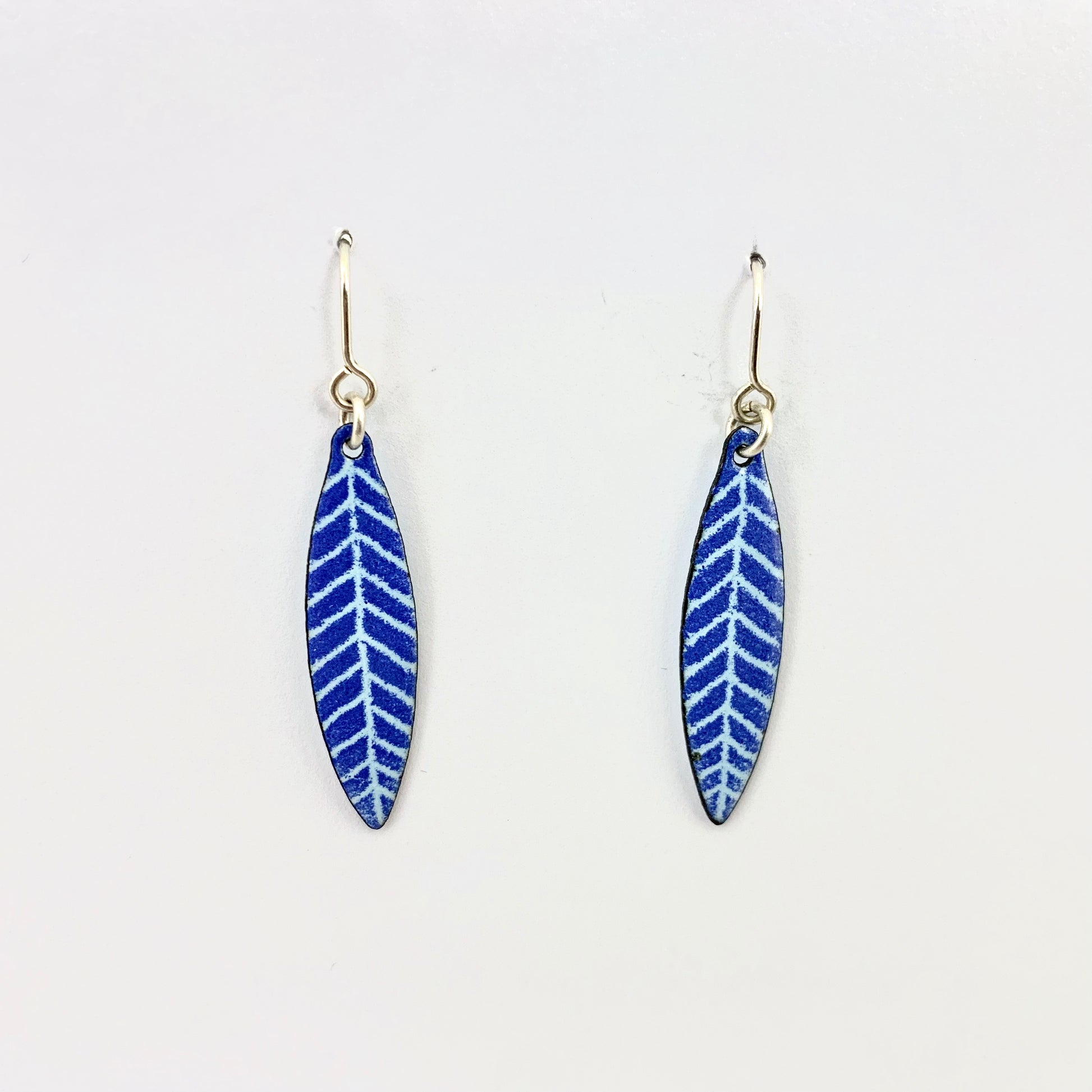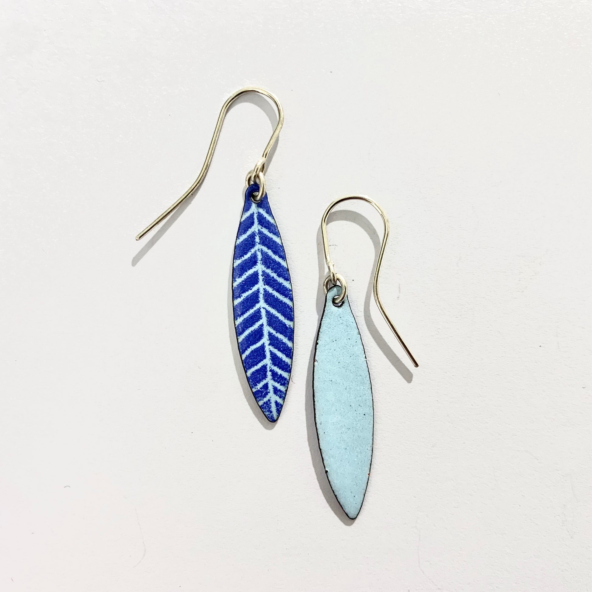 Enamelled slim windsor blue leaf earrings by Harriet St Leger. Harriet takers her inspiration from natural forms like leaves, buds and pods.