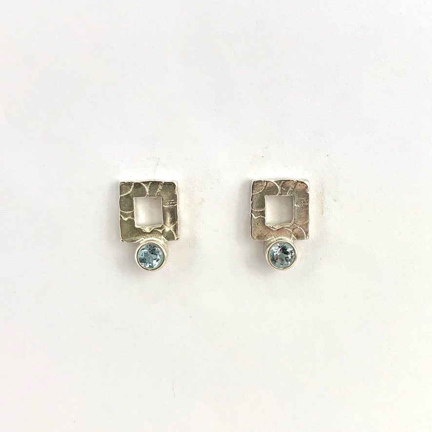 Etched silver square stud earrings set with 4mm round faceted blue topaz by Karina Gill