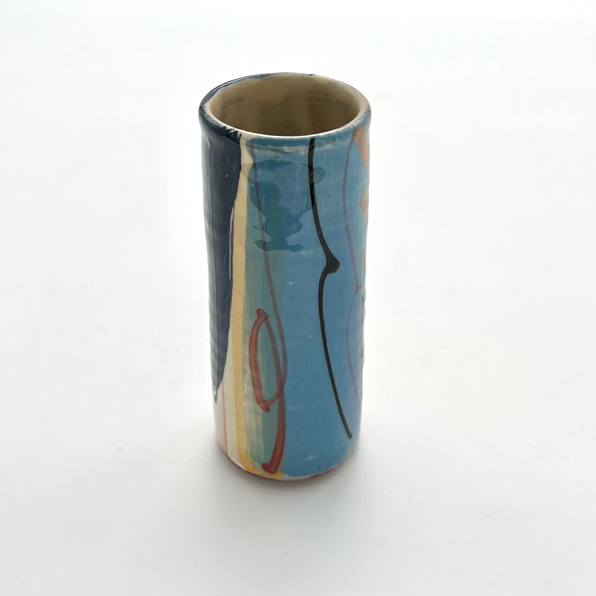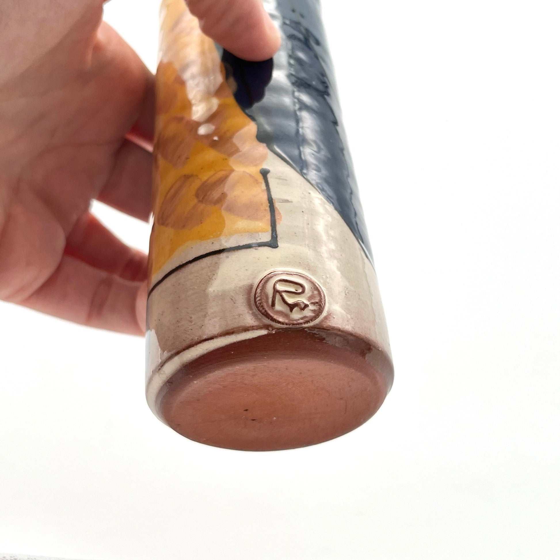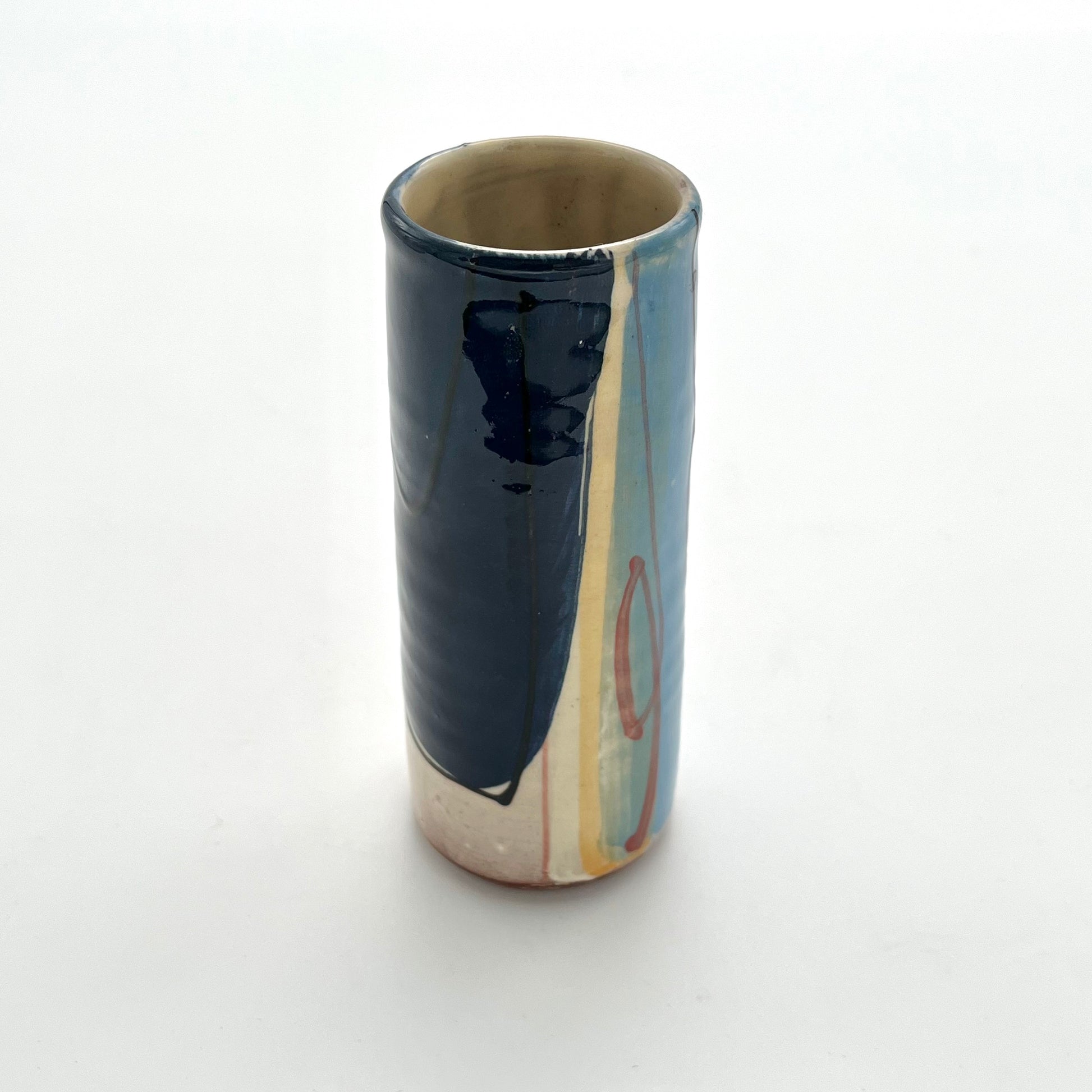 This earthenware bud vase by Richard Wilson is wheel-thrown and decorated with wonderful brightly coloured slips. The gorgeous gestural marks using different brushes create an abstract design, inspired by the ebb and flow of the sea at West Bay.
