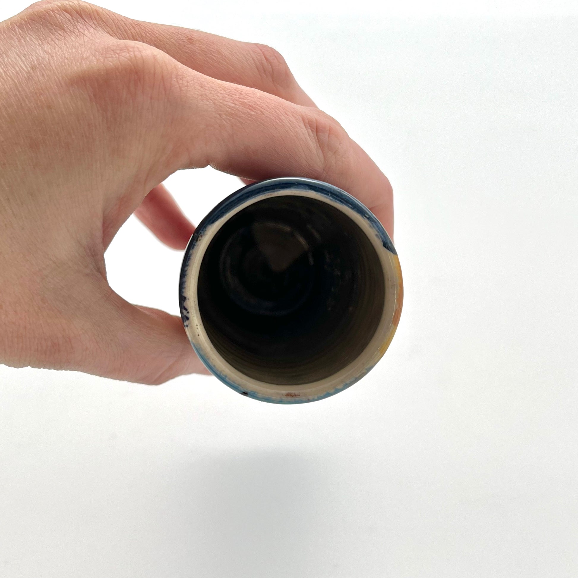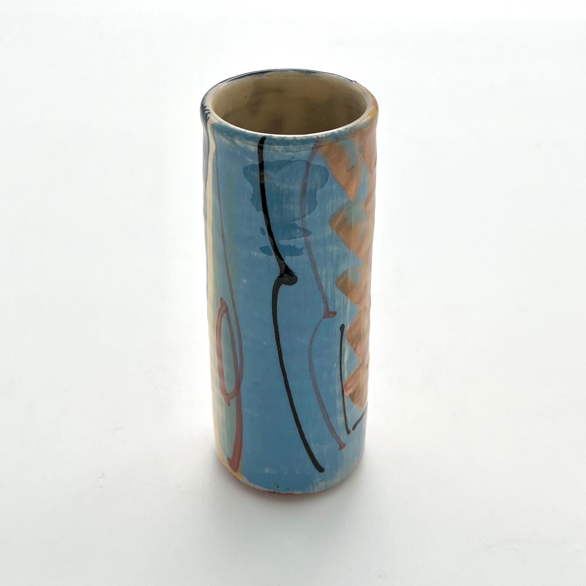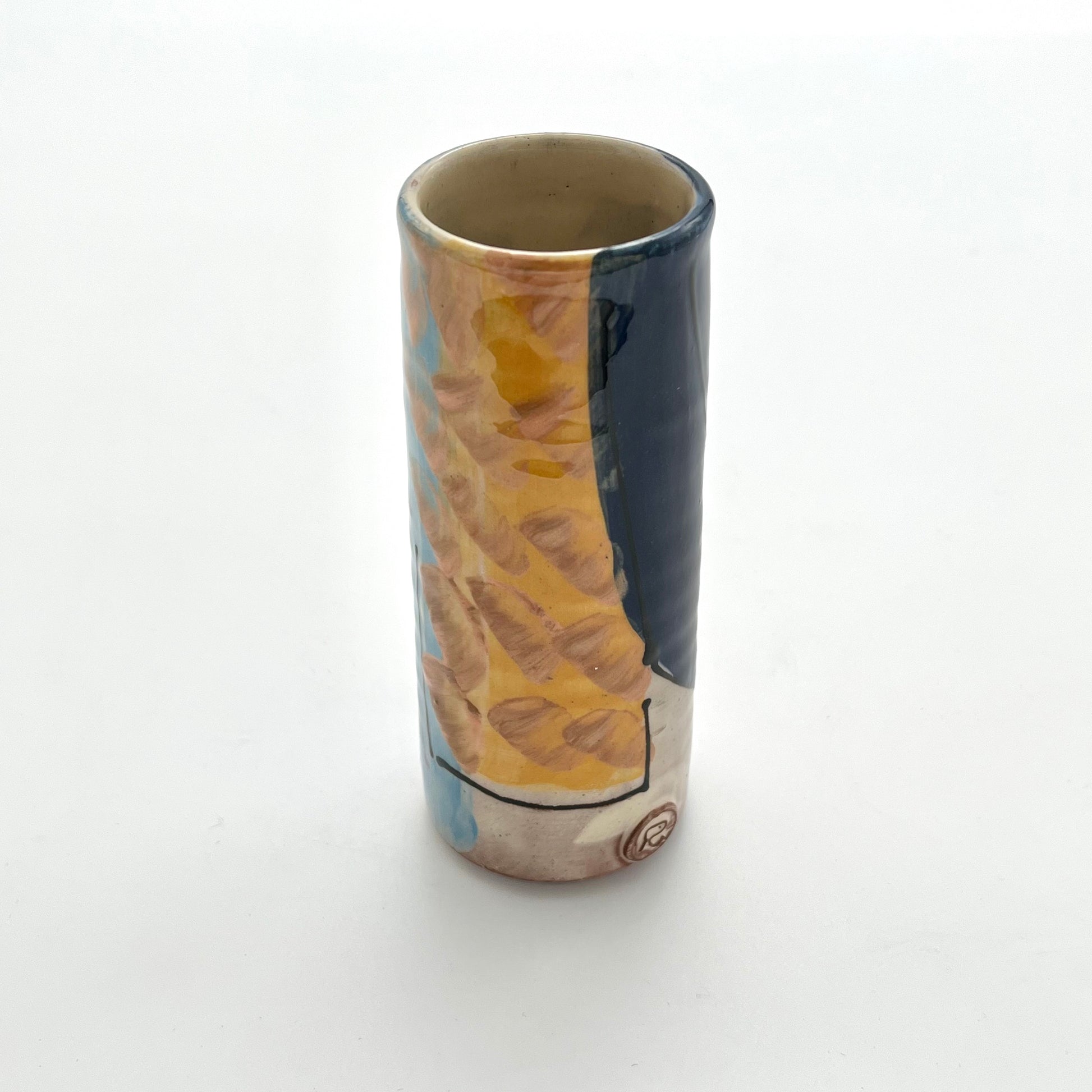 This earthenware bud vase by Richard Wilson is wheel-thrown and decorated with wonderful brightly coloured slips. The gorgeous gestural marks using different brushes create an abstract design, inspired by the ebb and flow of the sea at West Bay.