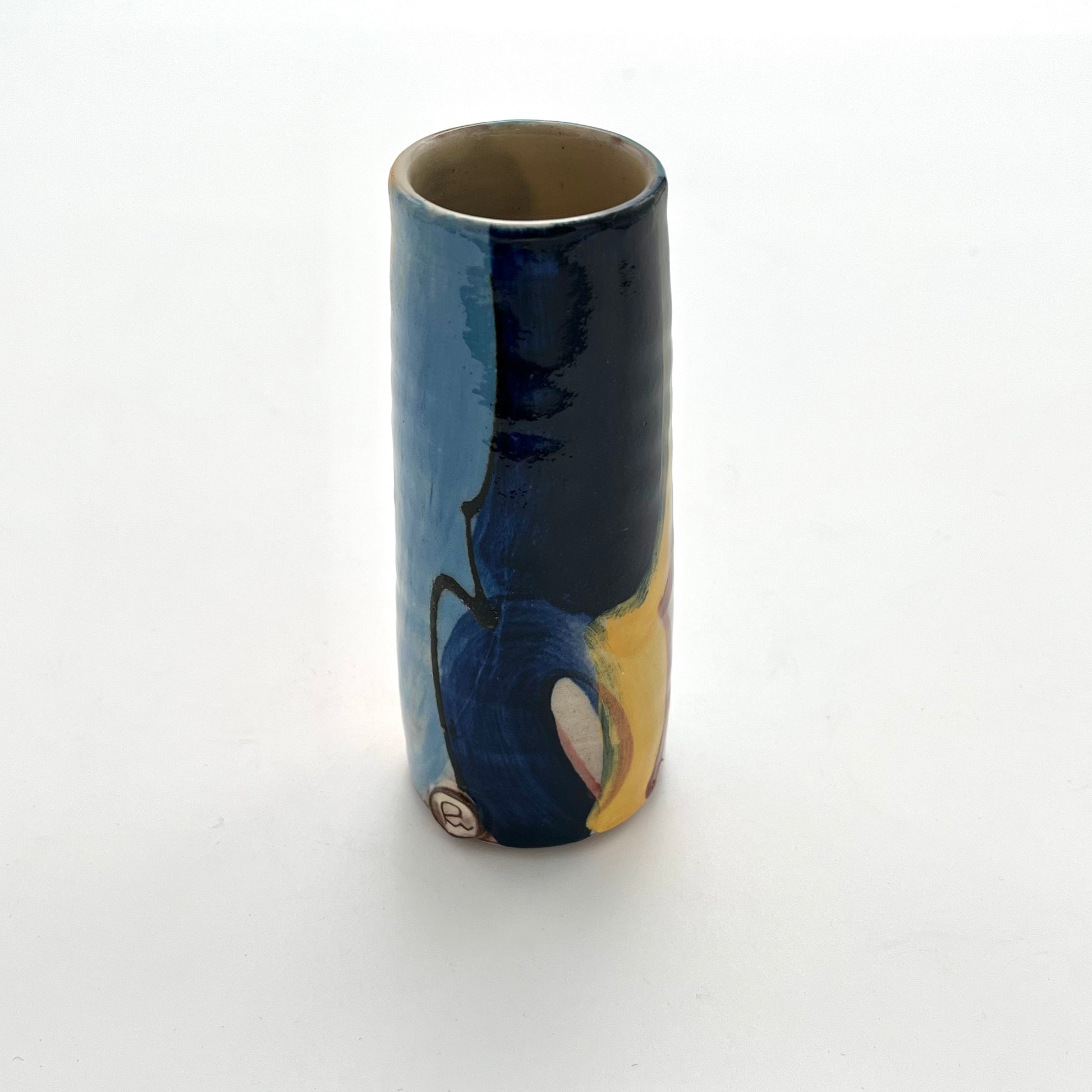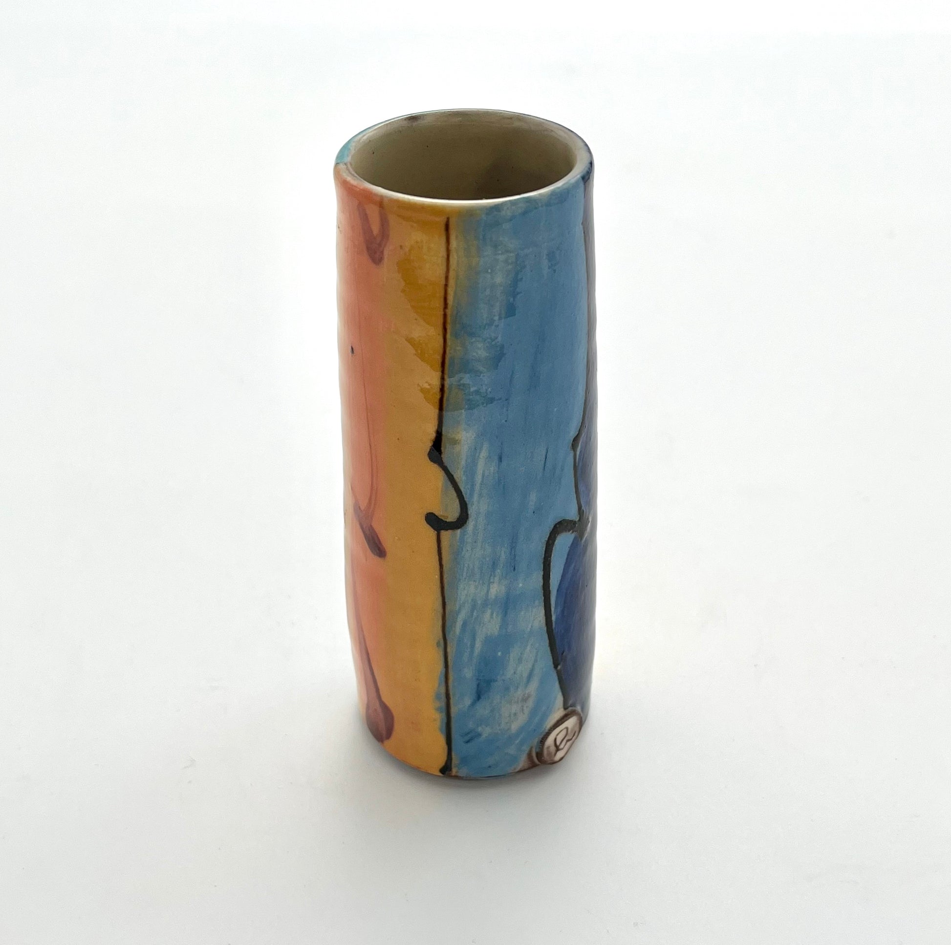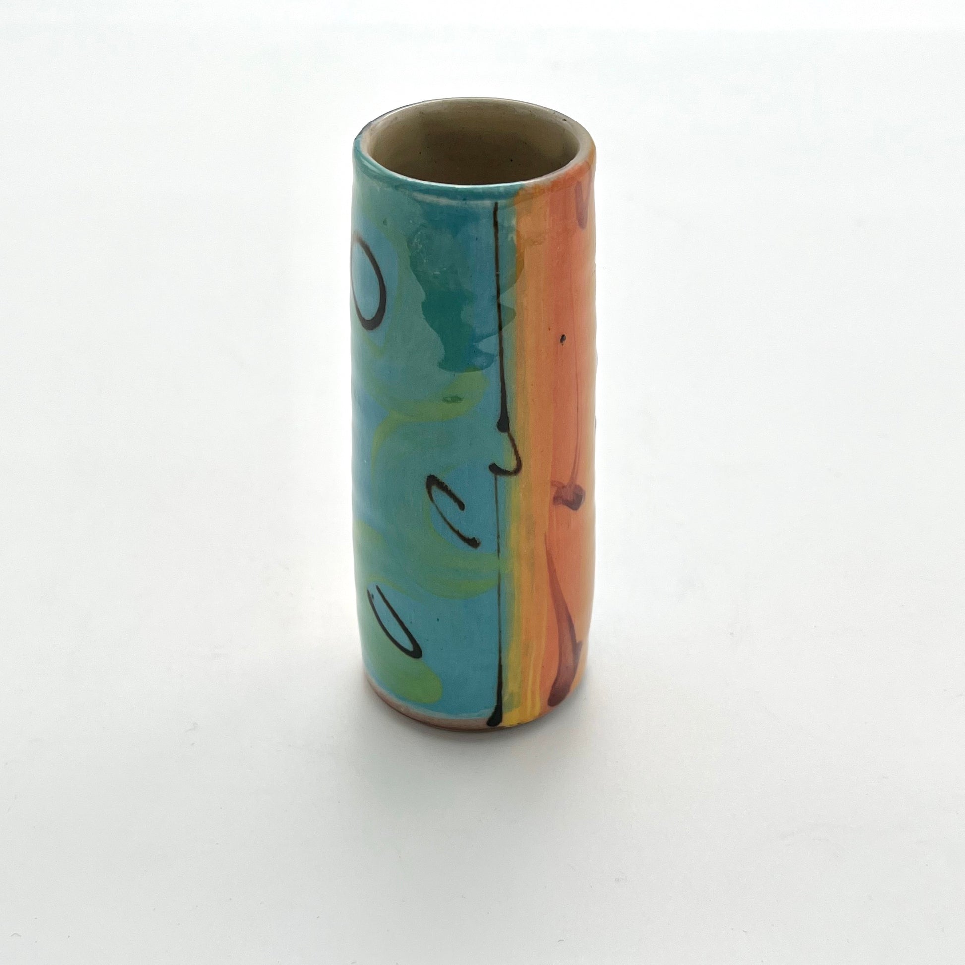 This earthenware bud vase by Richard Wilson is wheel-thrown and decorated with wonderful brightly coloured slips. The gorgeous gestural marks using different brushes create an abstract design, inspired by the ebb and flow of the sea at West Bay.
