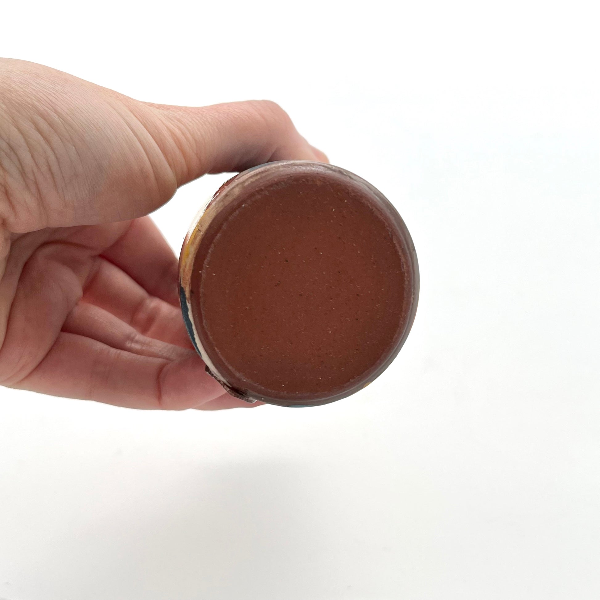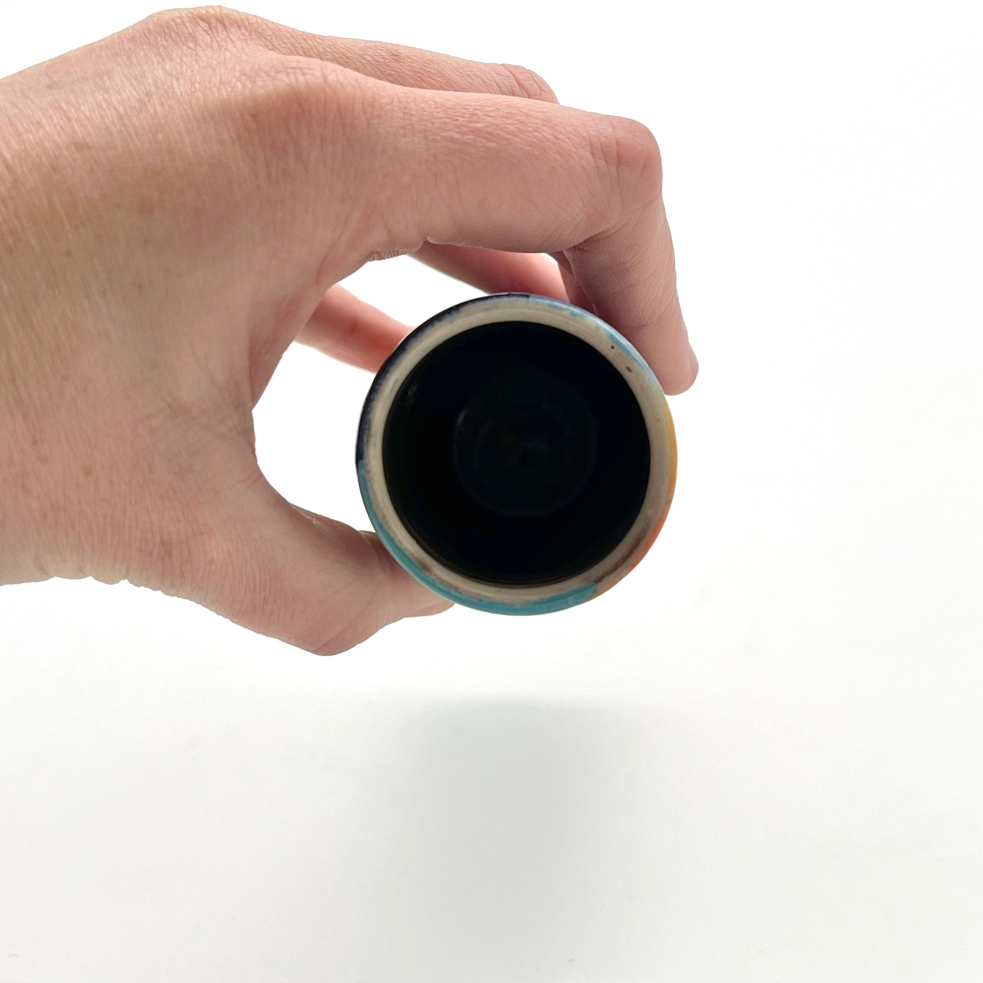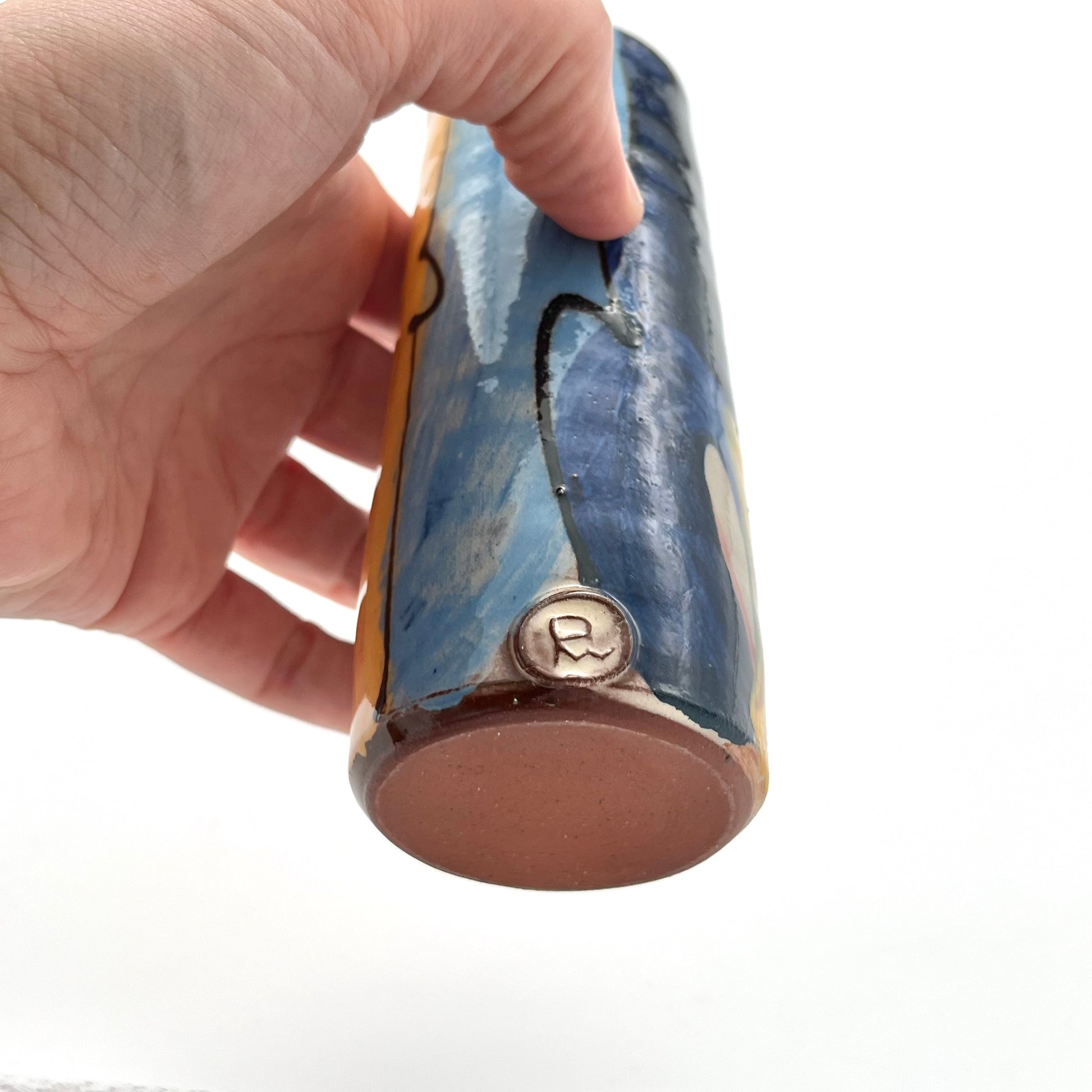 This earthenware bud vase by Richard Wilson is wheel-thrown and decorated with wonderful brightly coloured slips. The gorgeous gestural marks using different brushes create an abstract design, inspired by the ebb and flow of the sea at West Bay.