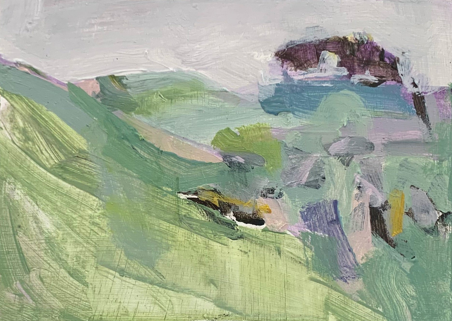 I’m interested in the juxtaposition of man-made and nature, and of feeling my way through the lines of road markings, bright orange barriers, telegraph poles and pylons within the huge space that comes from hills, water and sky.