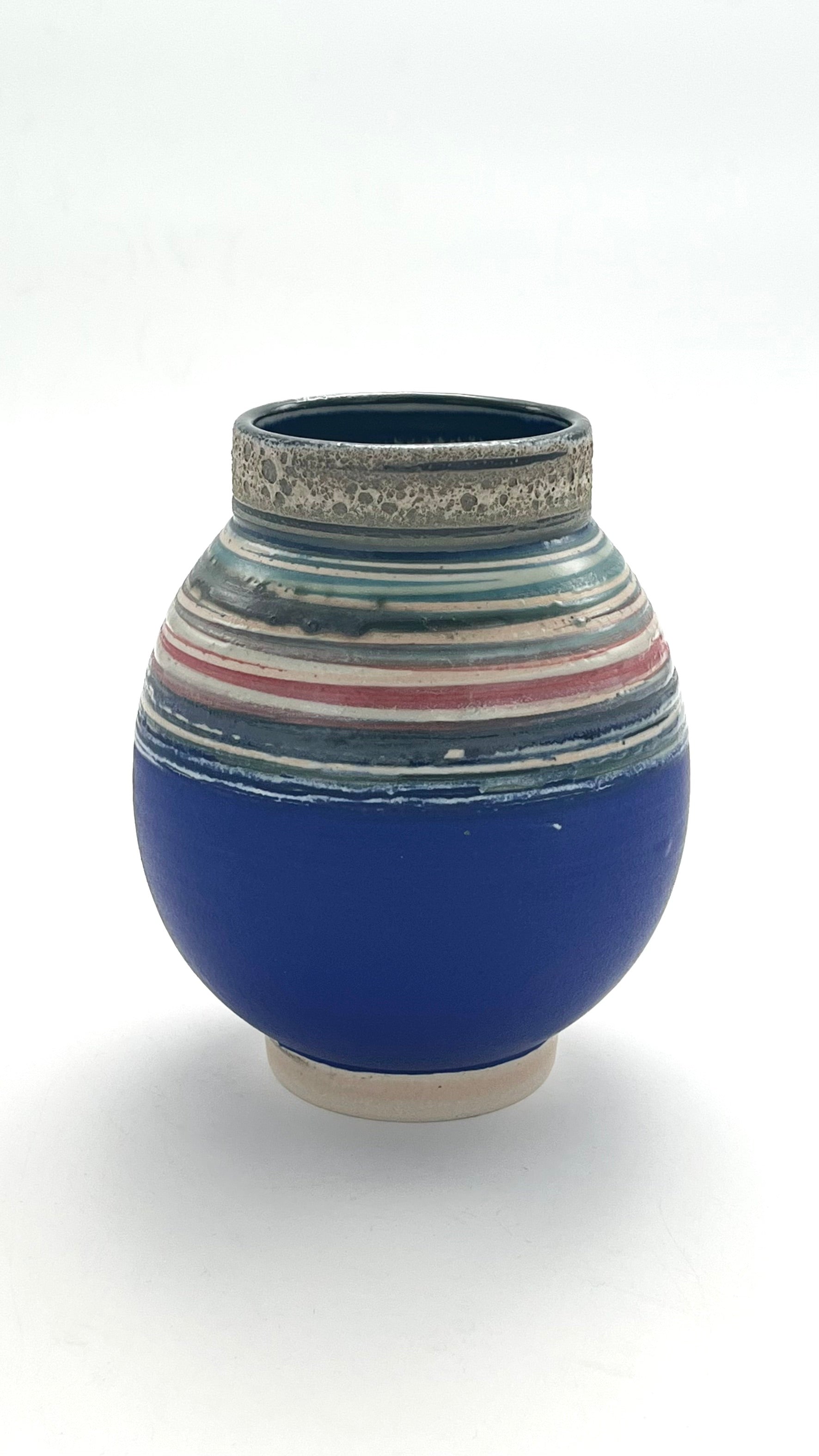 Cobalt Striped Moon Jar with Textured Neck by Emma Baldwin. Wheel-thrown stoneware. Emma has used wax resist to create the linear design.
