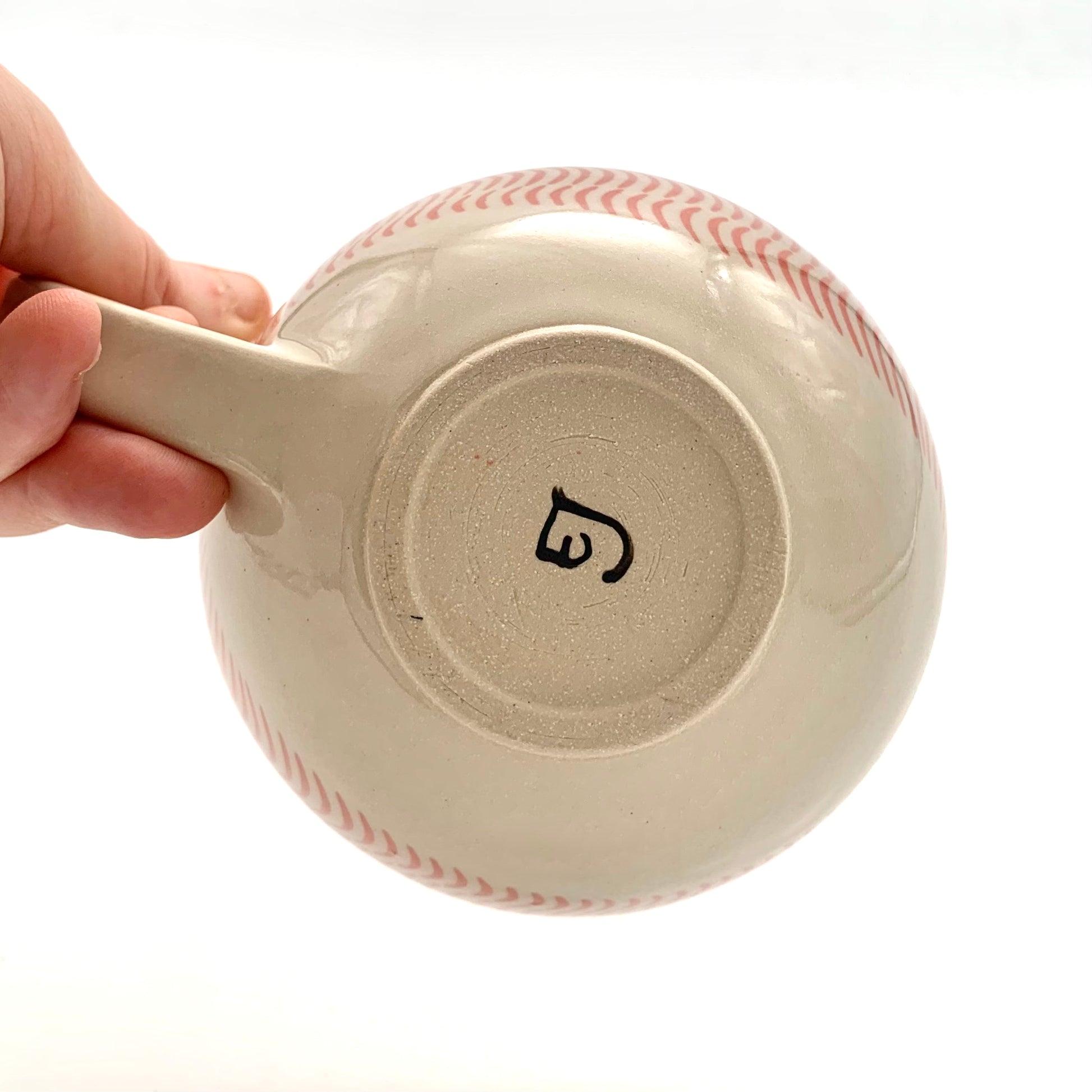 A fabulous coral and off white mug by Judit Esztergomi in her 'Flow' design. Wheel-thrown and hand-carved mug made of white stoneware clay, decorated with coloured slip and an inlaid flow pattern. Glazed with a shiny transparent glaze both inside and outside.