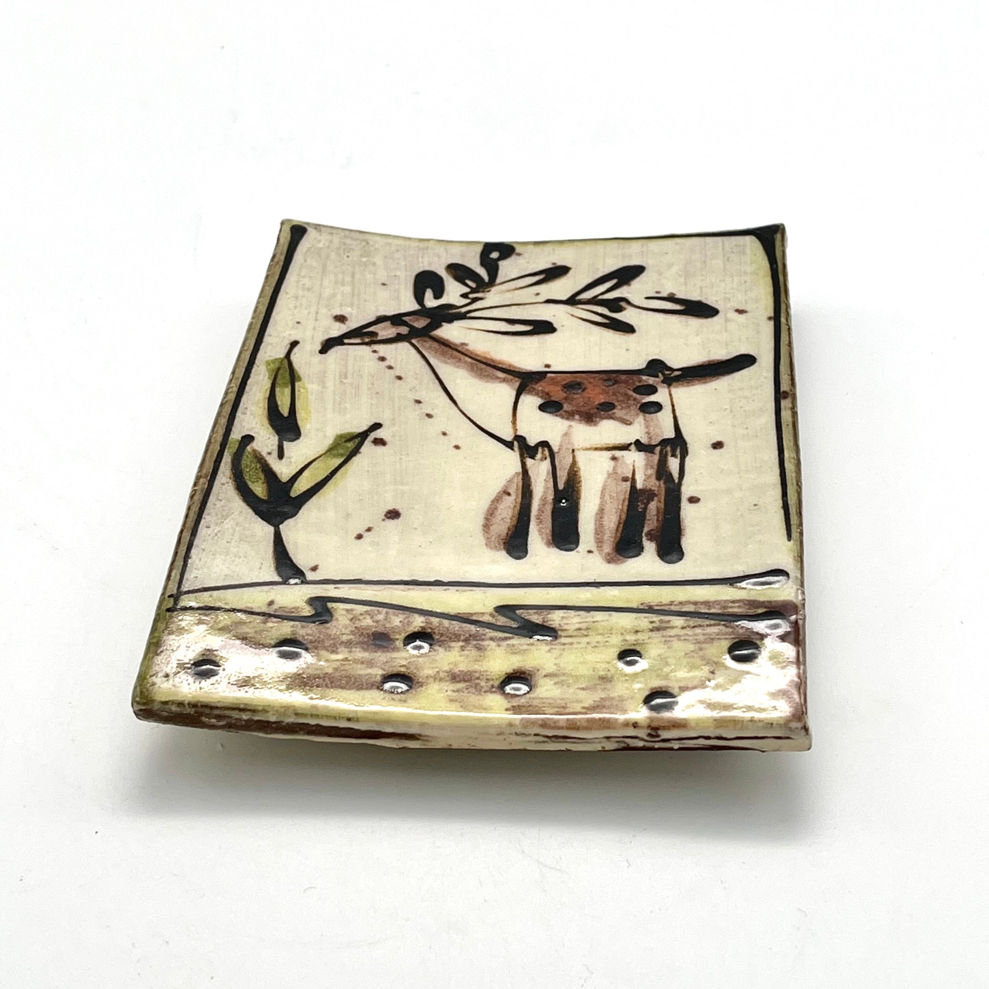 This earthenware butter slab by Josie Walter is wheel-thrown and painted with a slip-decorated deer design.
