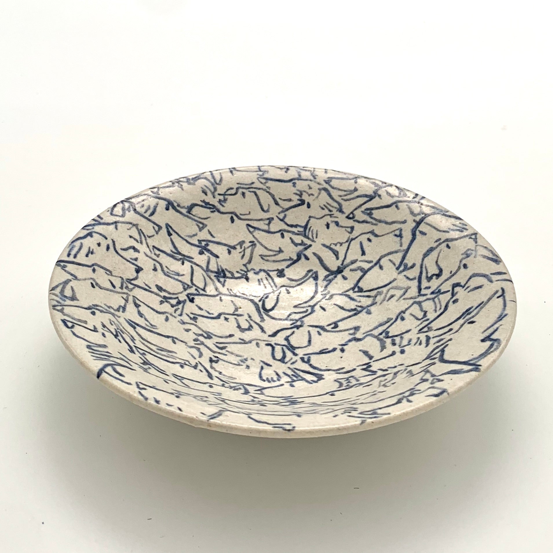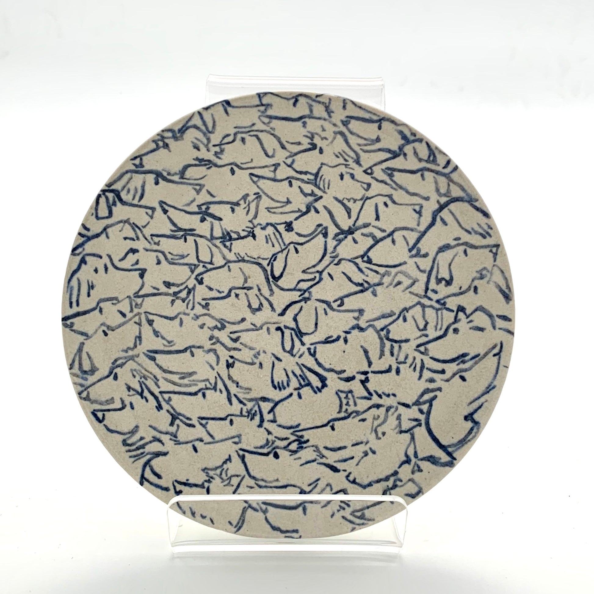 An exquisite thrown and hand painted stoneware plate by Josse Davis. This plate has a wonderful design of dogs.