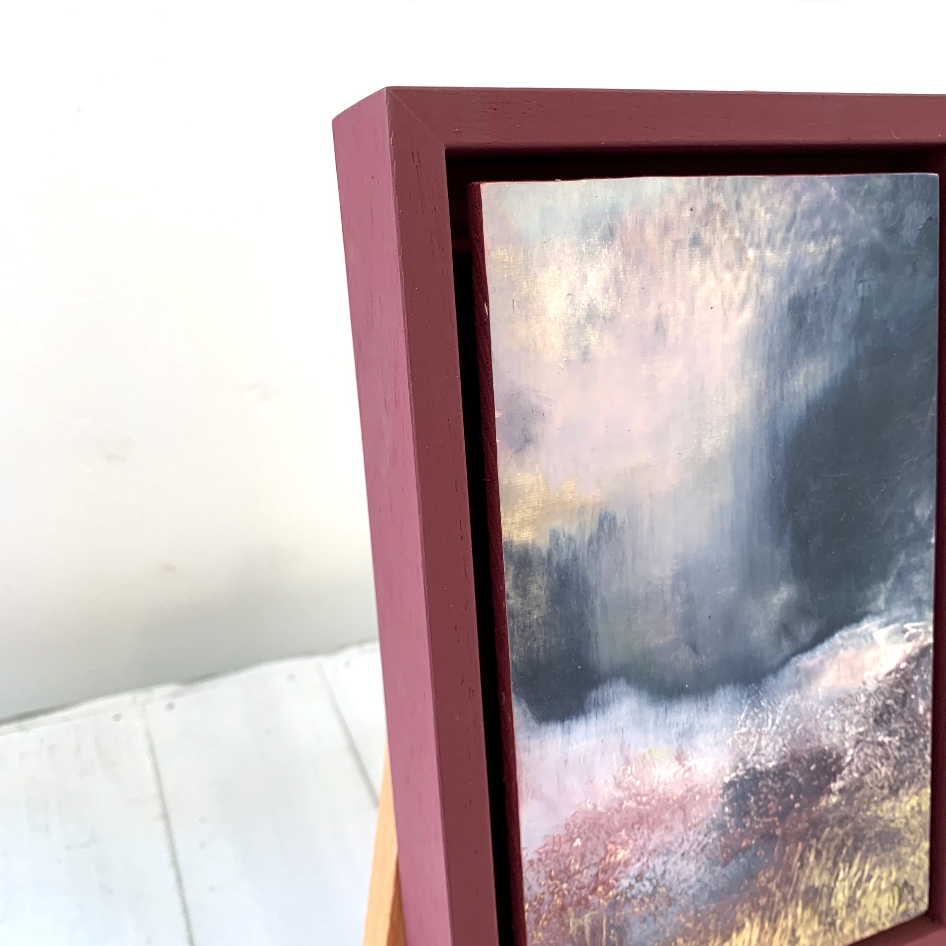 Oil and cold wax medium on mounted paper framed in a contemporary coloured frame