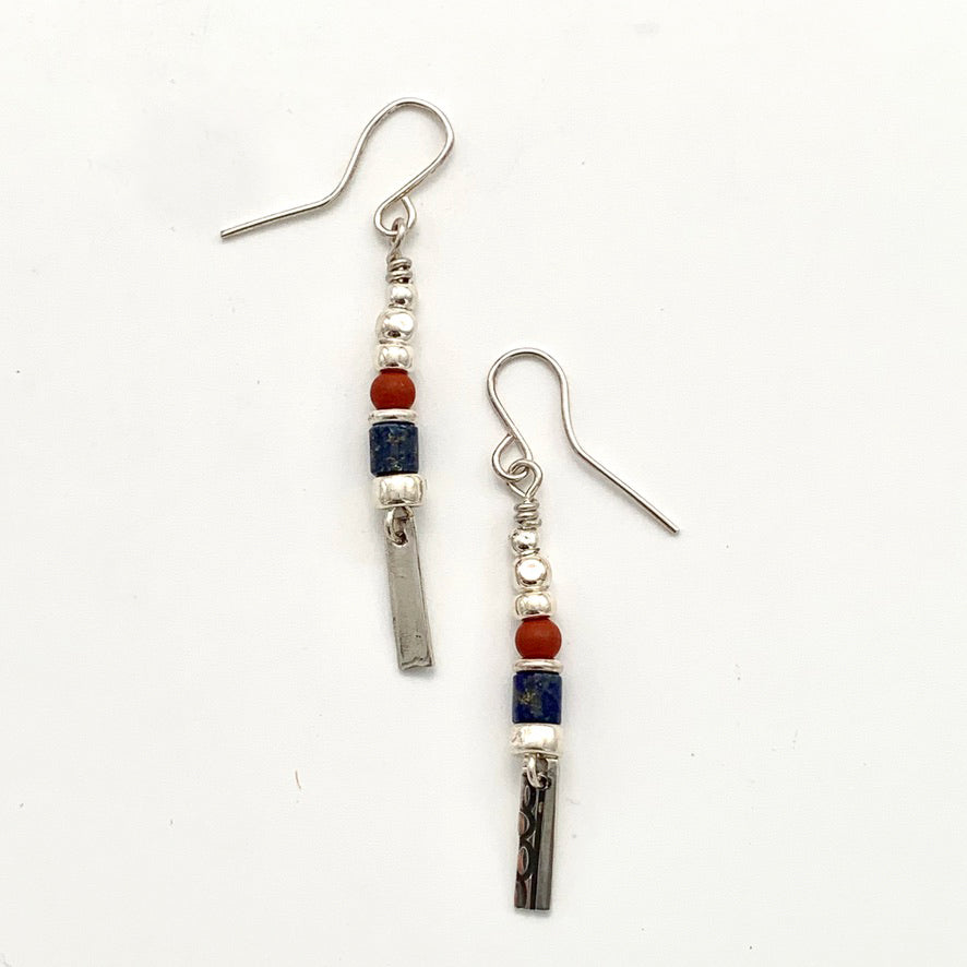 Etched Silver, Lapis and Red Jasper Earrings by Anne Farag.