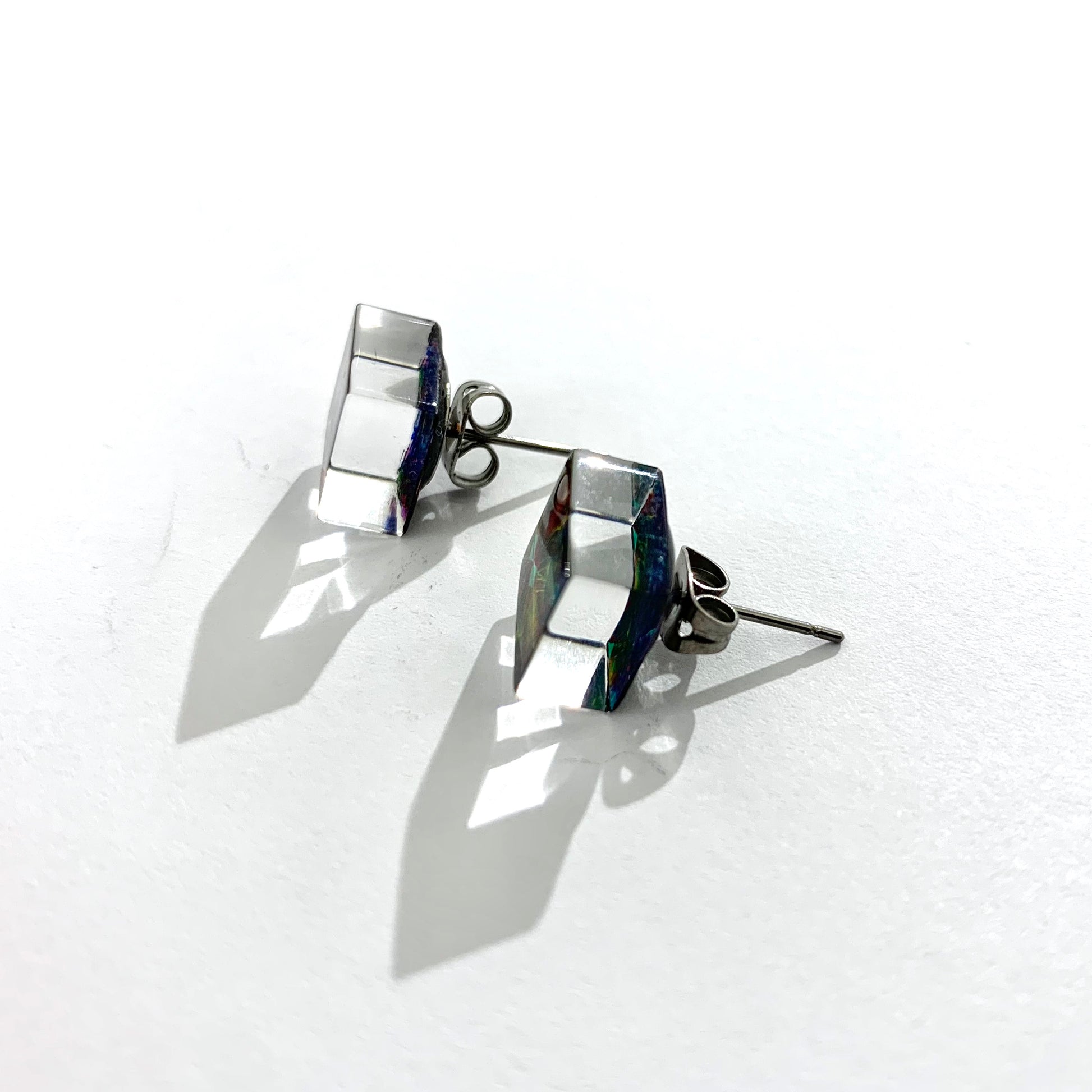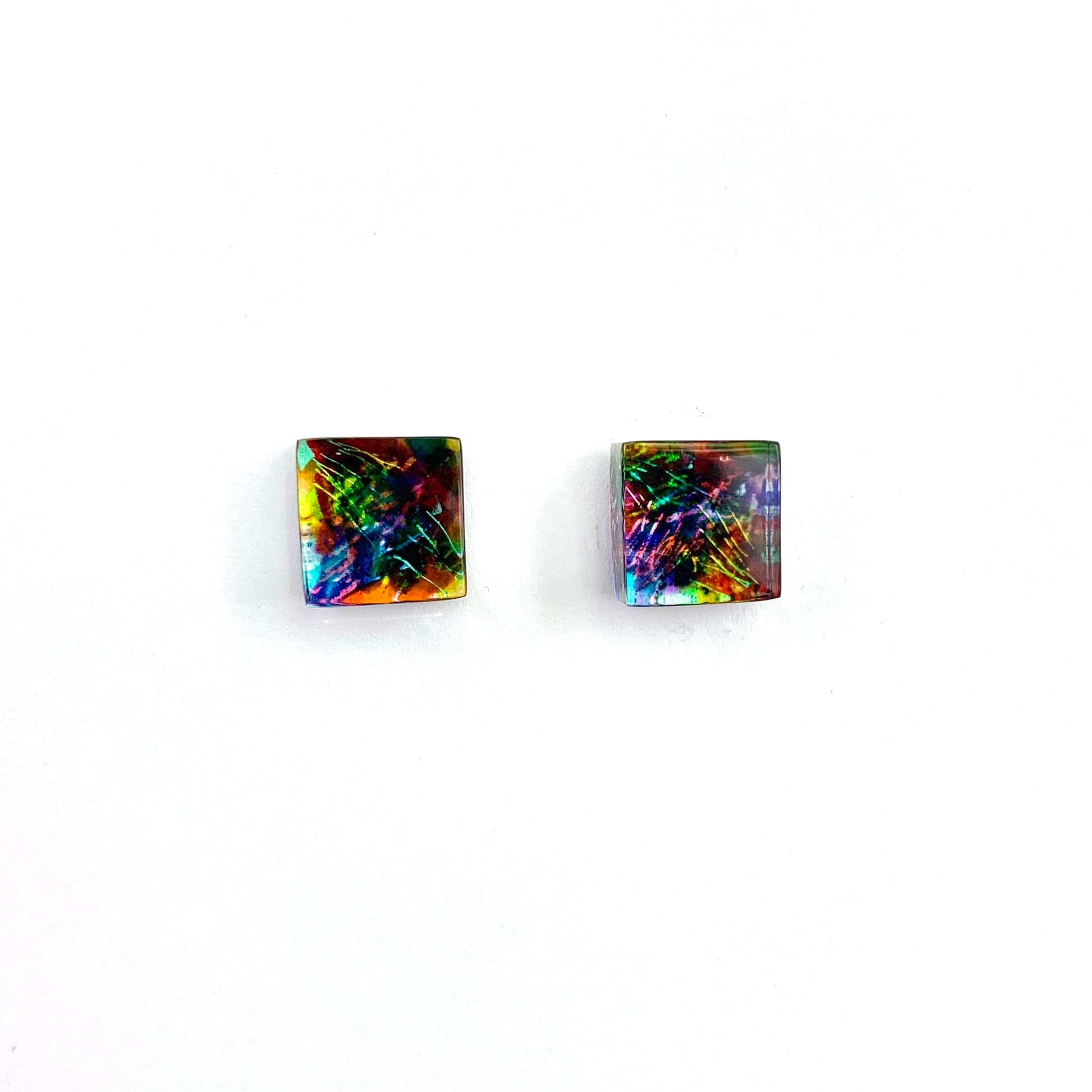 One of Rowena's most popular design at White Chalk Gallery and I can see why! Transparent coloured lacquers are painted onto the back of the clear acrylic which creates wonderful jewel like effects as the light bounces off it. This is a beautiful design which shimmers, giving hints of so many different colours just as an opal would.