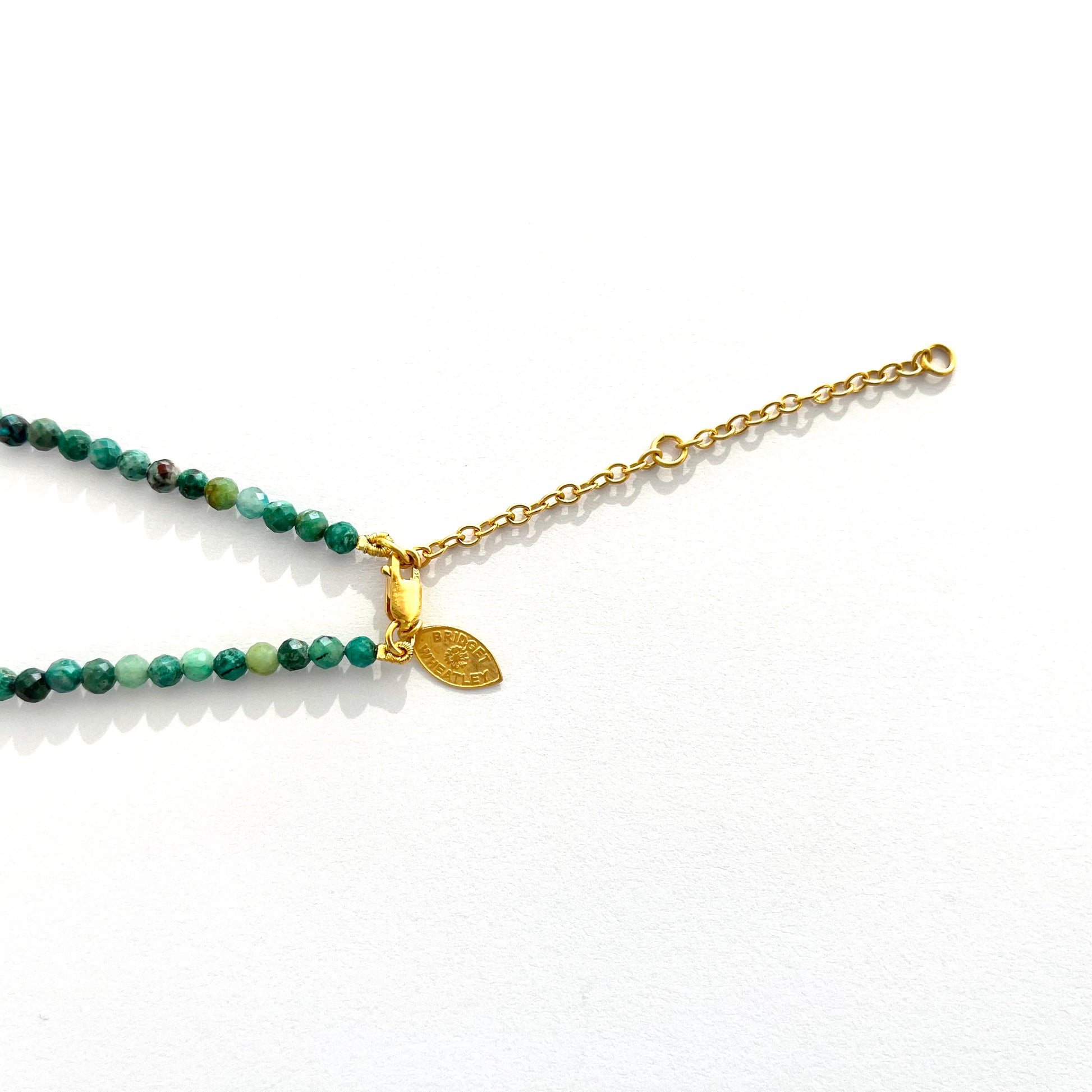 Handmade necklace by Bridget Wheatley. Made from sterling silver with a good quality hard gold plate, combined with 2.5mm diameter chrysocolla beads. This necklace is inspired by natural forms and is part of Bridget's 'Into the Woods' collection.