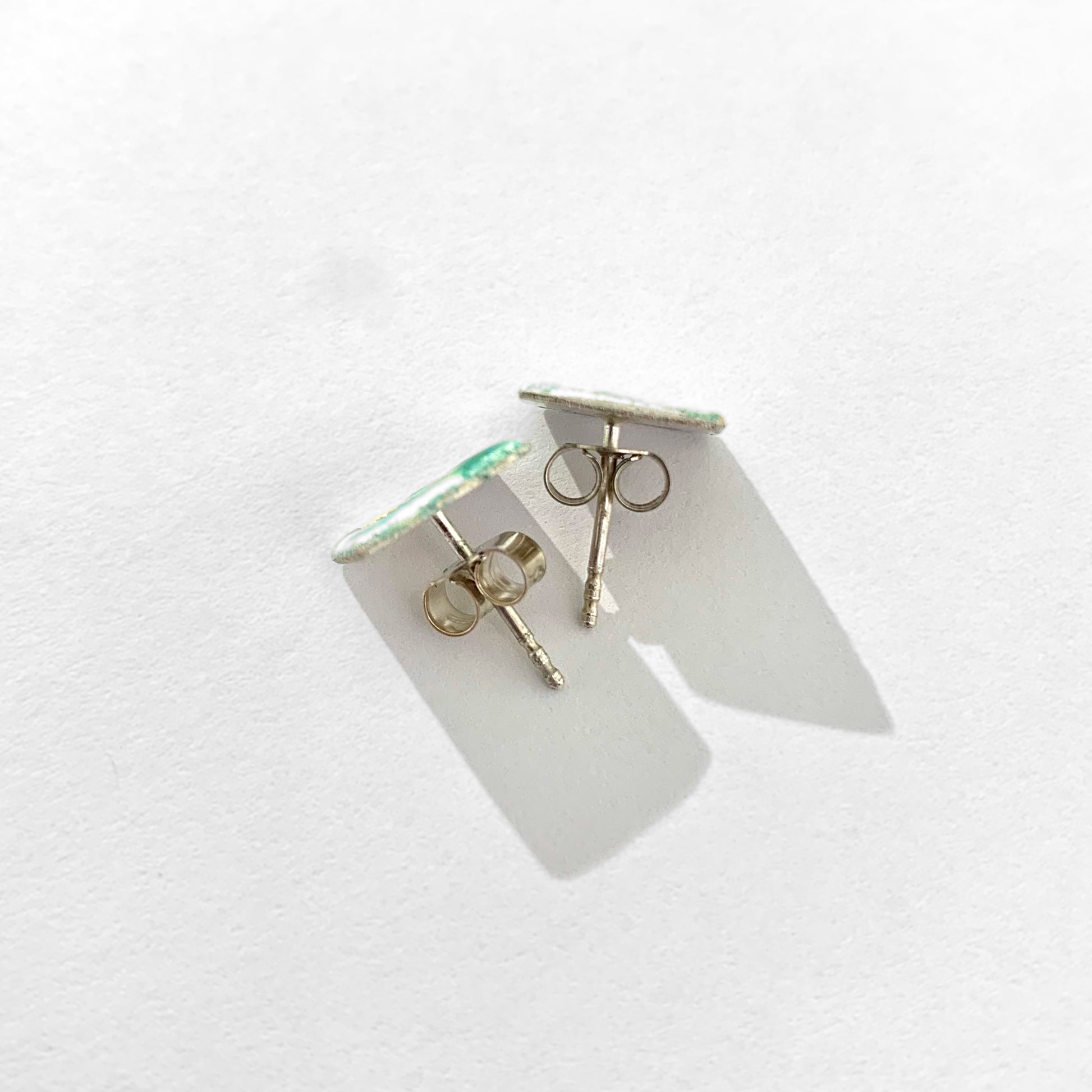 Green and Blue stud earrings by Nancy Pickard. Sterling silver with gold leaf detail. The earrings measure approx 1cm x 1cm.