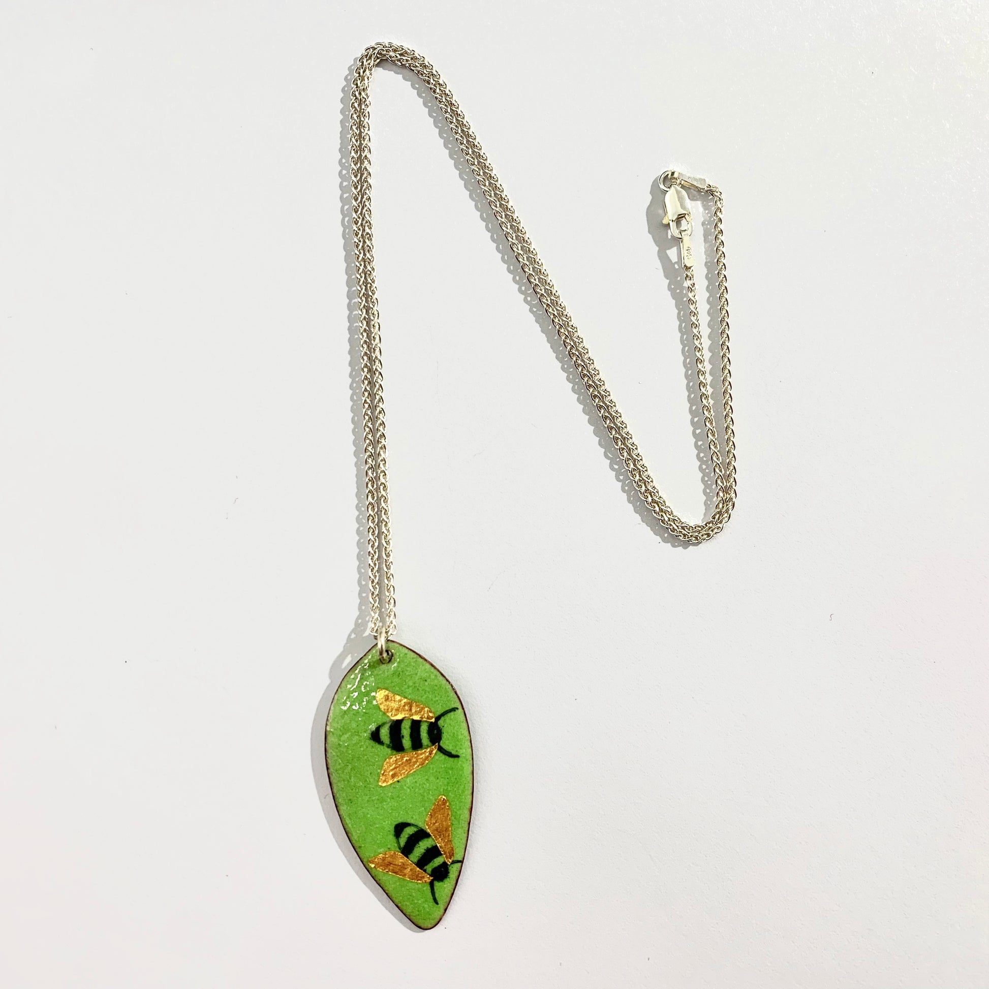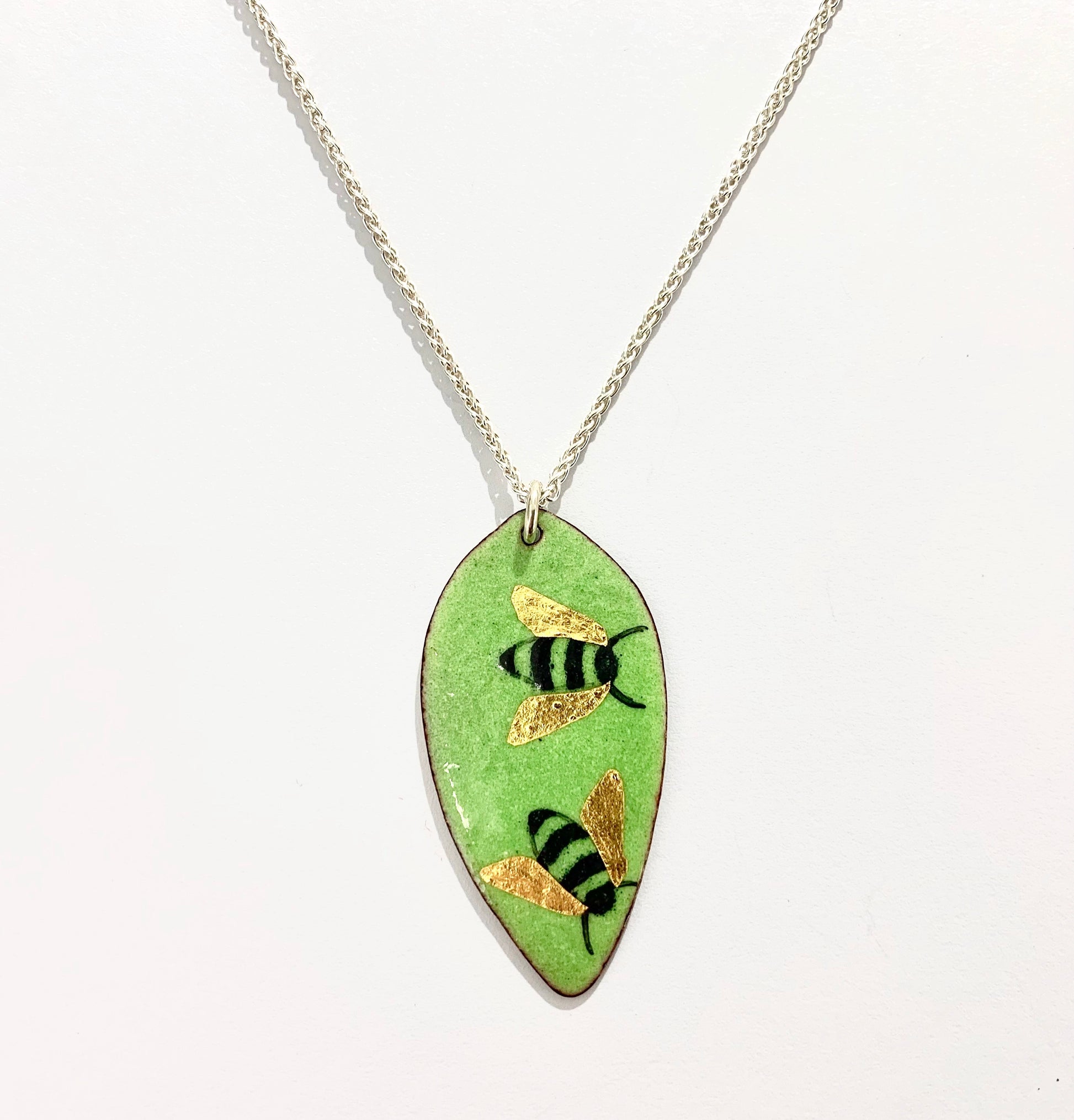 Enamelled green bee pendant with 24 karat gold detail by Harriet St Leger. Harriet takers her inspiration from natural forms like leaves, buds and pods.
