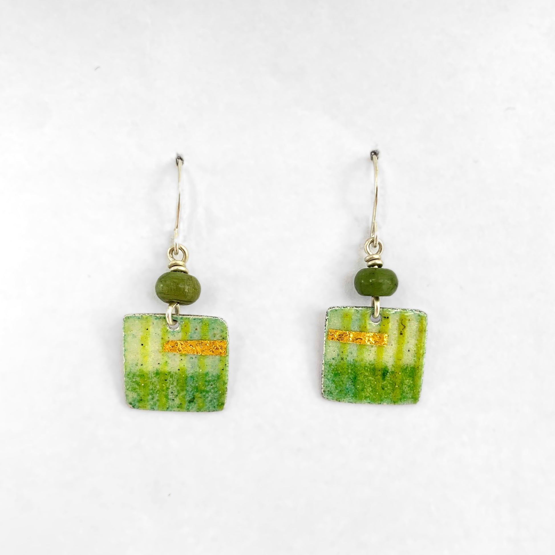 Green enamelled silver earrings by Nancy Pickard. Sterling silver ear wires with a green semi precious stone detail and golf leaf. The earrings measure 3.5cm in length.