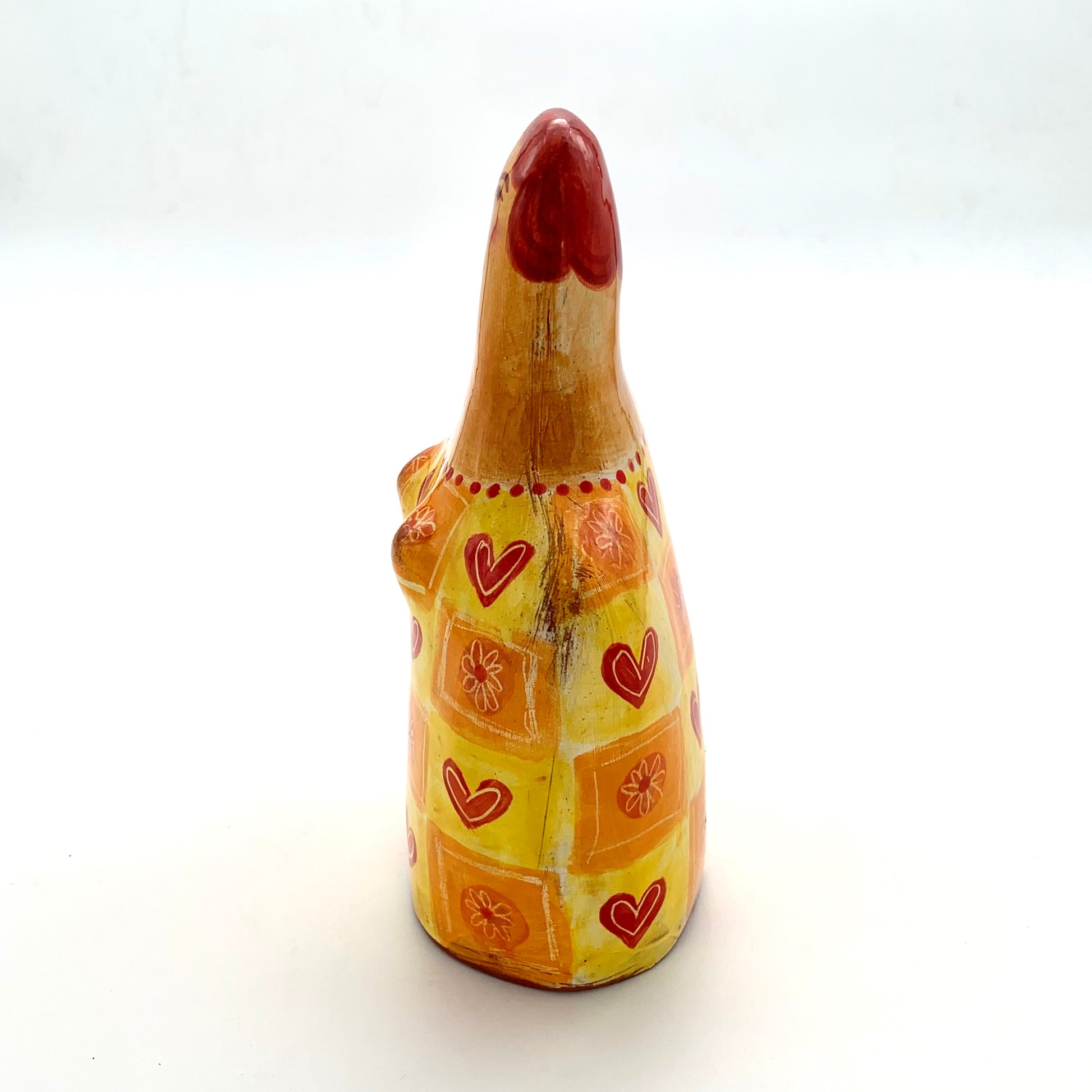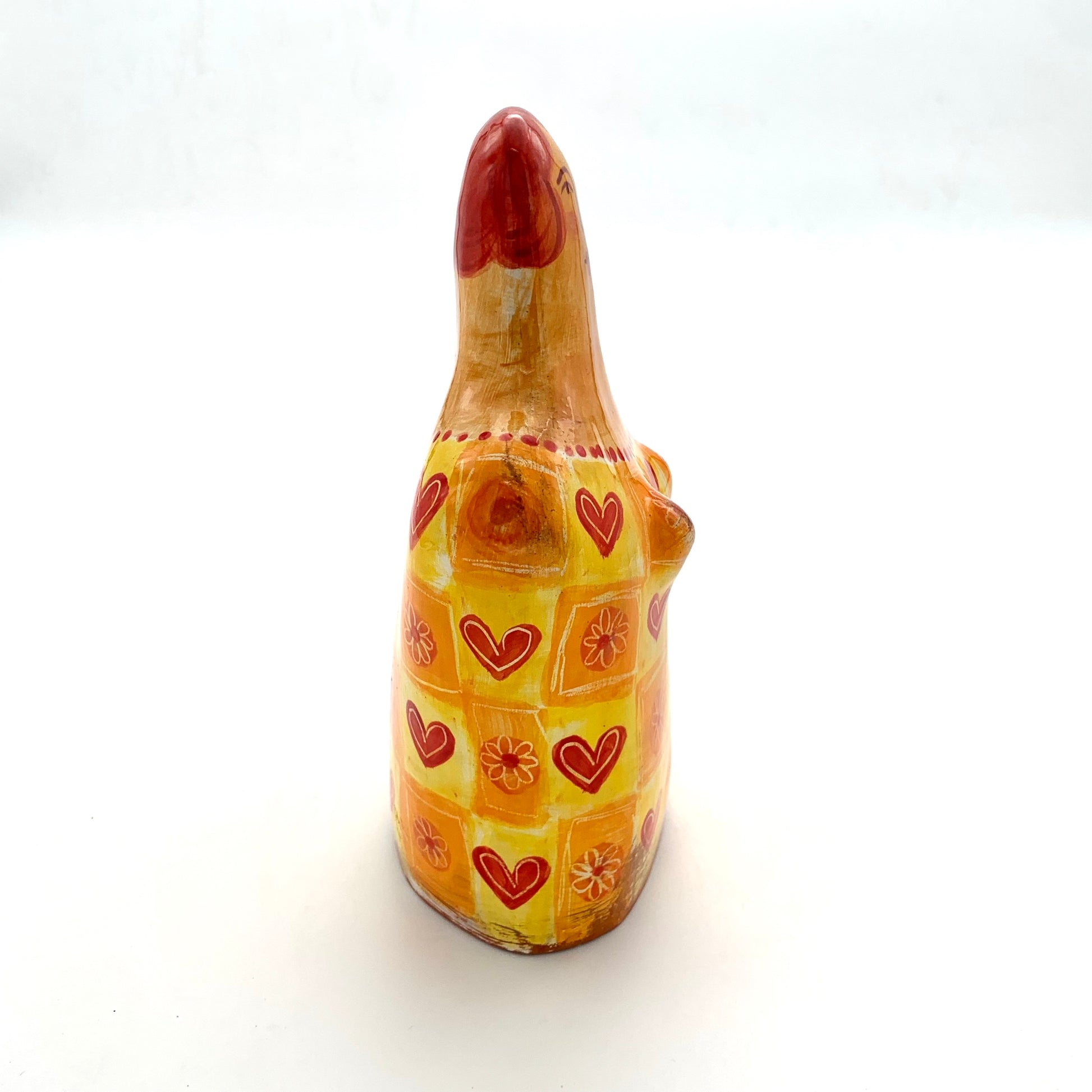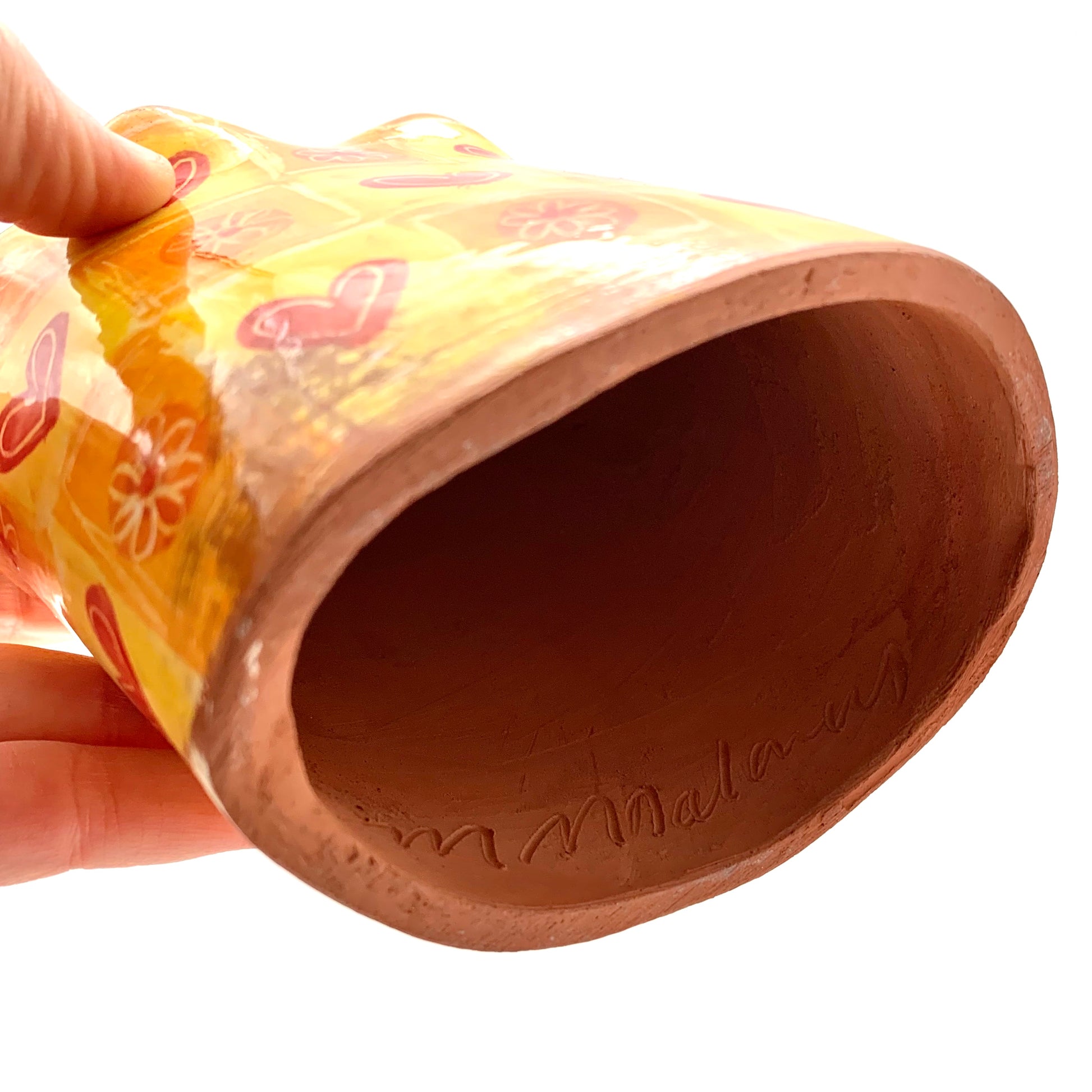 Heart and Flower Lady by Michelle Maloney. This wonderfully charming sculpture will bring a smile to anyone's face. With her wily gaze, luscious lips and prominent boobs she is such fun. Made from teracotta clay with a colourful design she would make the perfect addition to any shelf or table.