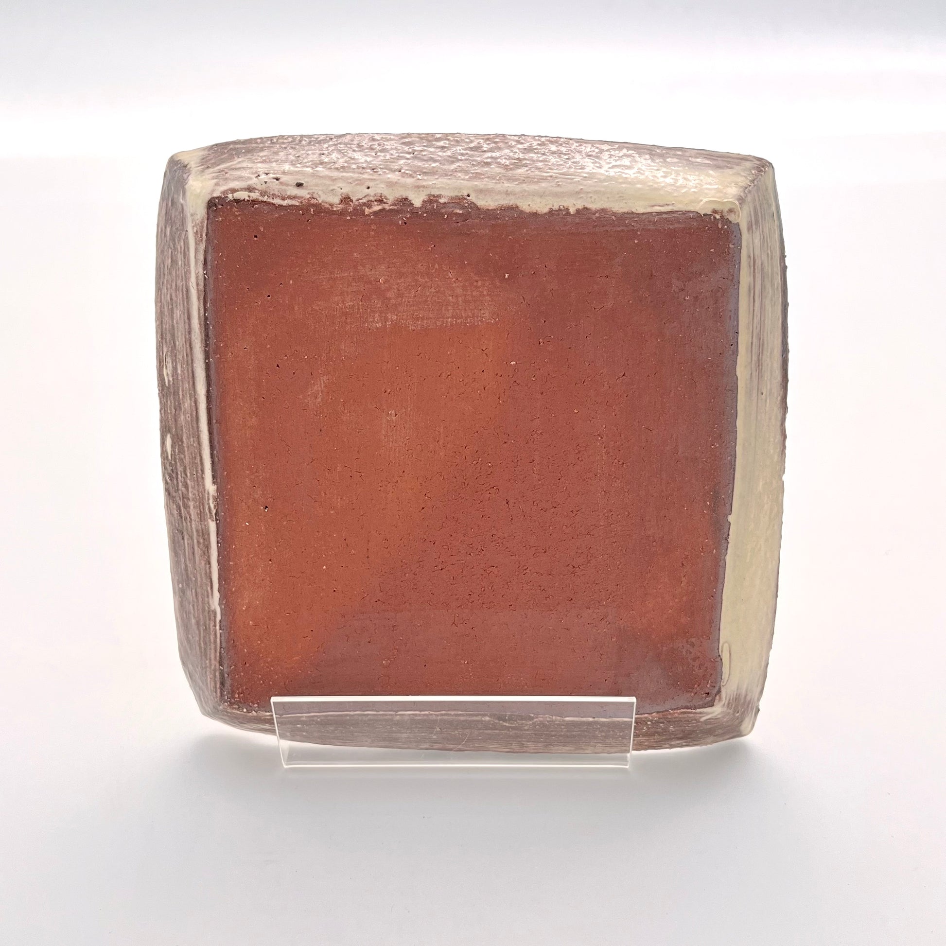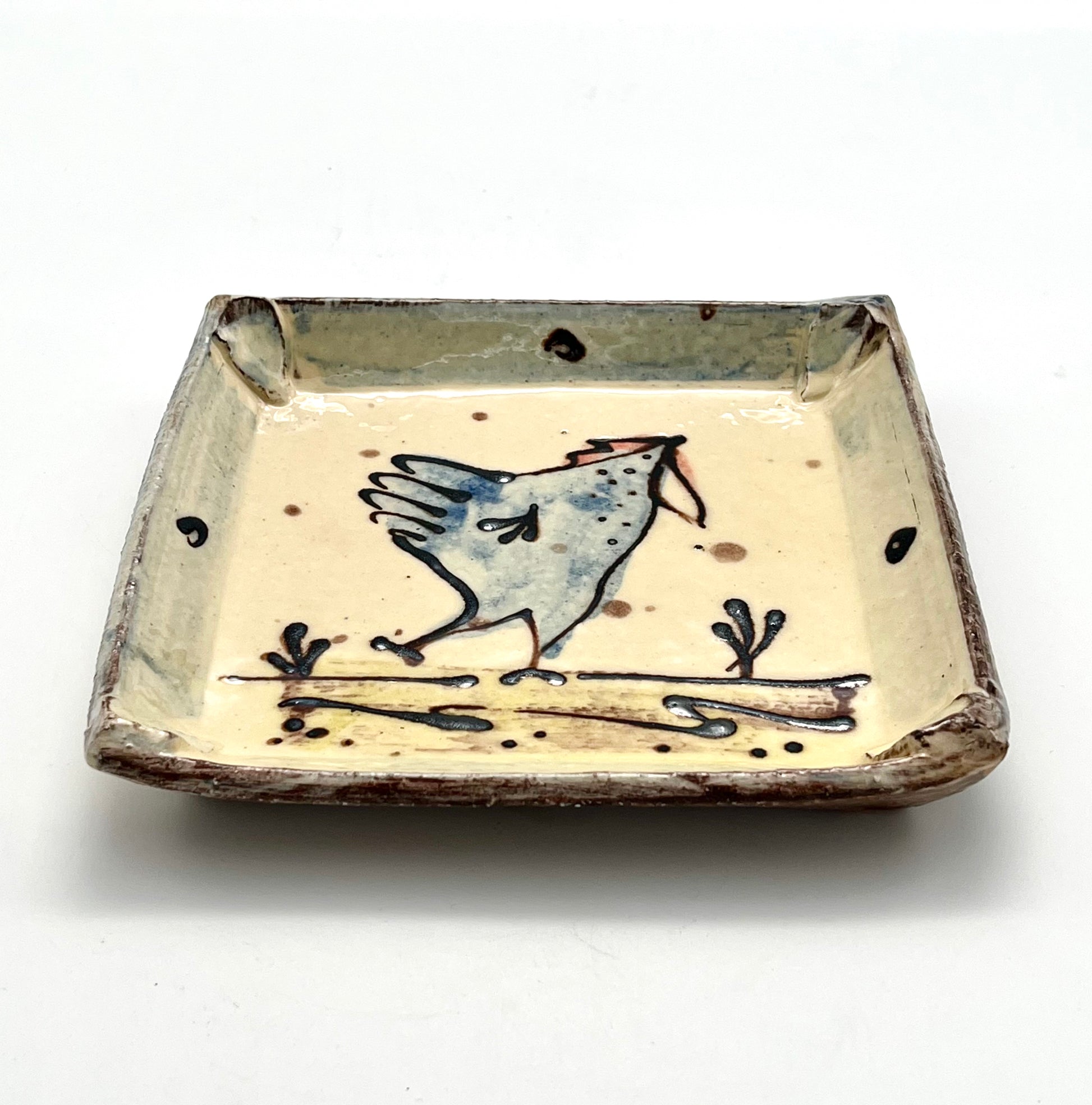 This earthenware rectanngular dish by Josie Walter is wheel-thrown and painted with a slip-decorated hen design.