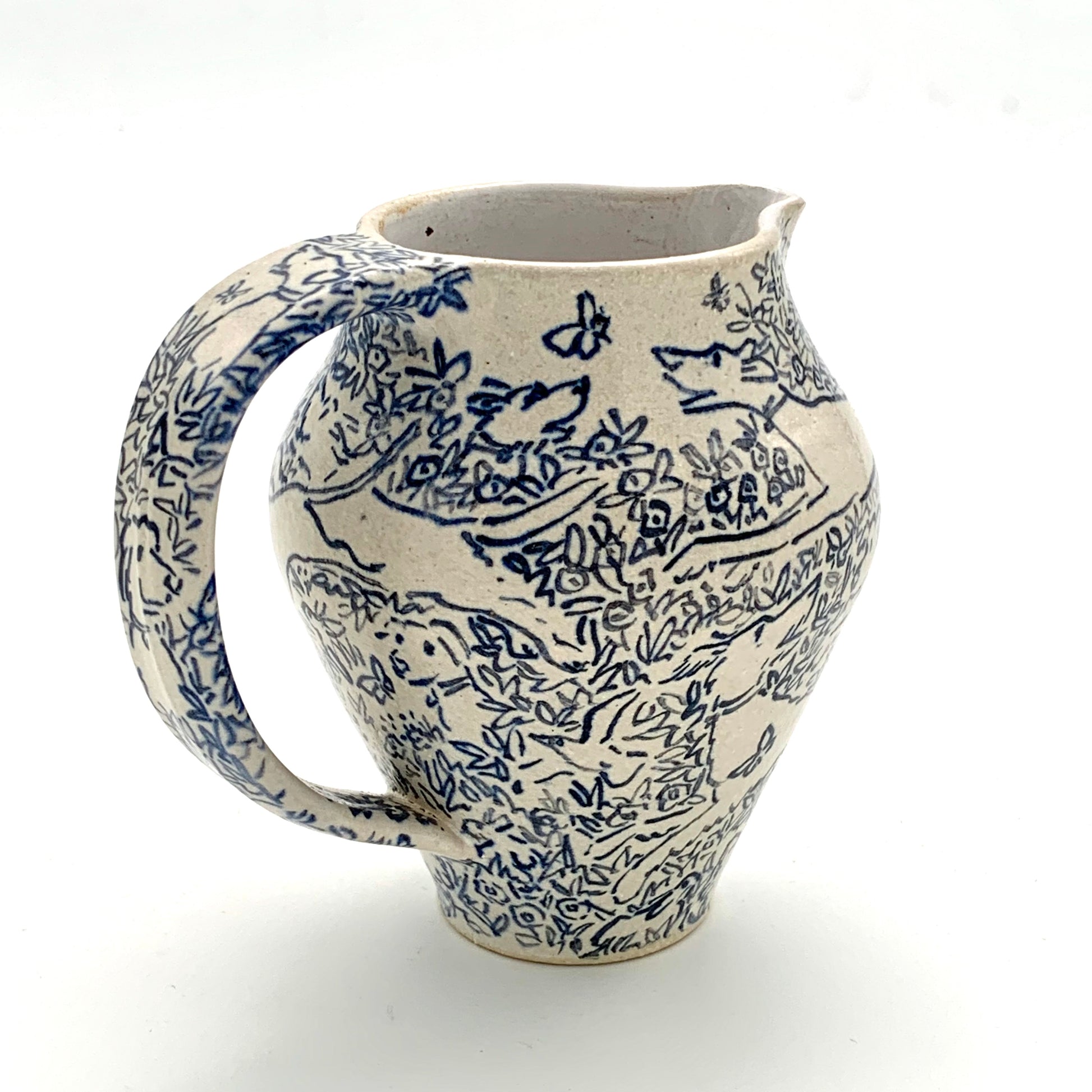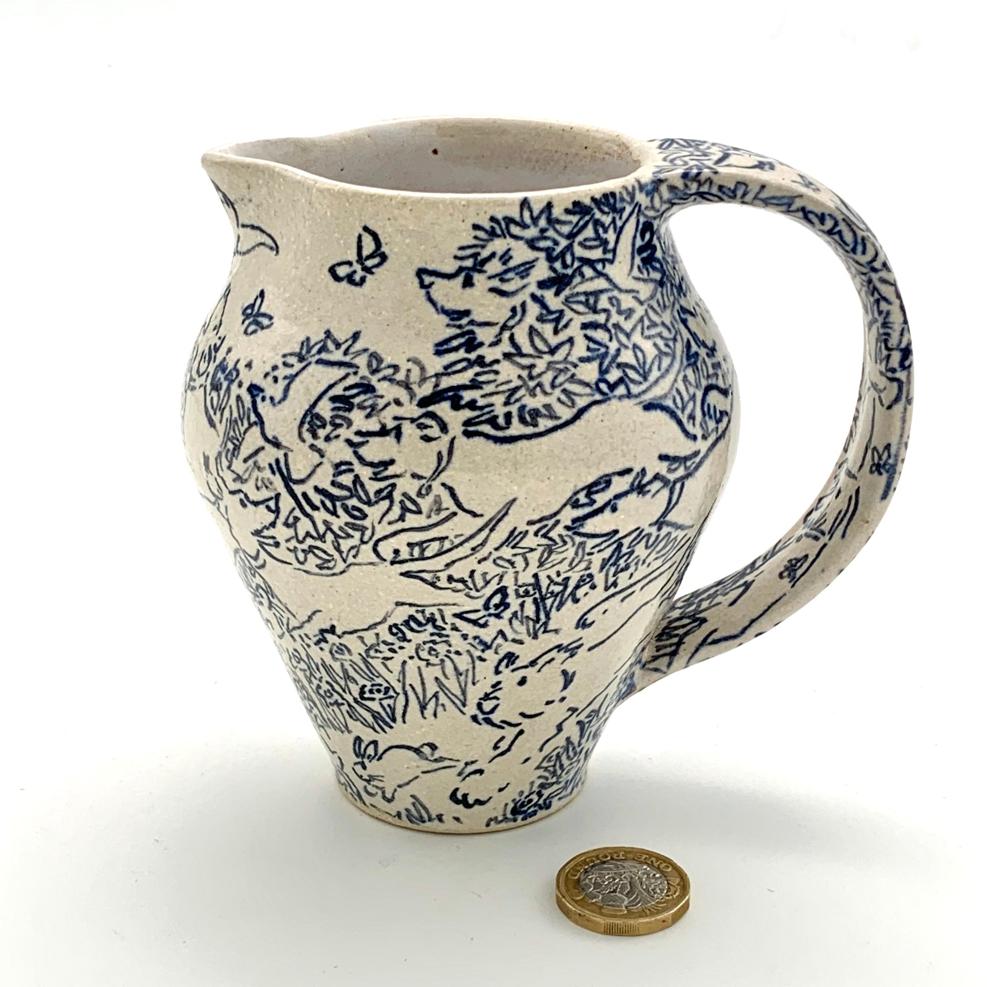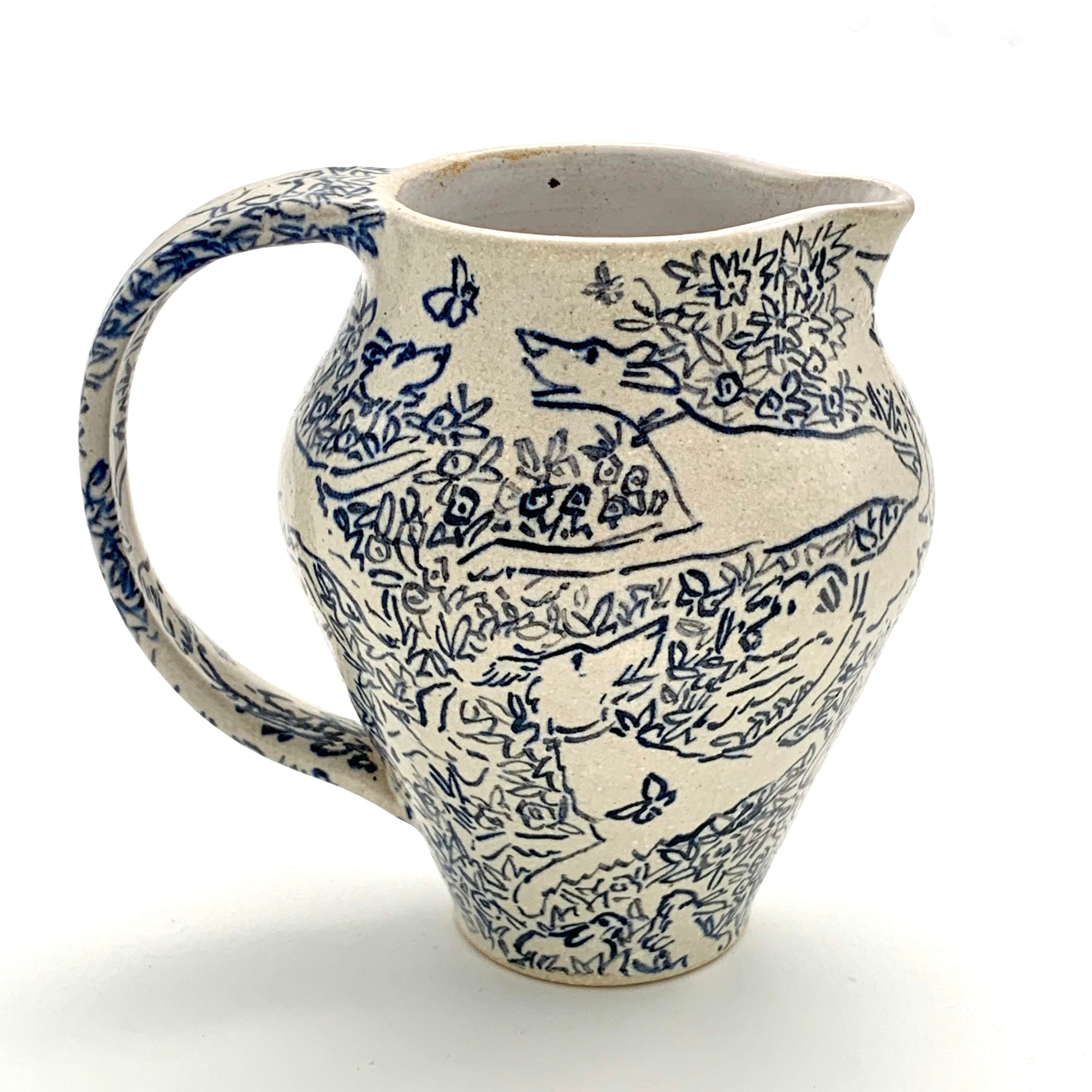 An exquisite thrown and hand painted stoneware jug by Josse Davis. This jug has a wonderful design of dogs out exploring the fields and meeting friends along the way!