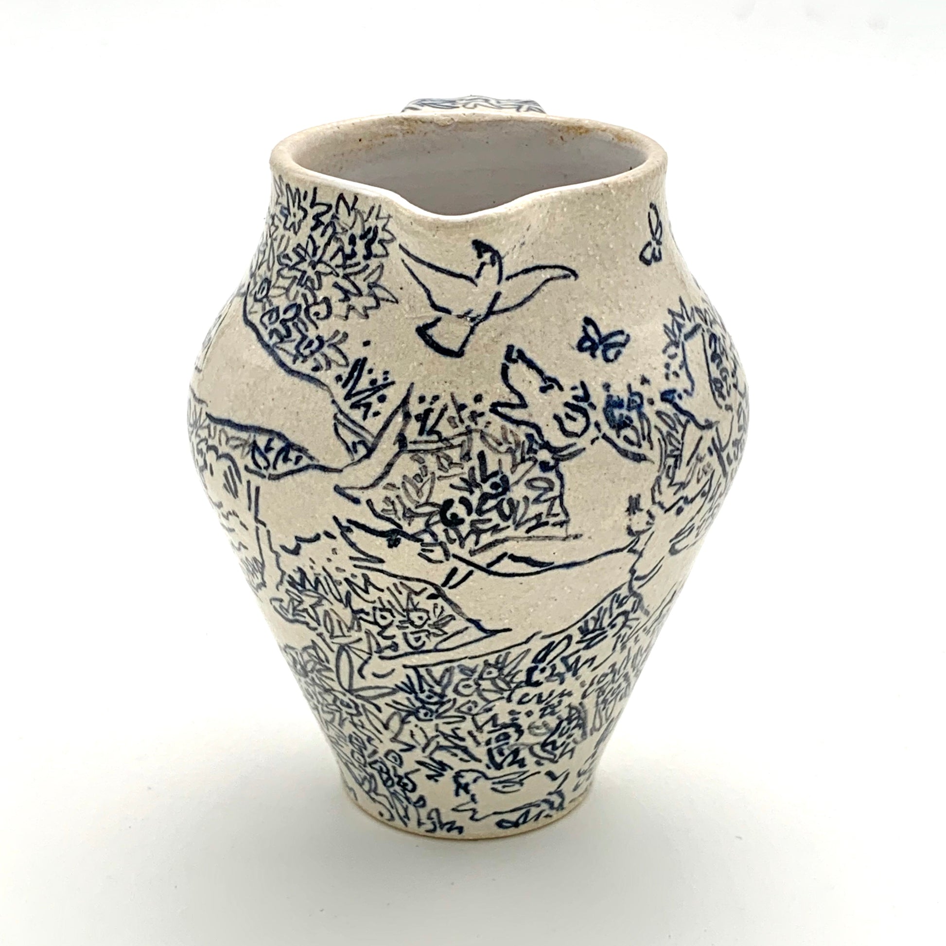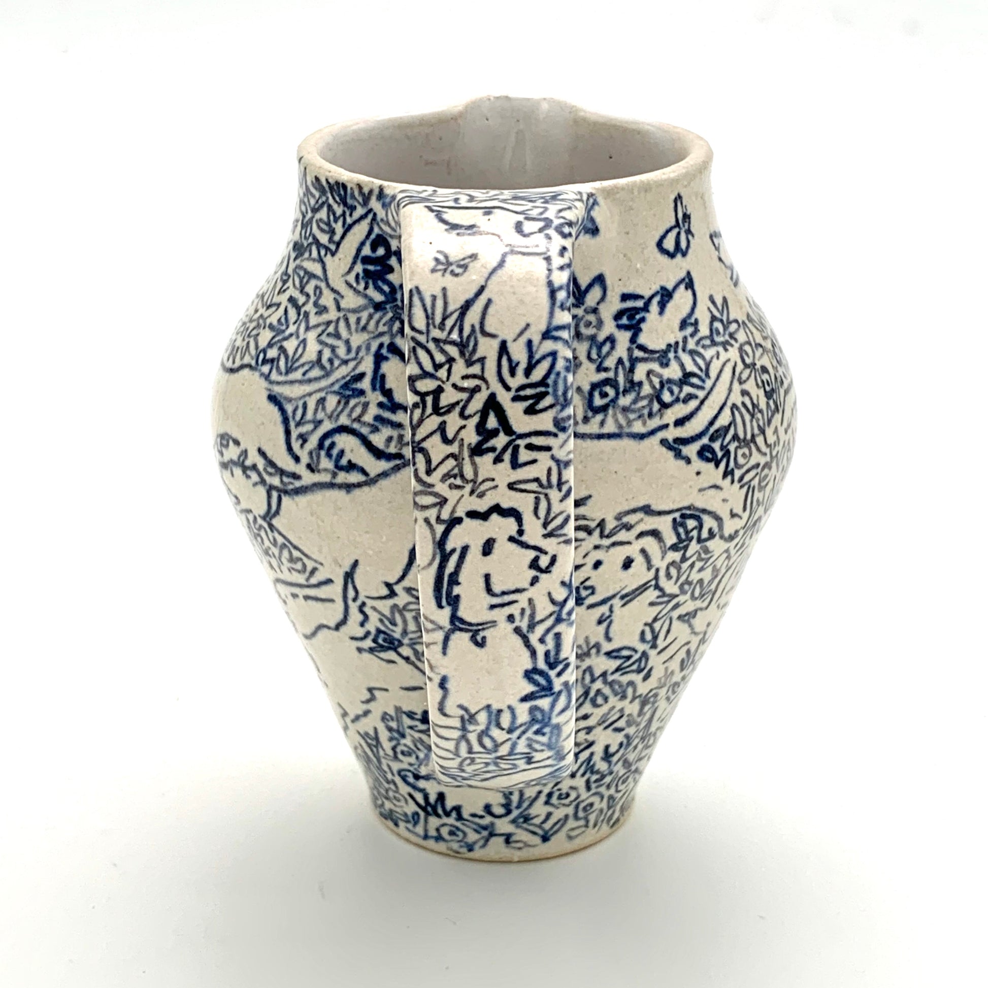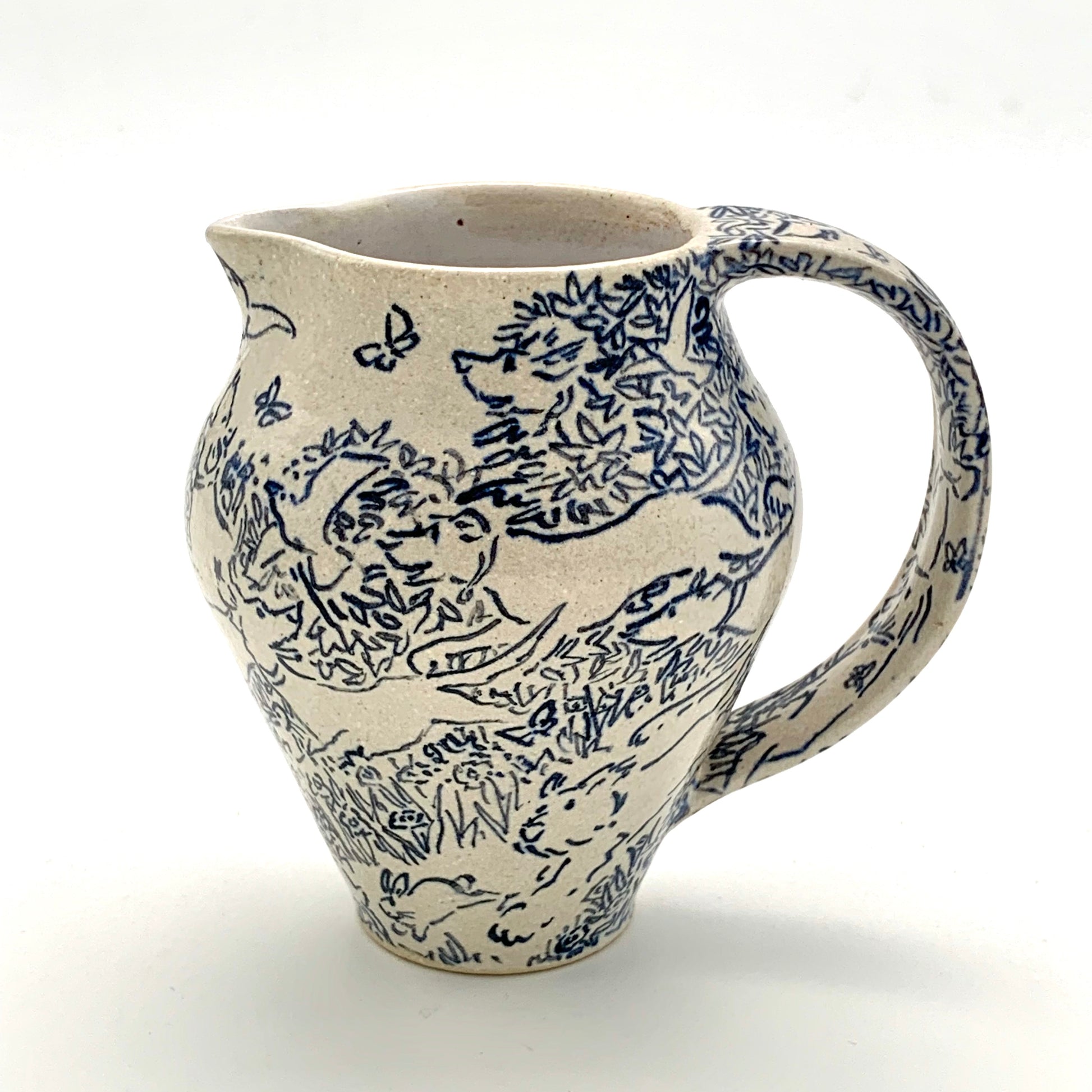 An exquisite thrown and hand painted stoneware jug by Josse Davis. This jug has a wonderful design of dogs out exploring the fields and meeting friends along the way!