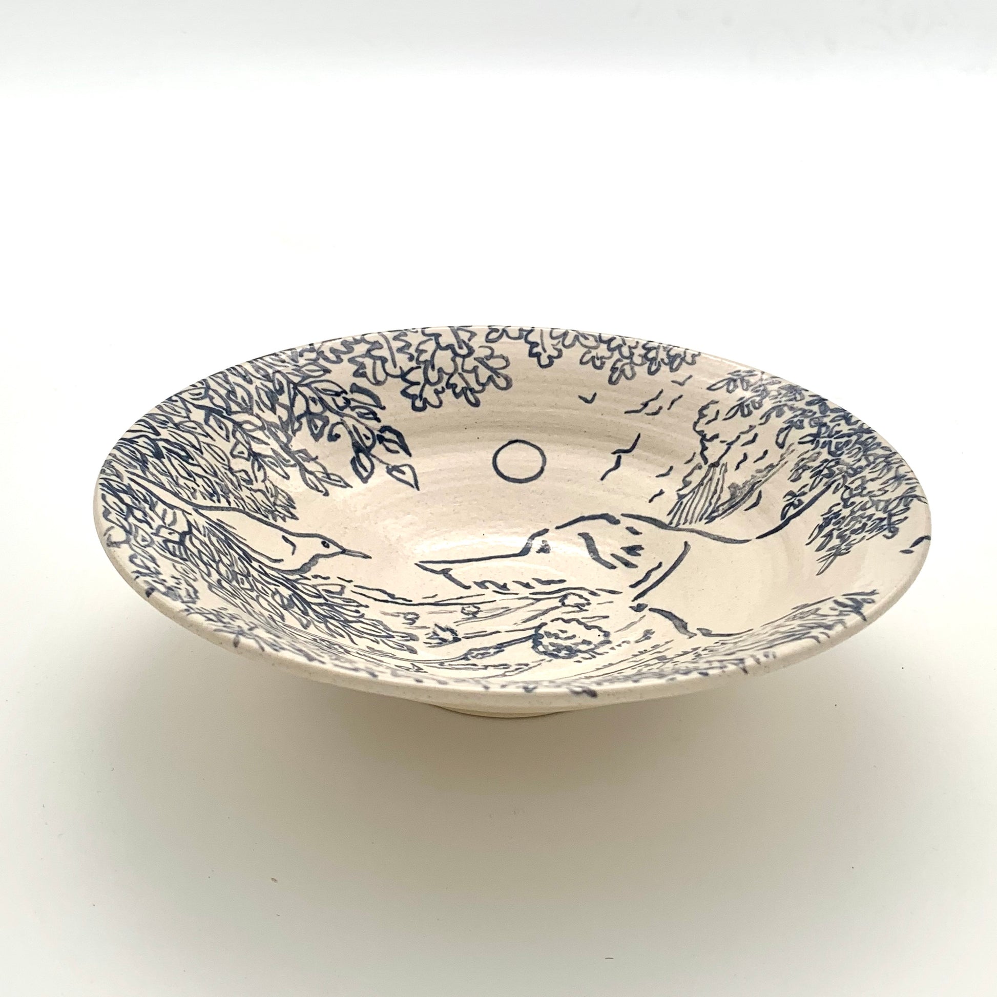 An exquisite thrown and hand painted stoneware shallow bowl by Josse Davis. This bowl has a wonderful design of dogs out exploring the fields and befriending whoever they meet.
