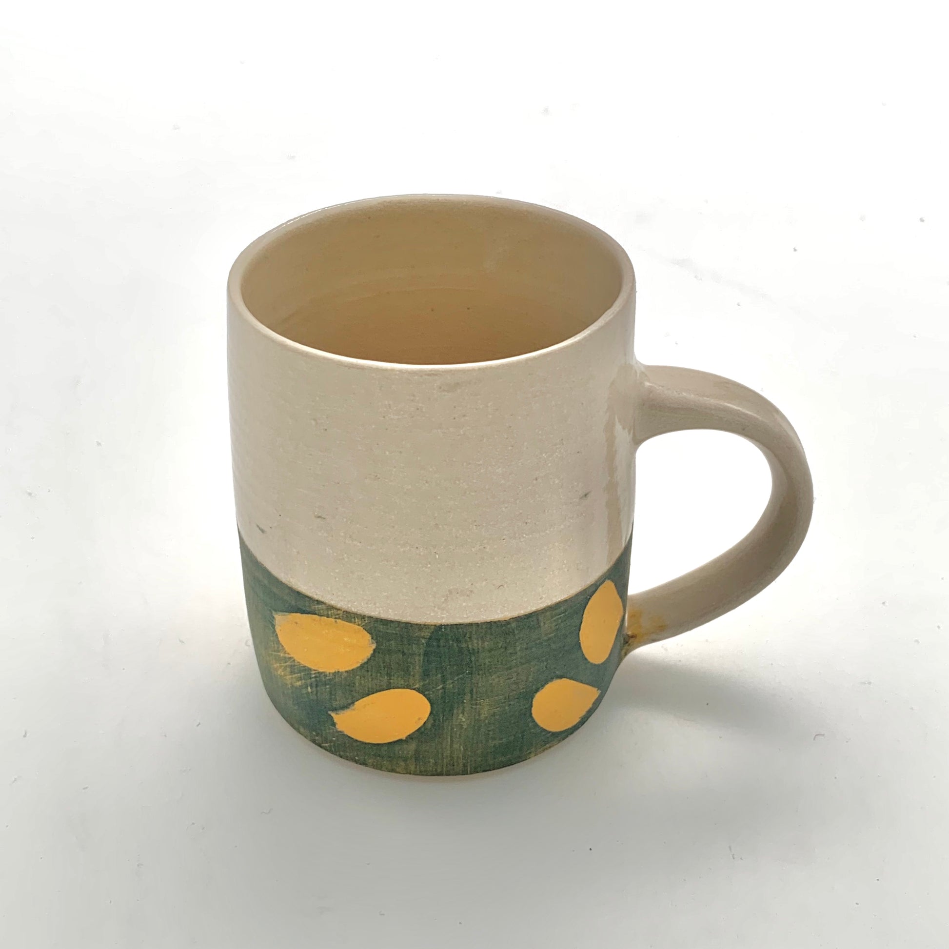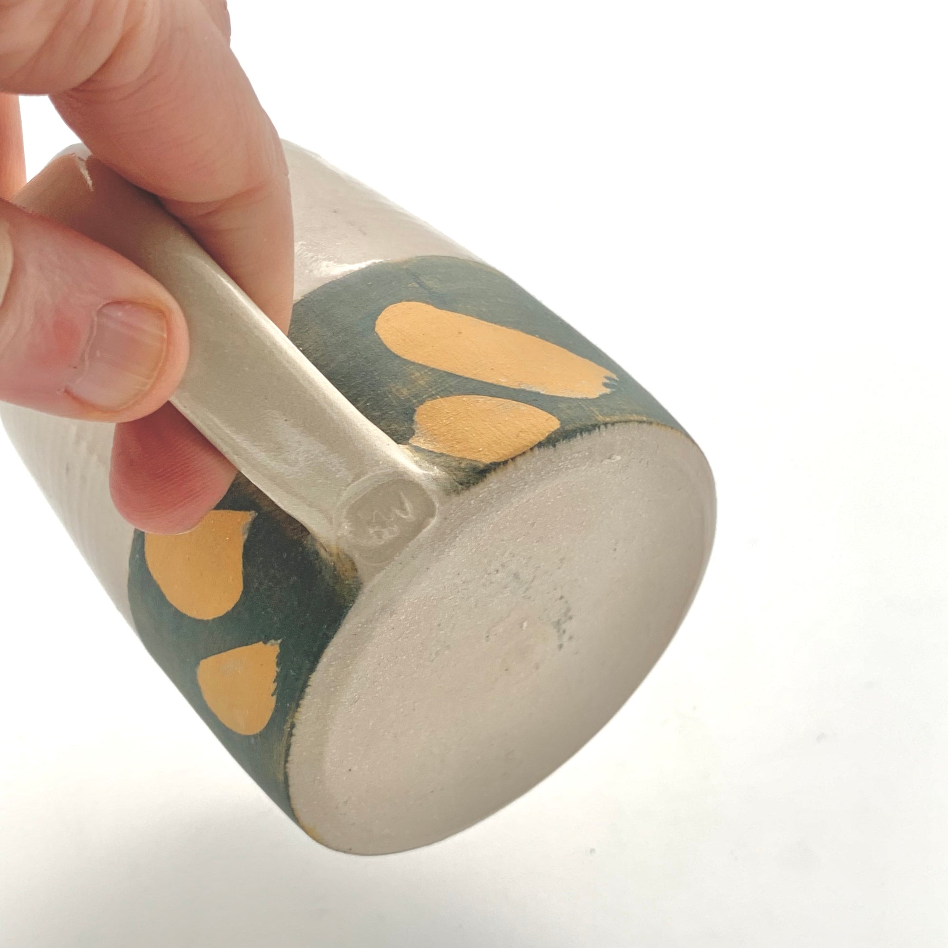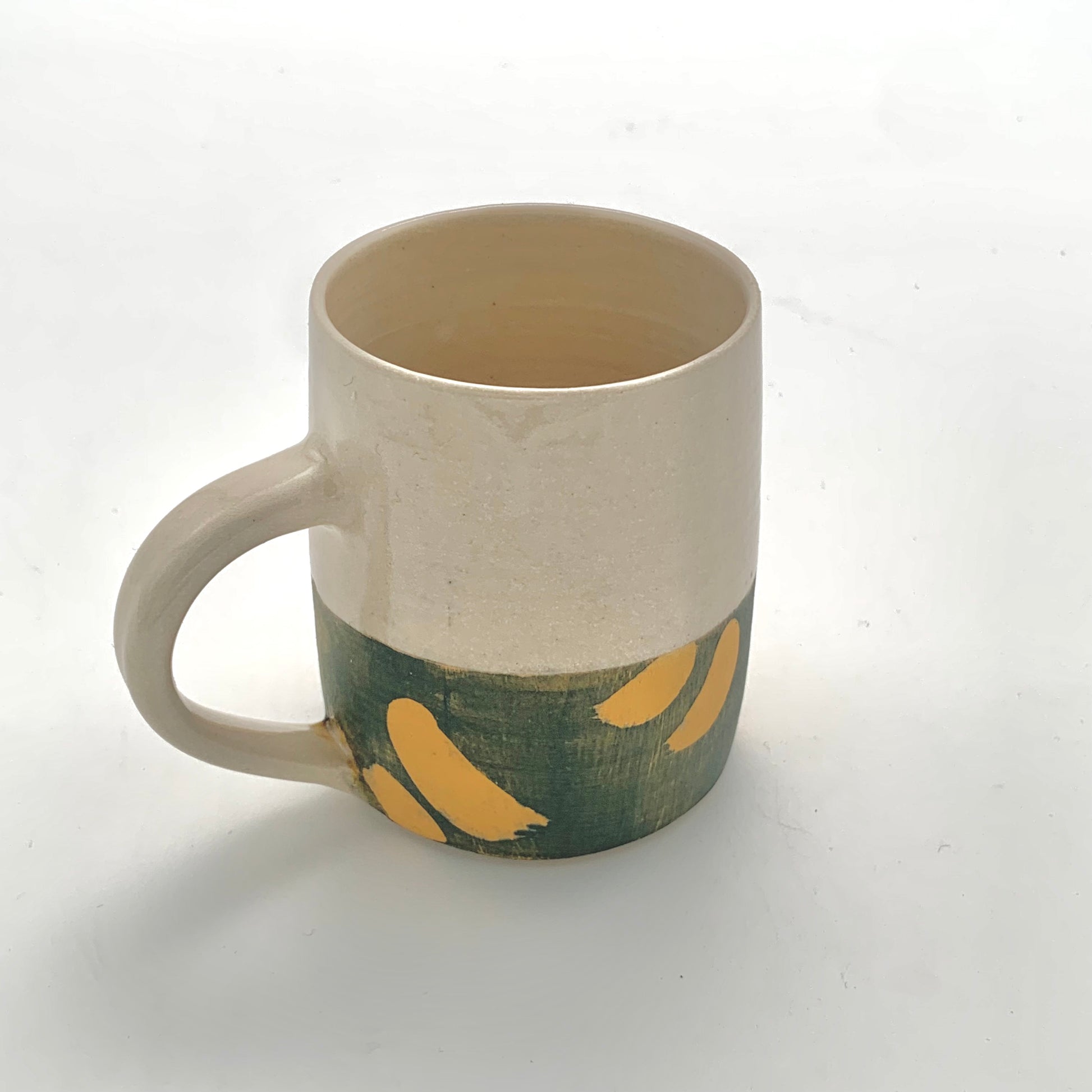 Decorated in Kate's ‘Ochre Brush’ design, the natural colour of the clay contrasts beautifully with the earthy green and yellow slip below. The lower half of the mug is unglazed but polished, producing a wonderfully soft tactile finish.