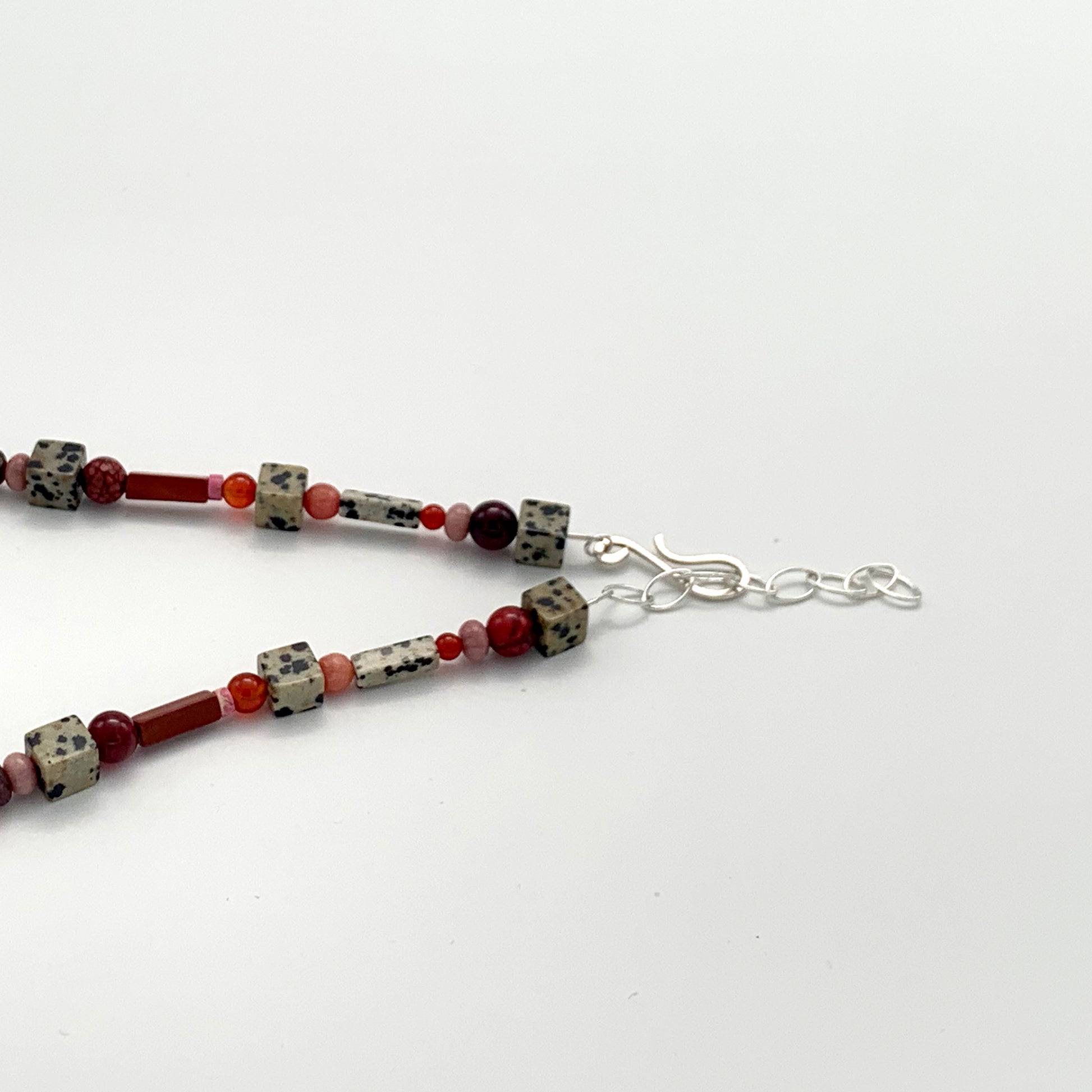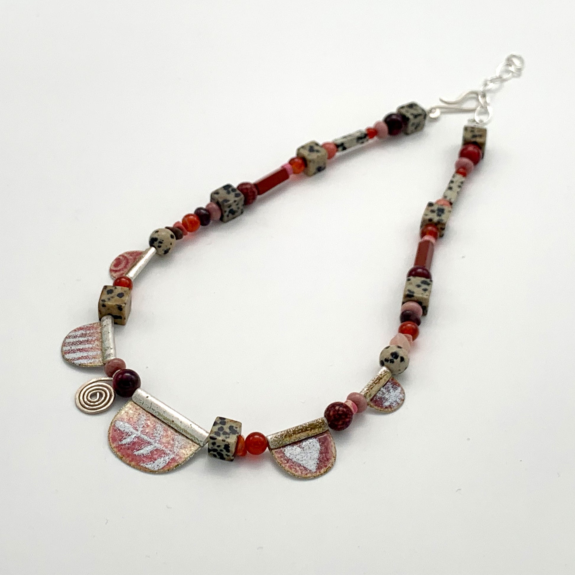 Enamel silver and semi precious stone pink and red necklace by Nancy Pickard. This necklace has a sterling Silver adjustable clasp making the necklace between 17 and 19 inches long.