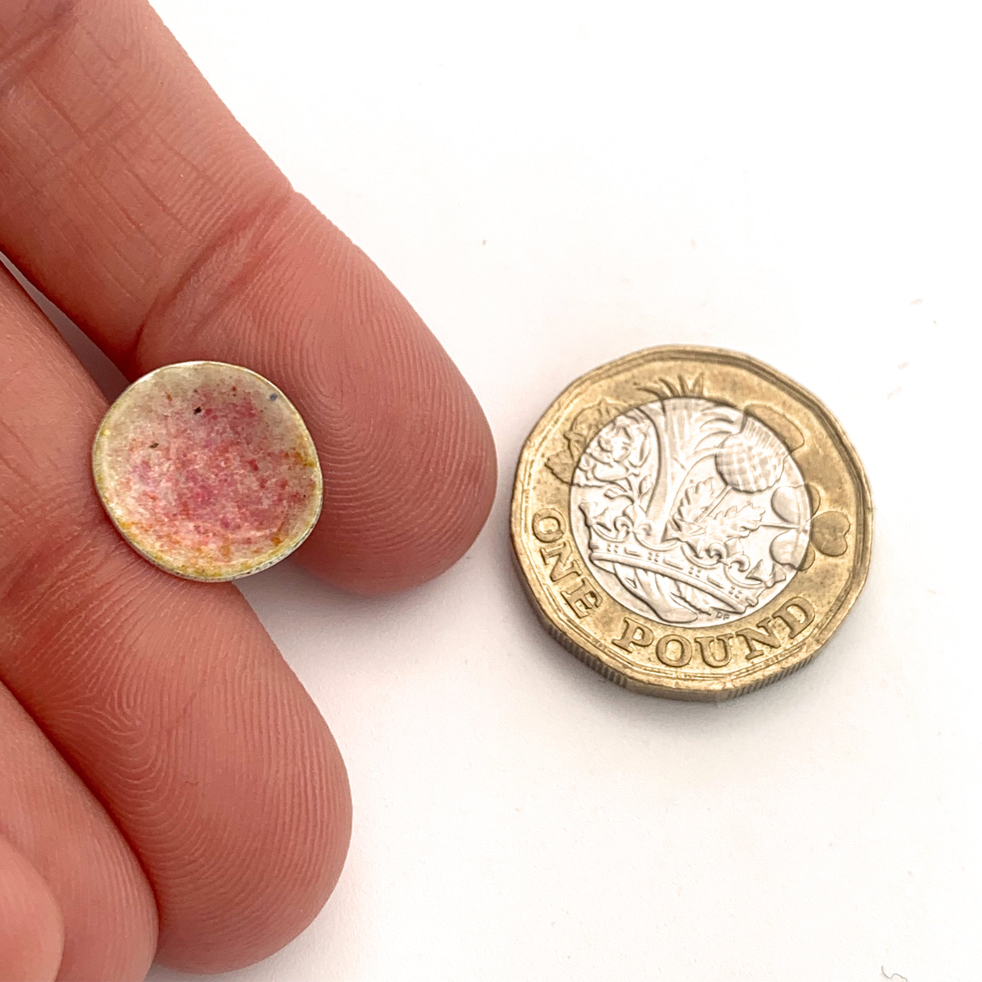 Pink enamelled concave stud earrings by Nancy Pickard. Sterling silver. The circles diameter measure 1.2cm.