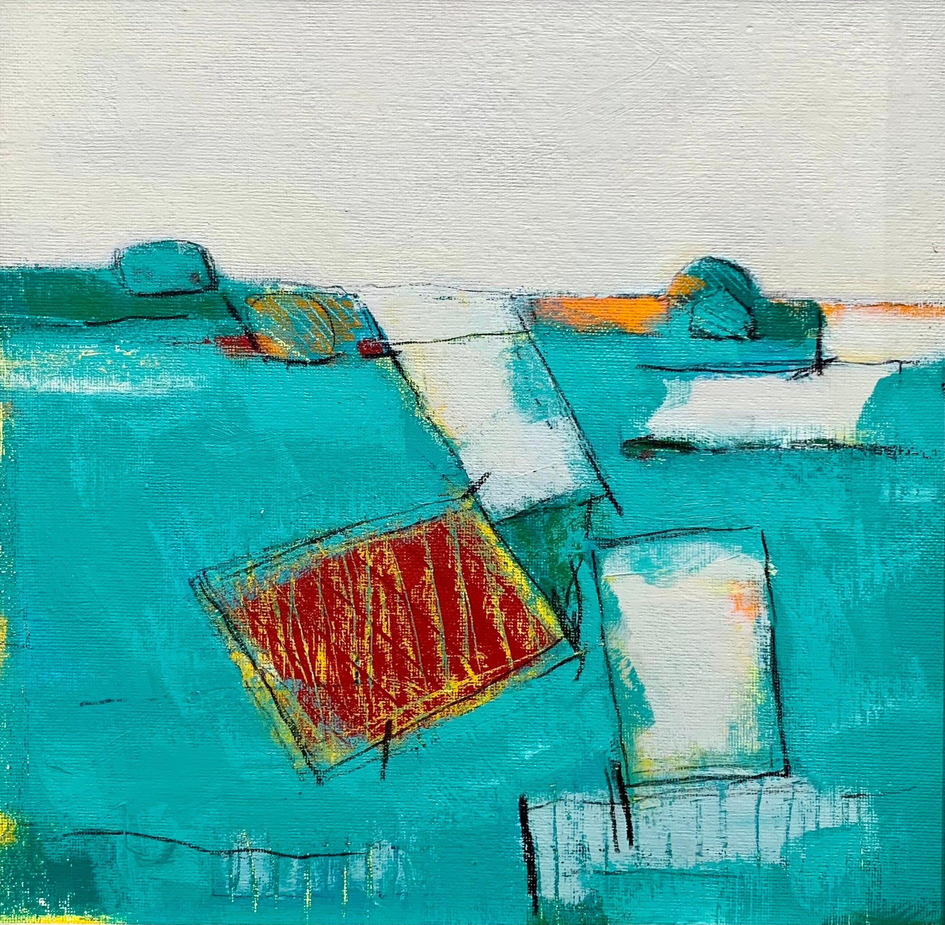 Colour and pattern are what excite David as he tries to create a balance between what he sees, what he recollects and the wish to construct something more than simple representation. There is always a tension between the flatness of the canvas and representation. He has been exploring combining aerial perspective with topographical views.