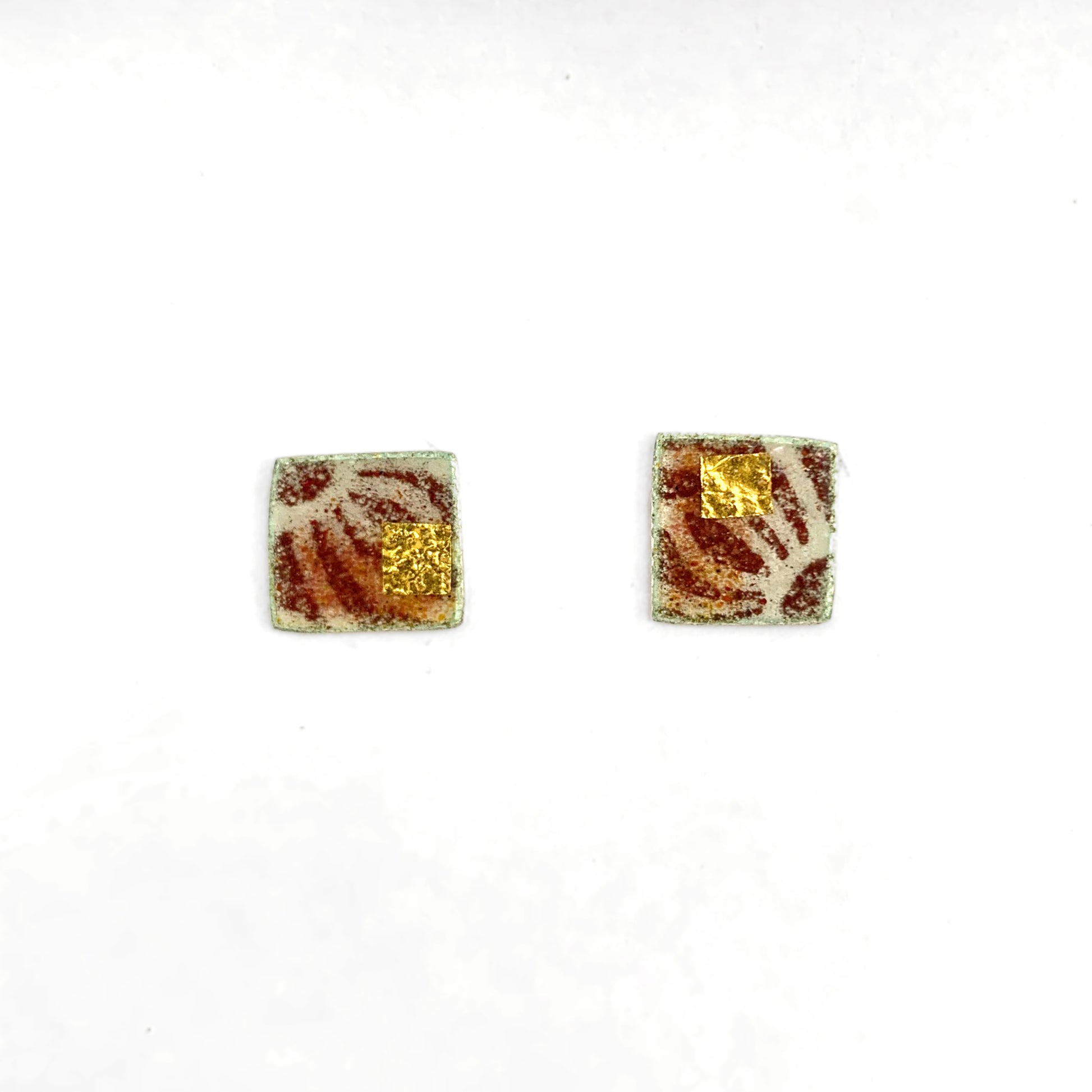Red stud earrings by Nancy Pickard. Sterling silver with gold leaf detail. The earrings measure approx 1cm x 1cm.