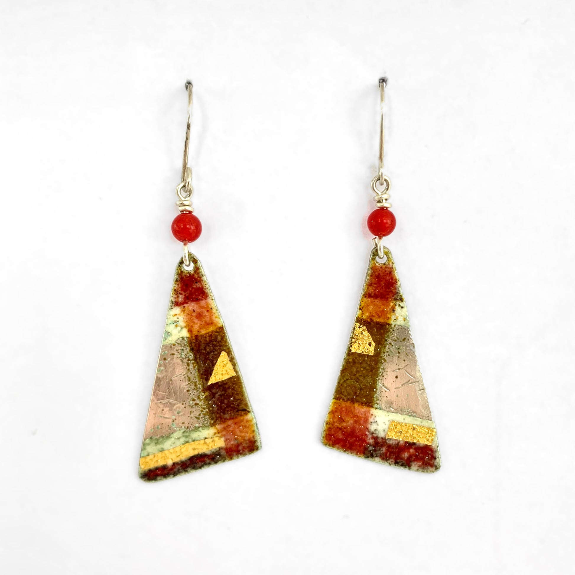 Red enamelled silver earrings by Nancy Pickard. Sterling silver ear wires with a red semi precious stone detail and golf leaf. The earrings measure 6cm in length.