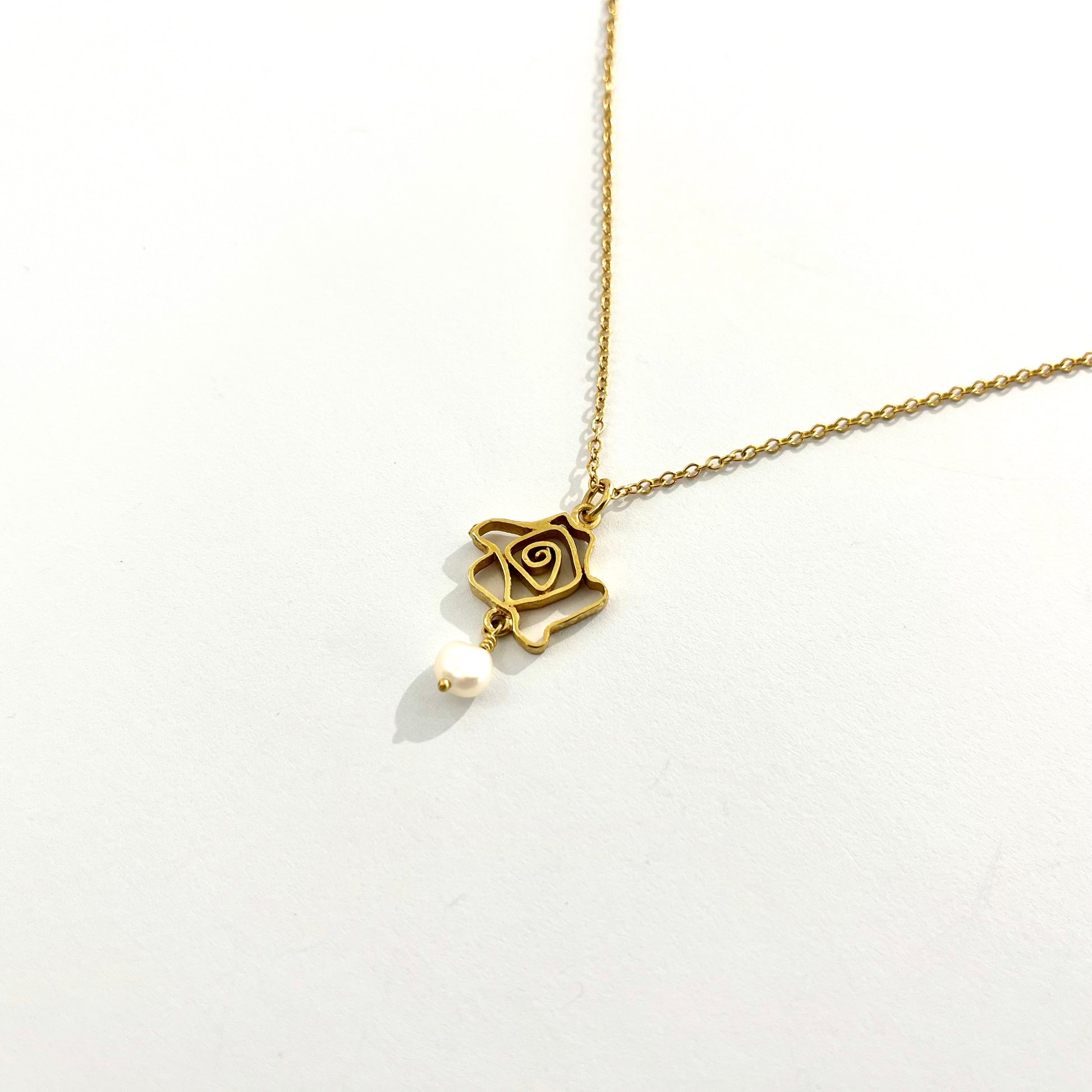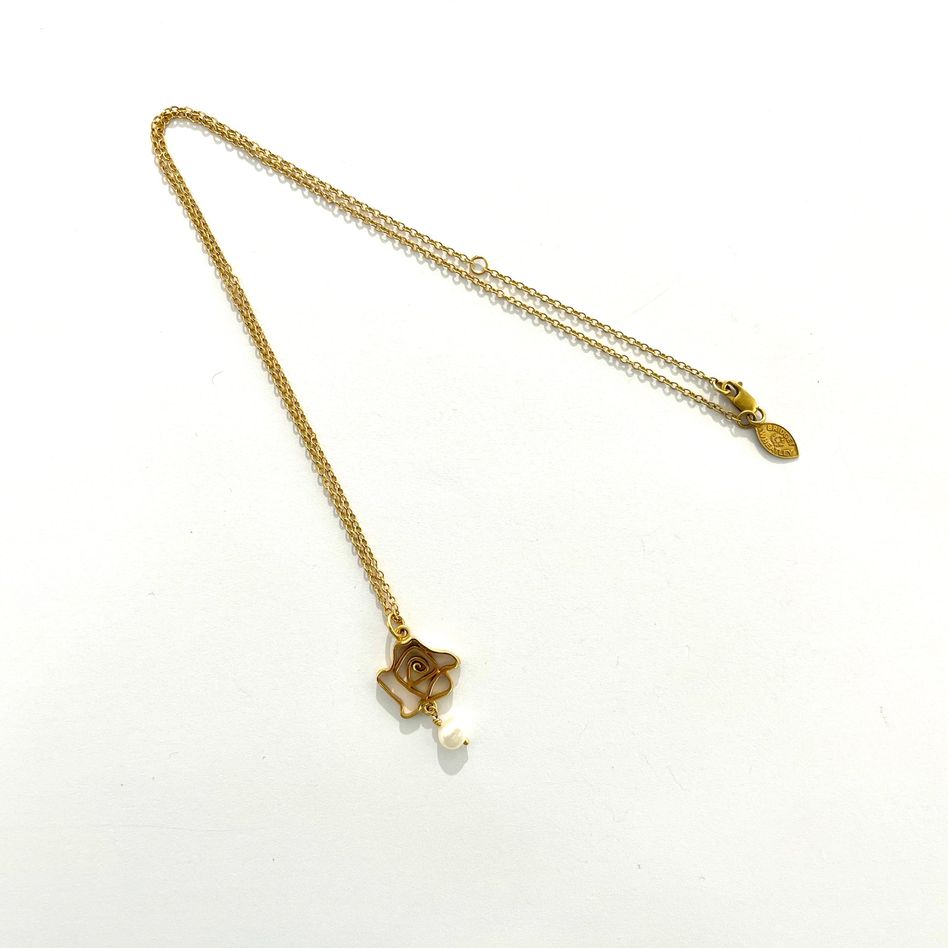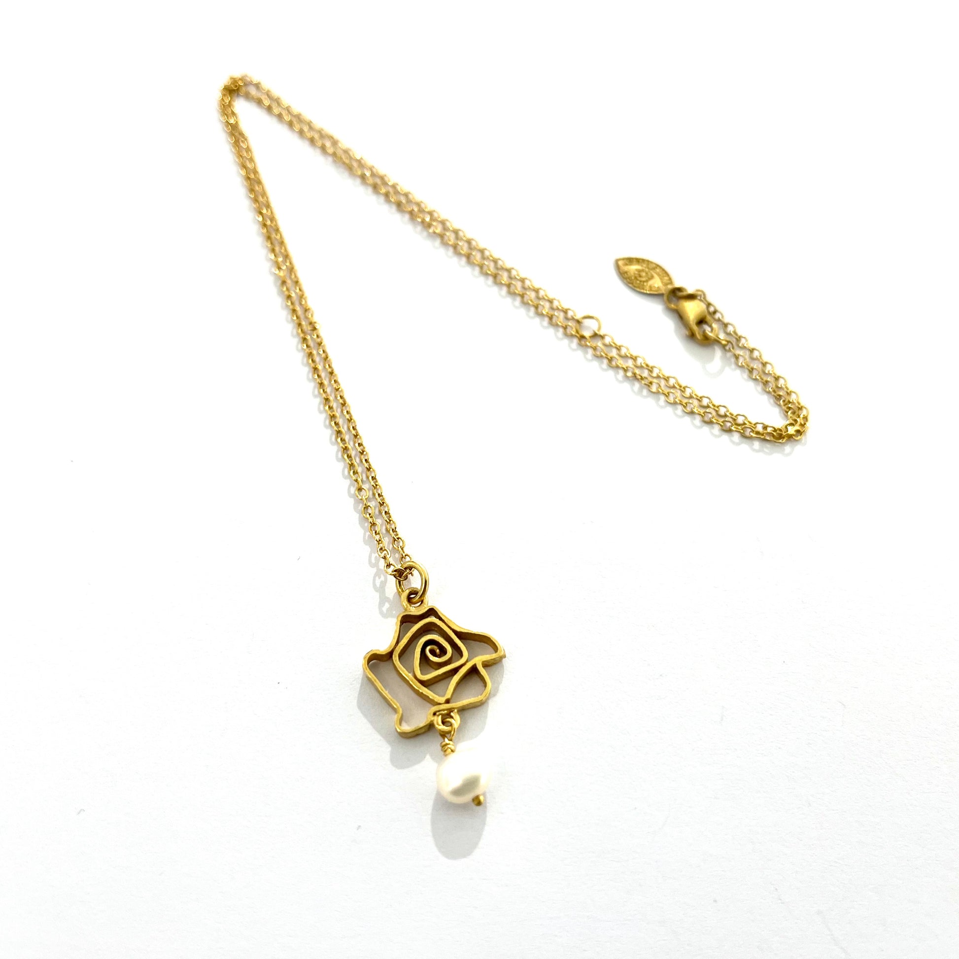 A stylised and bold rose design on a trace chain by Bridget Wheatley with a freshwater pearl drop.