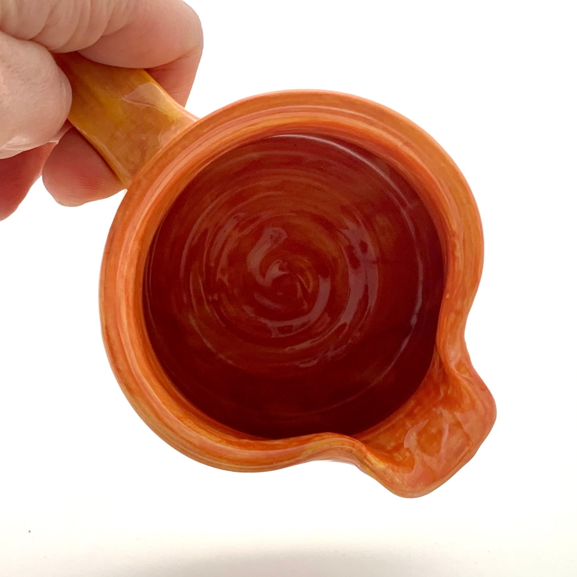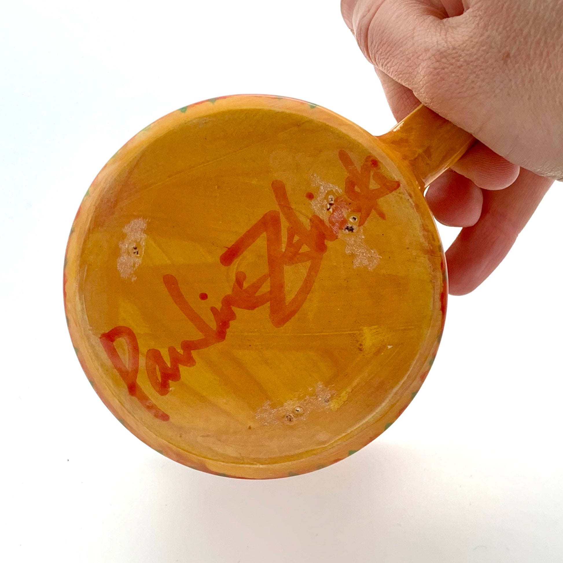 A small orange, yellow and green striped jug by Pauline Zelinski.