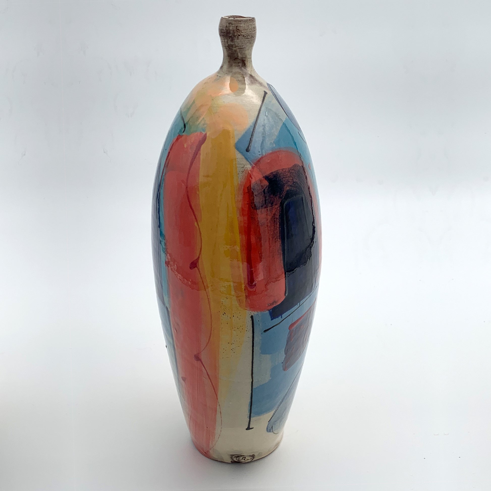 This gorgeous ceramic vessel by Richard Wilson is wheel thrown and decorated with wonderful brightly coloured slips. The gorgeous gestural marks using different brushes create an abstract design, inspired by the ebb and flow of the sea at West Bay. The wonderful shape gives a large canvas area for Richard's wonderful mark making.