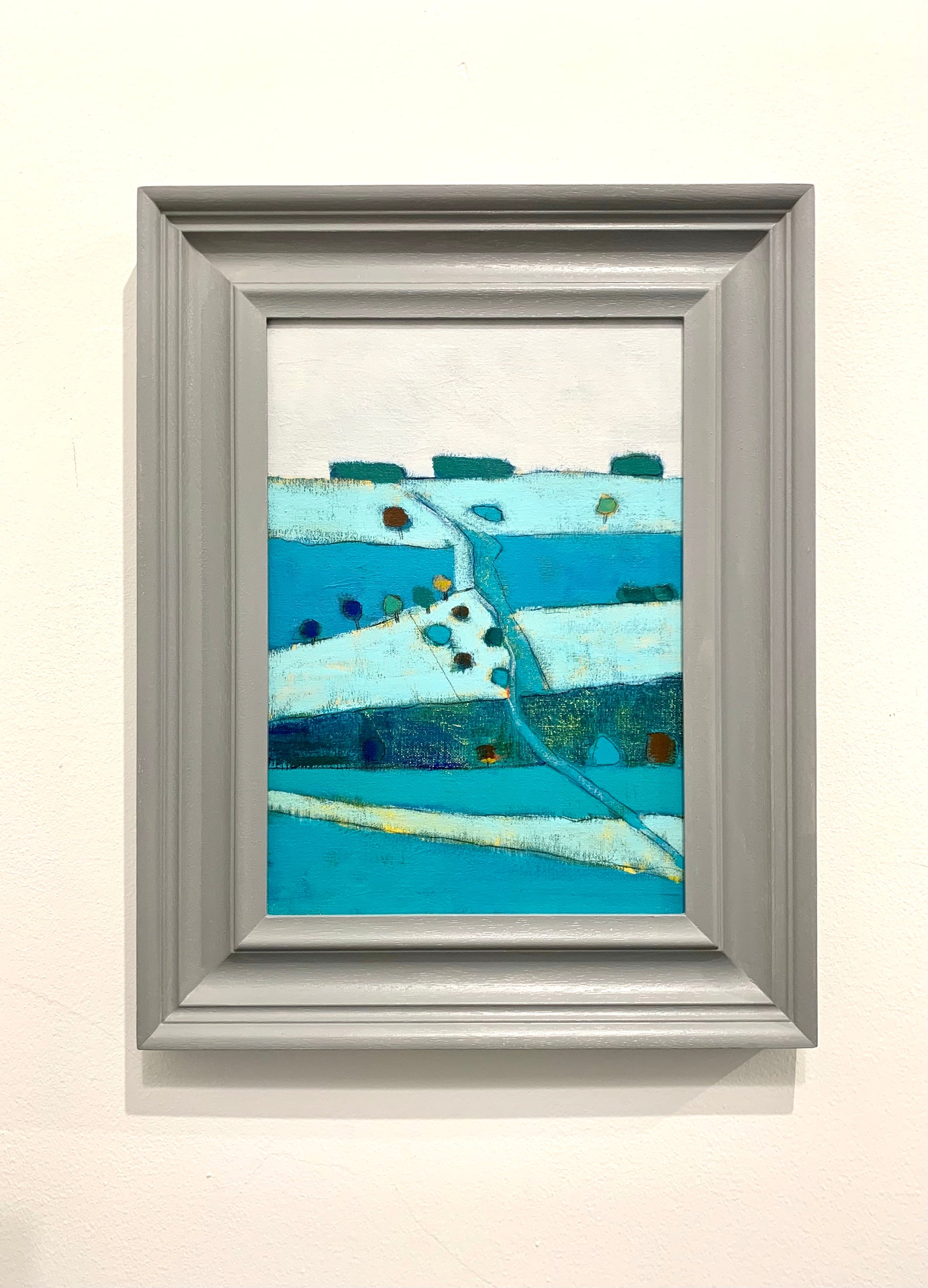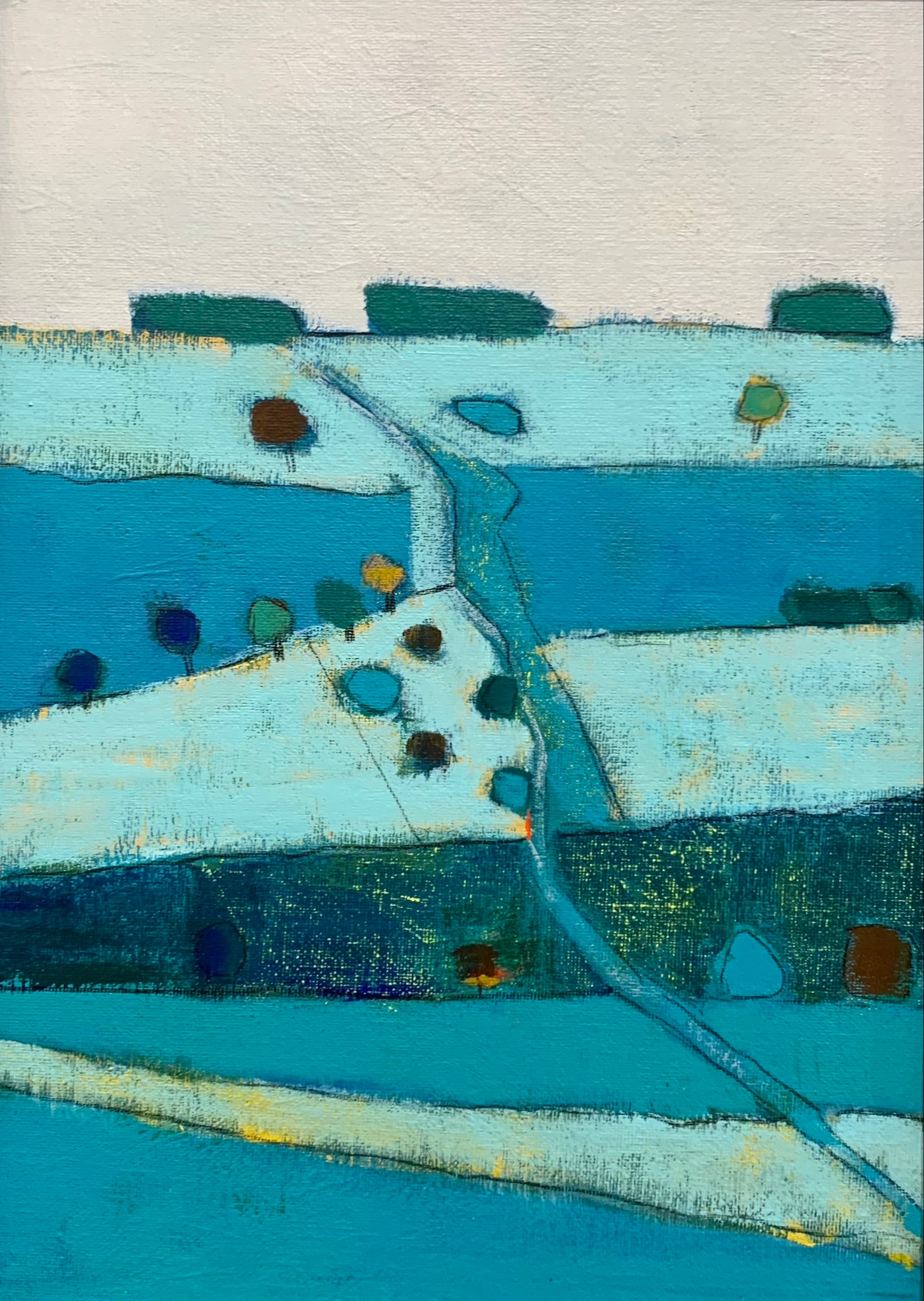 Colour and pattern are what excite David as he tries to create a balance between what he sees, what he recollects and the wish to construct something more than simple representation. There is always a tension between the flatness of the canvas and representation. He has been exploring combining aerial perspective with topographical views.