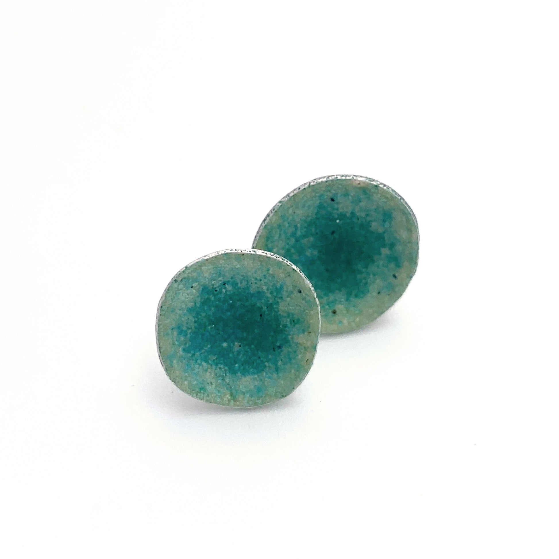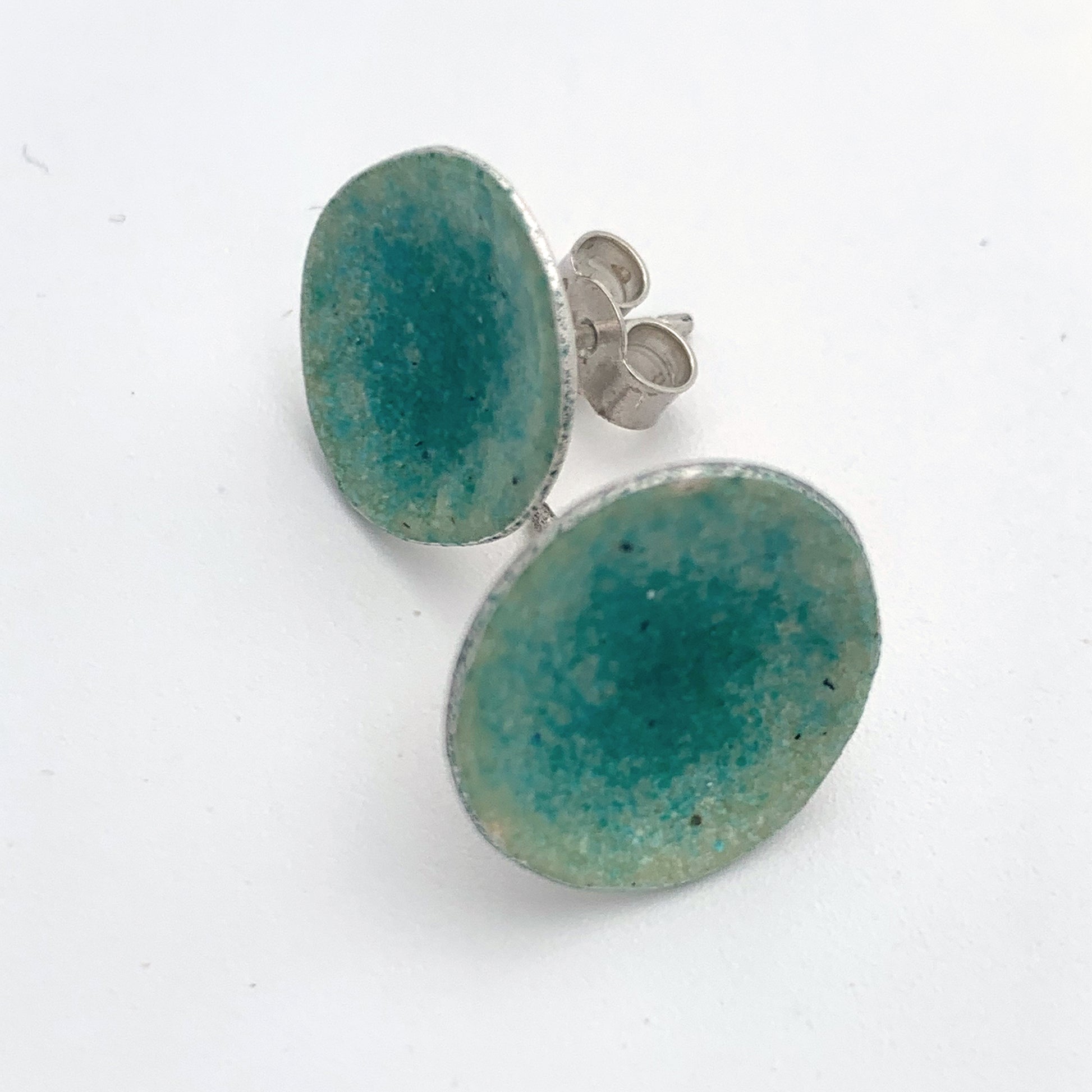 Turquoise enamelled concave stud earrings by Nancy Pickard. Sterling silver. The circles diameter measure 1.2cm.