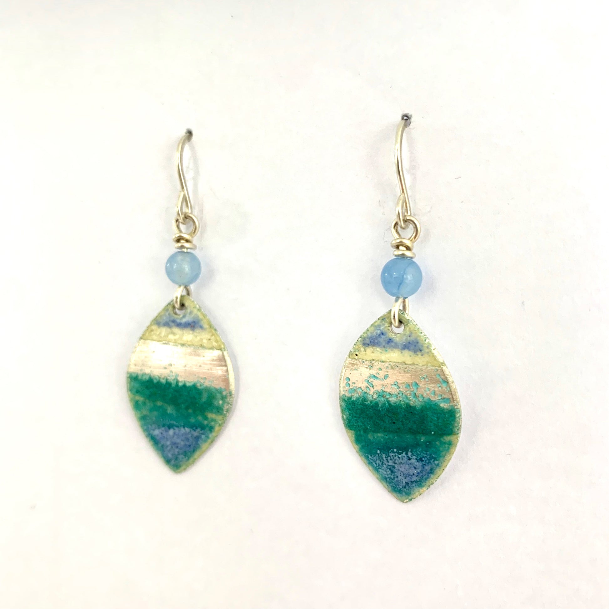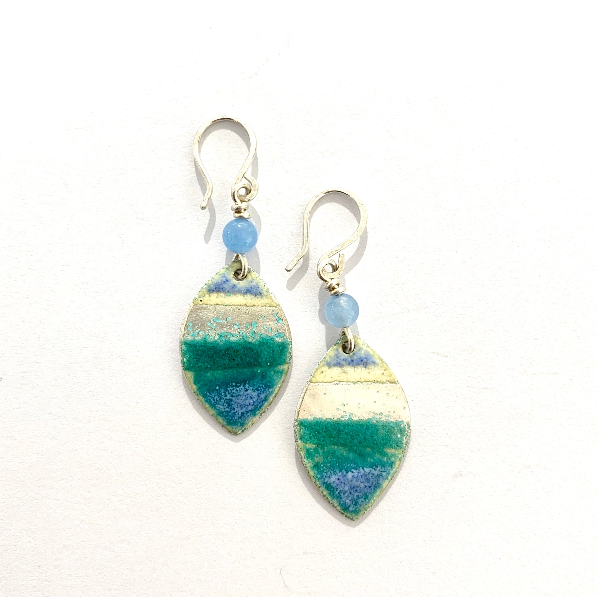 Turquoise enamelled silver earrings by Nancy Pickard. Sterling silver ear wires and a blue semi precious stone detail. The earrings measure 4.3cm in length.