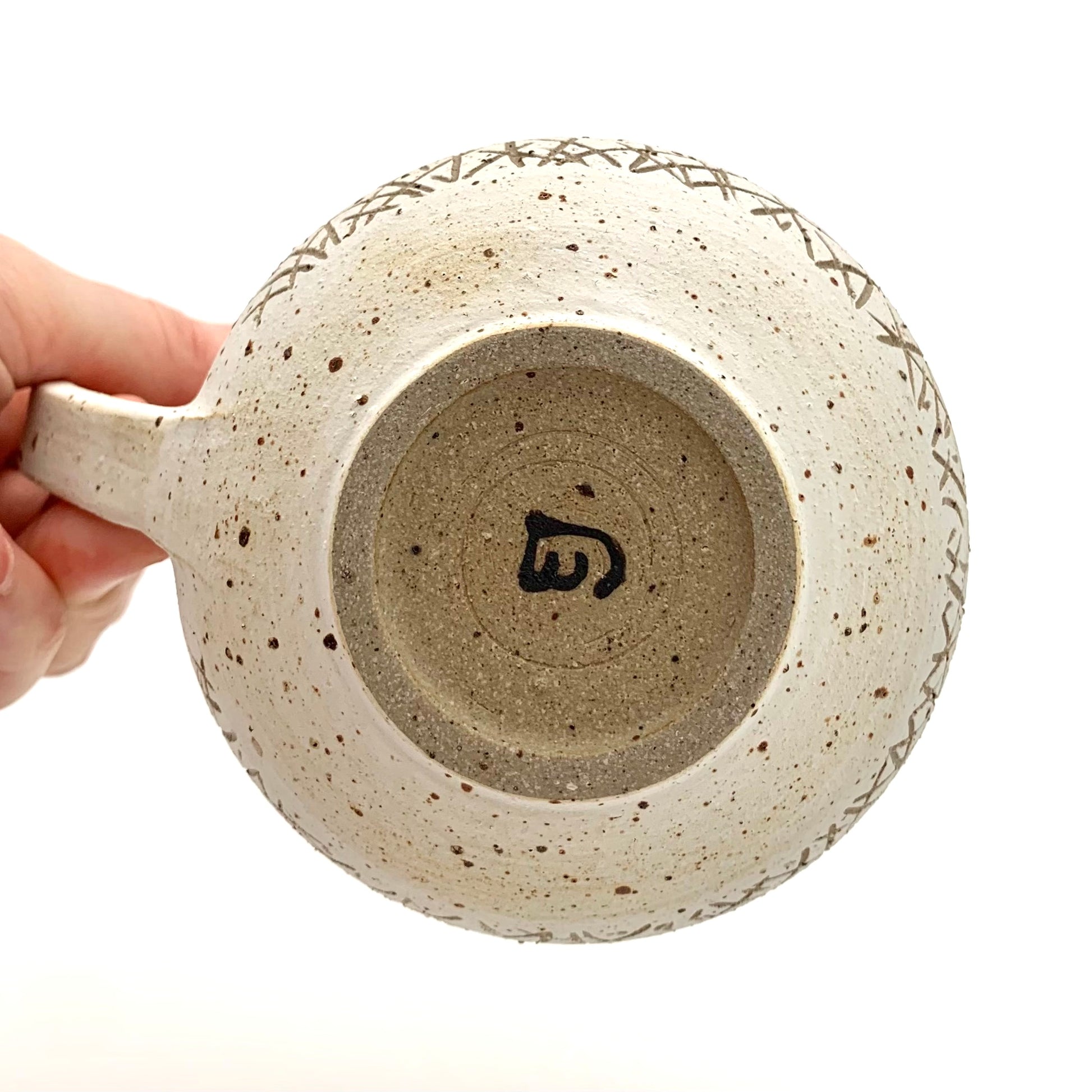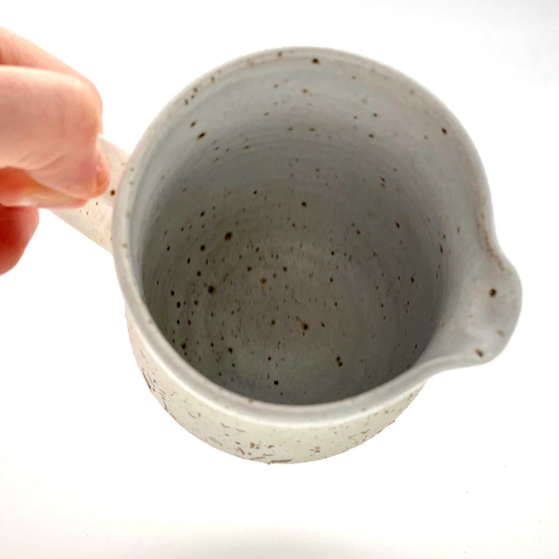 A beautiful jug by Judit Esztergomi. Wheel-thrown and hand-carved this jug is made of stoneware clay, with a speckled, white satin glaze inside. Decorated with underglazes and a sgraffito meadow pattern. The outside is unglazed, which allows for the grittiness and texture of the clay to be felt.